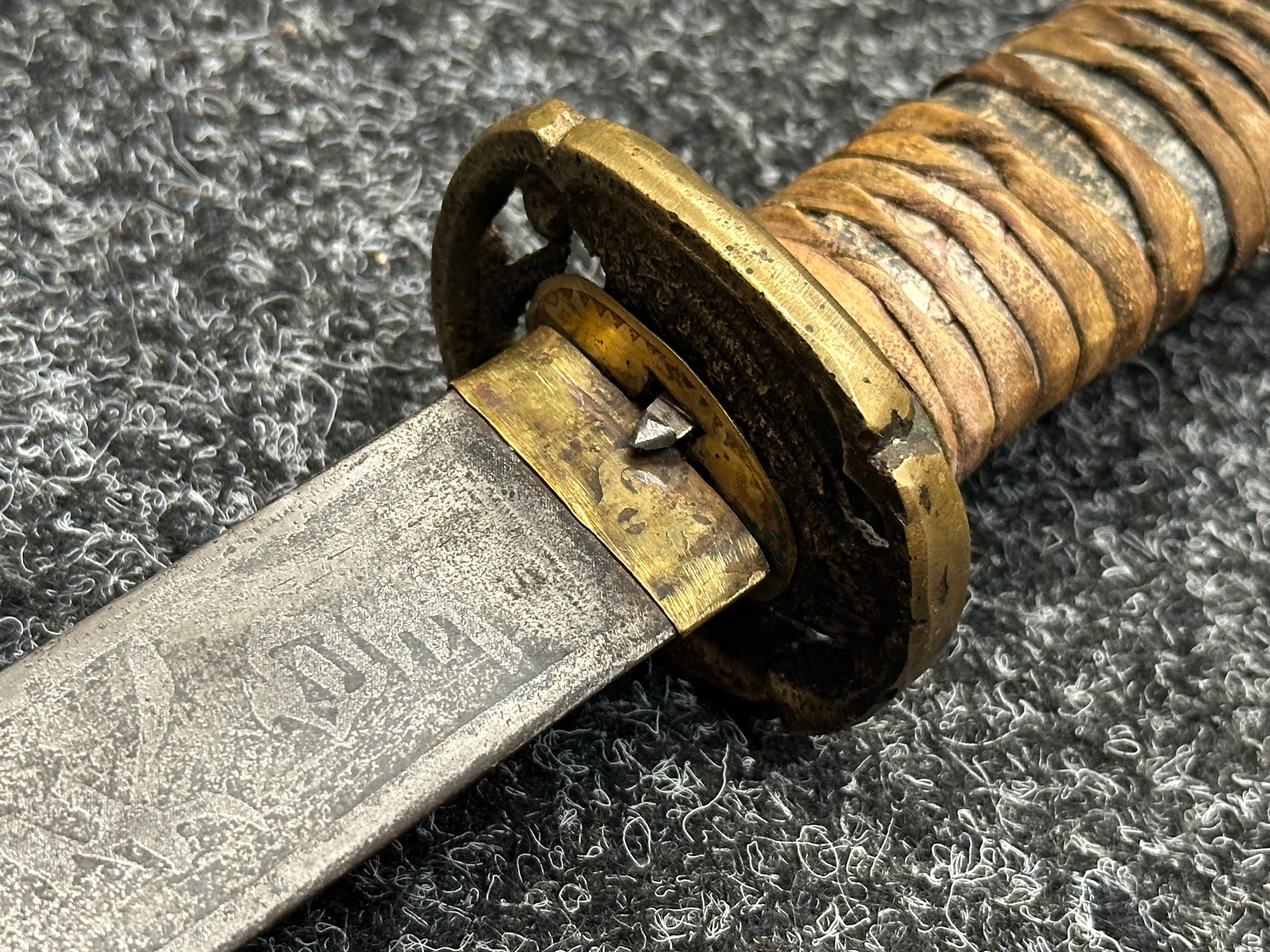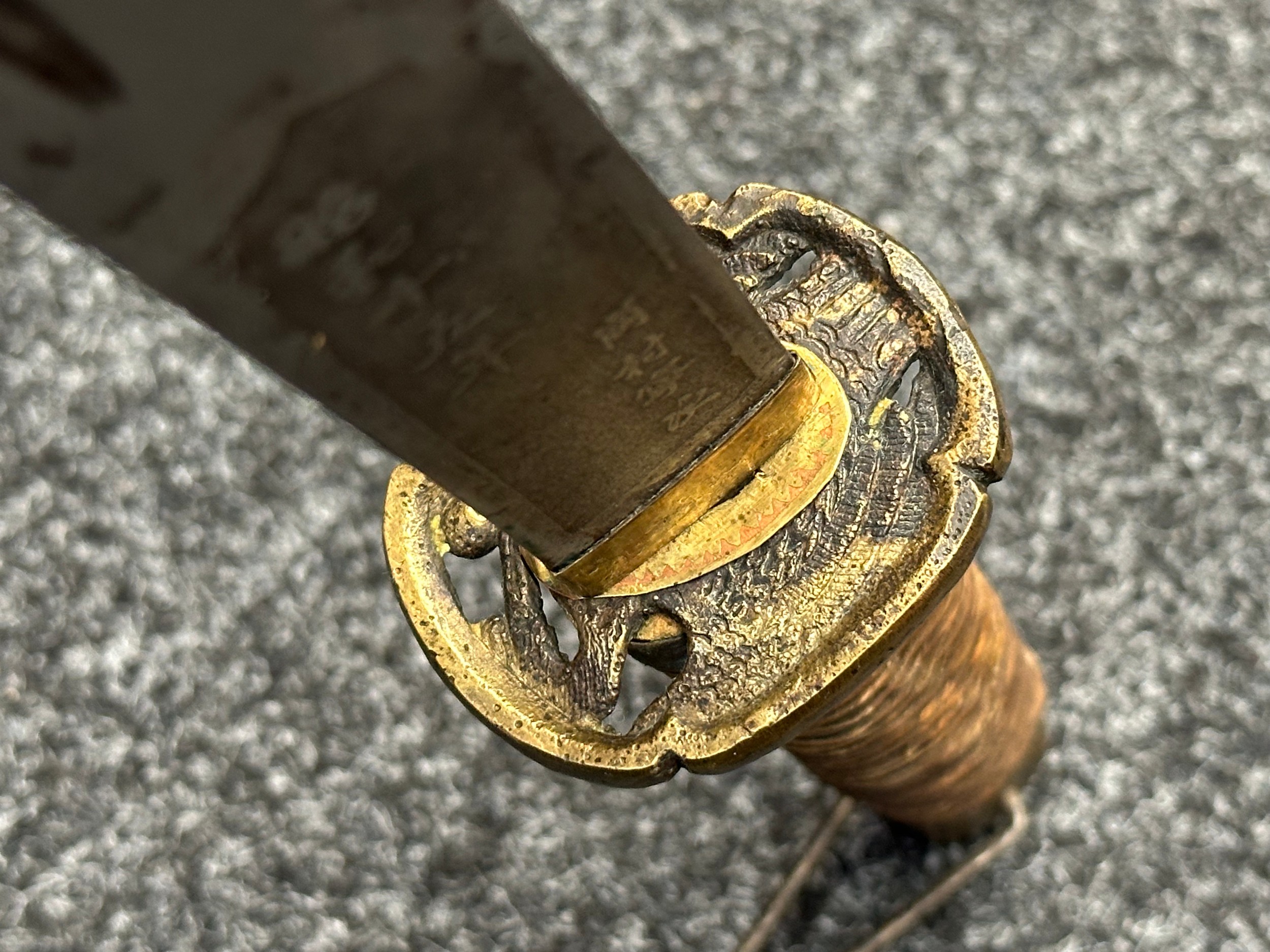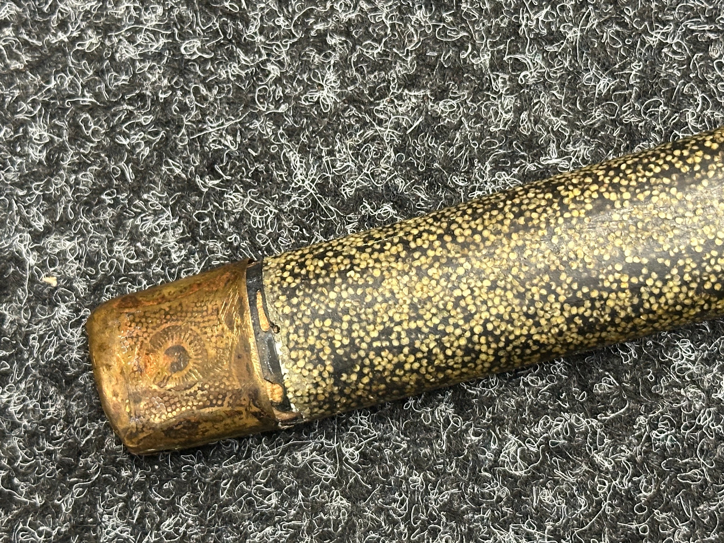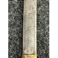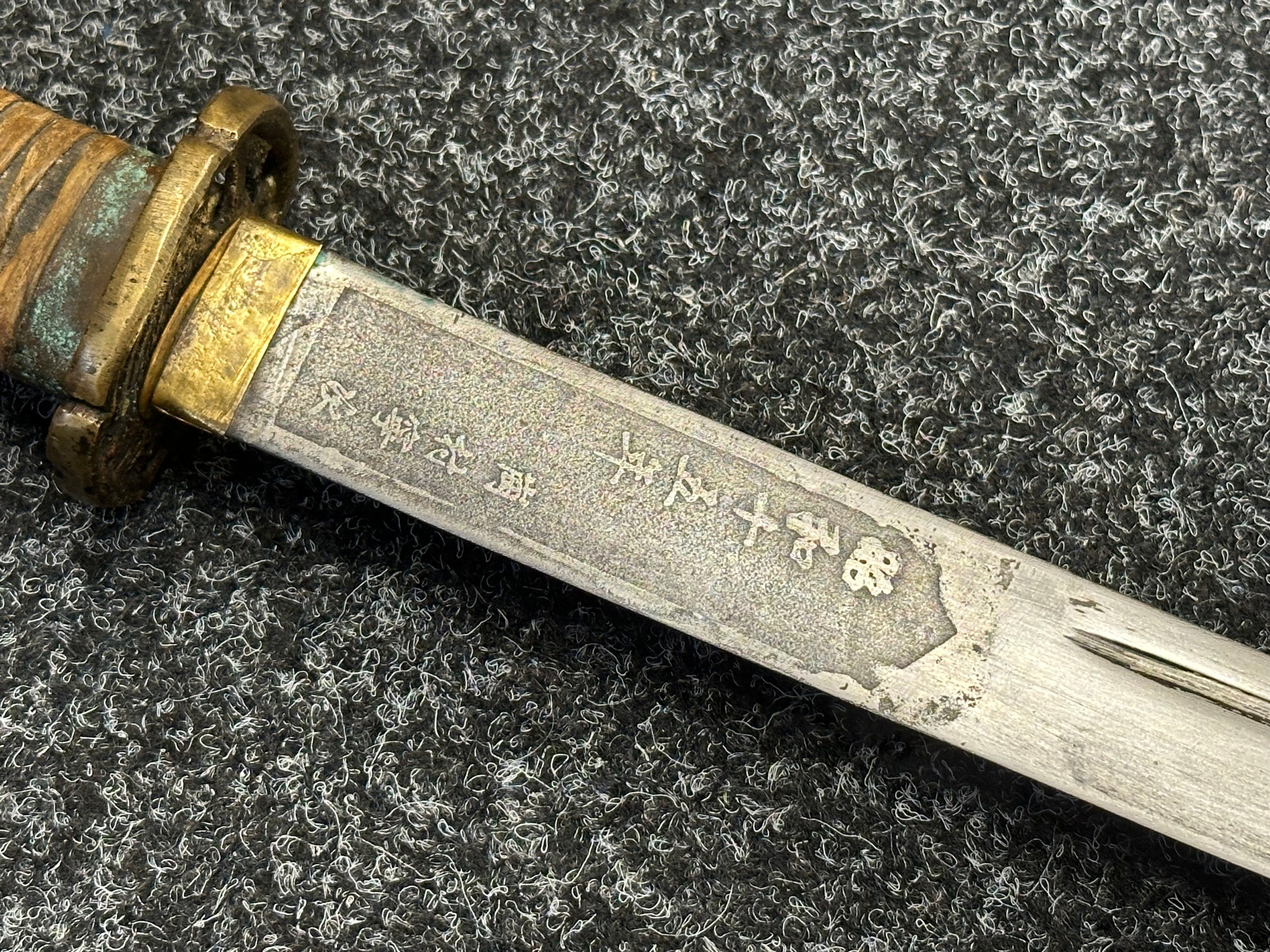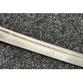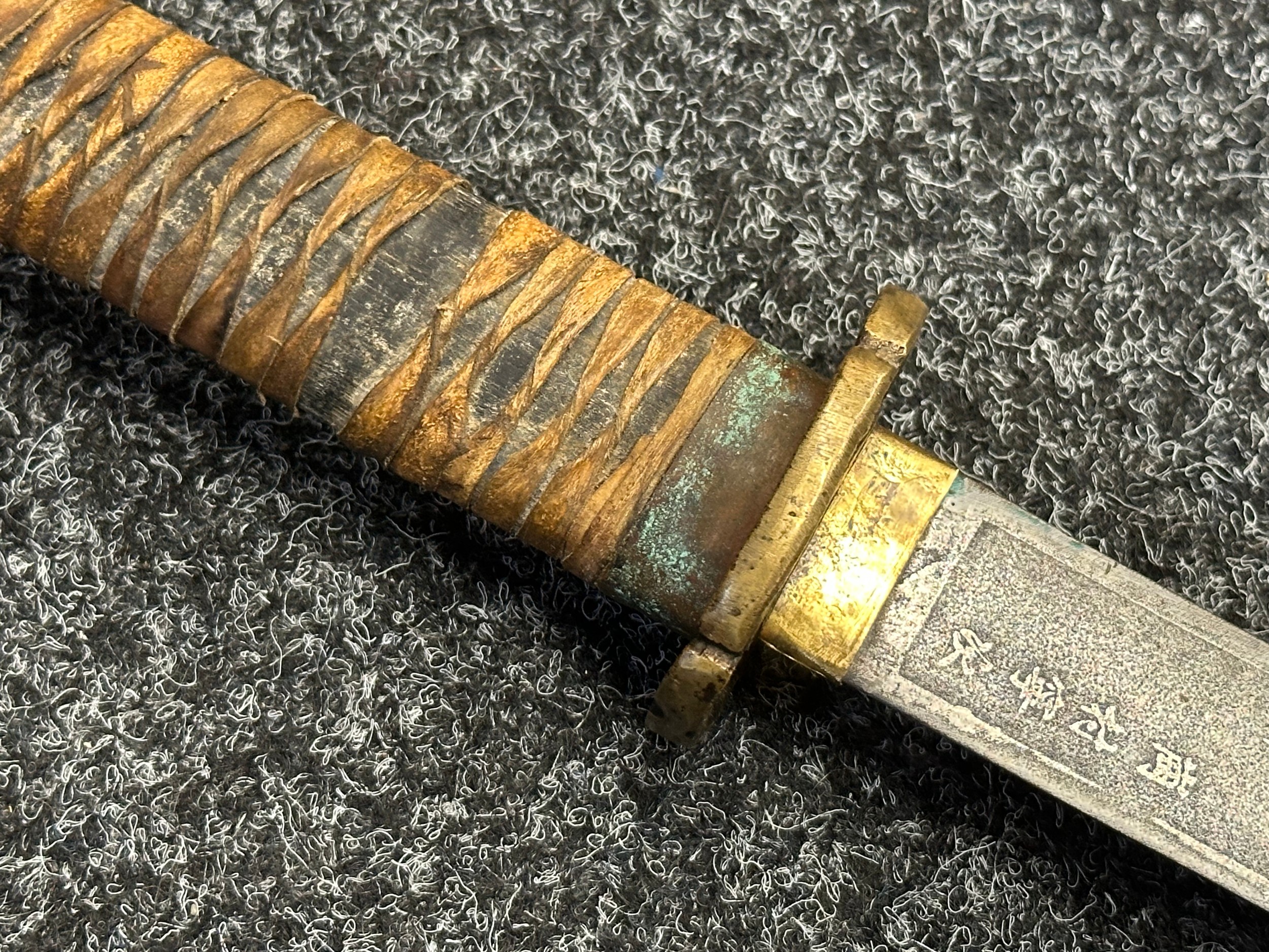 Chinese Sword with single edged fullered blade 690mm in length with etched decoration of Nationalist Chinese Flag along with Chinese letters. Cast brass guard. Rawhide leather bound wooden grip. Overall length 925mm. Complete with wooden scabbard with fish skin covering and brass fittings.