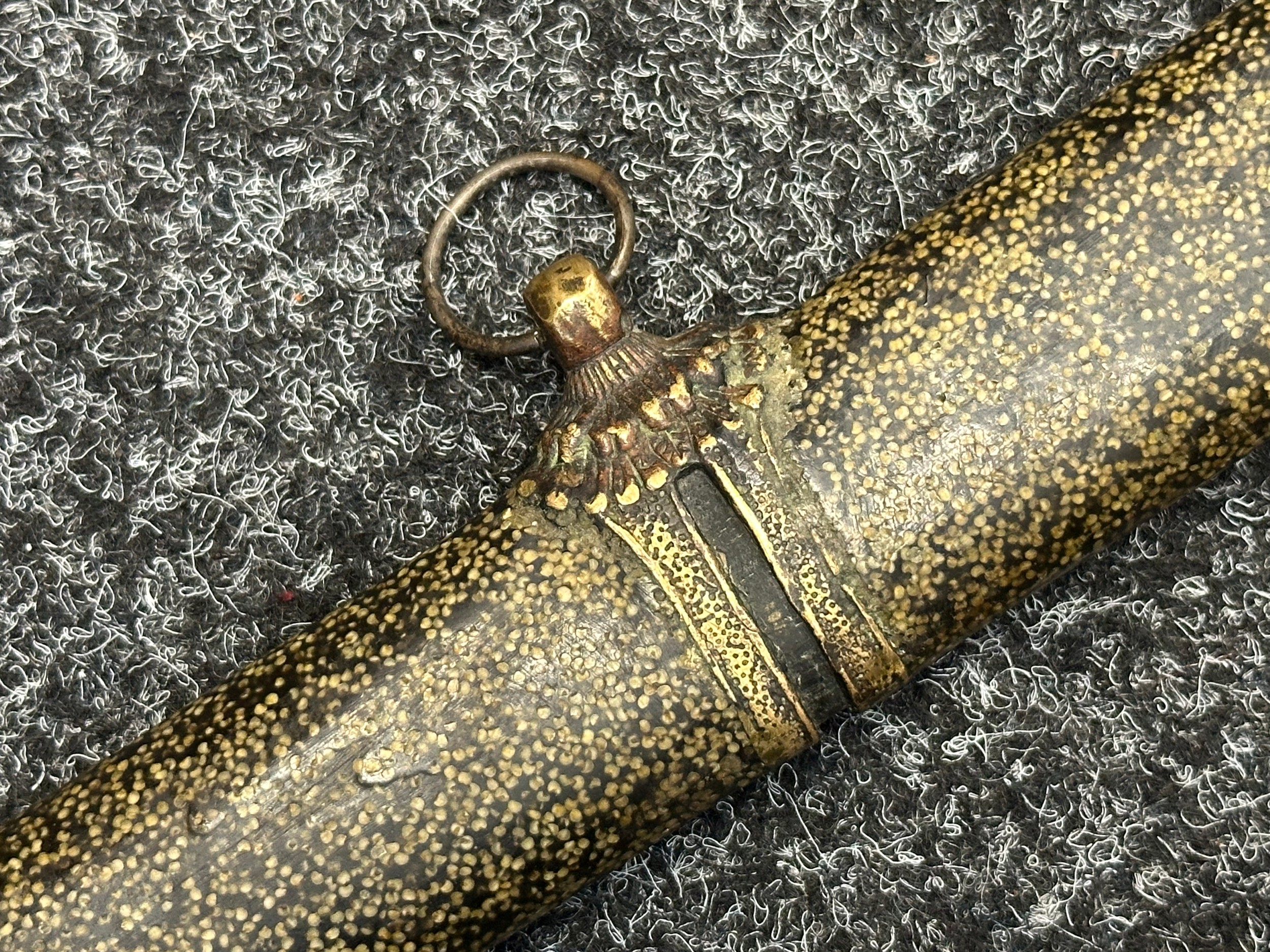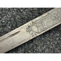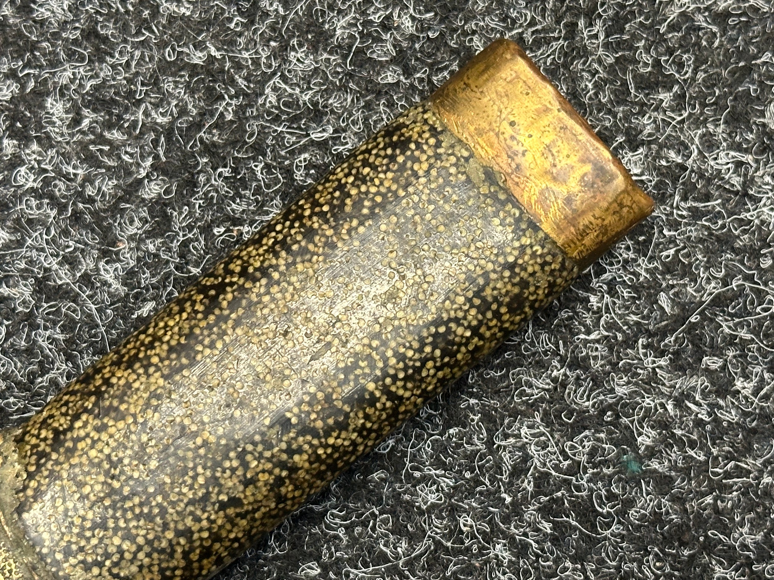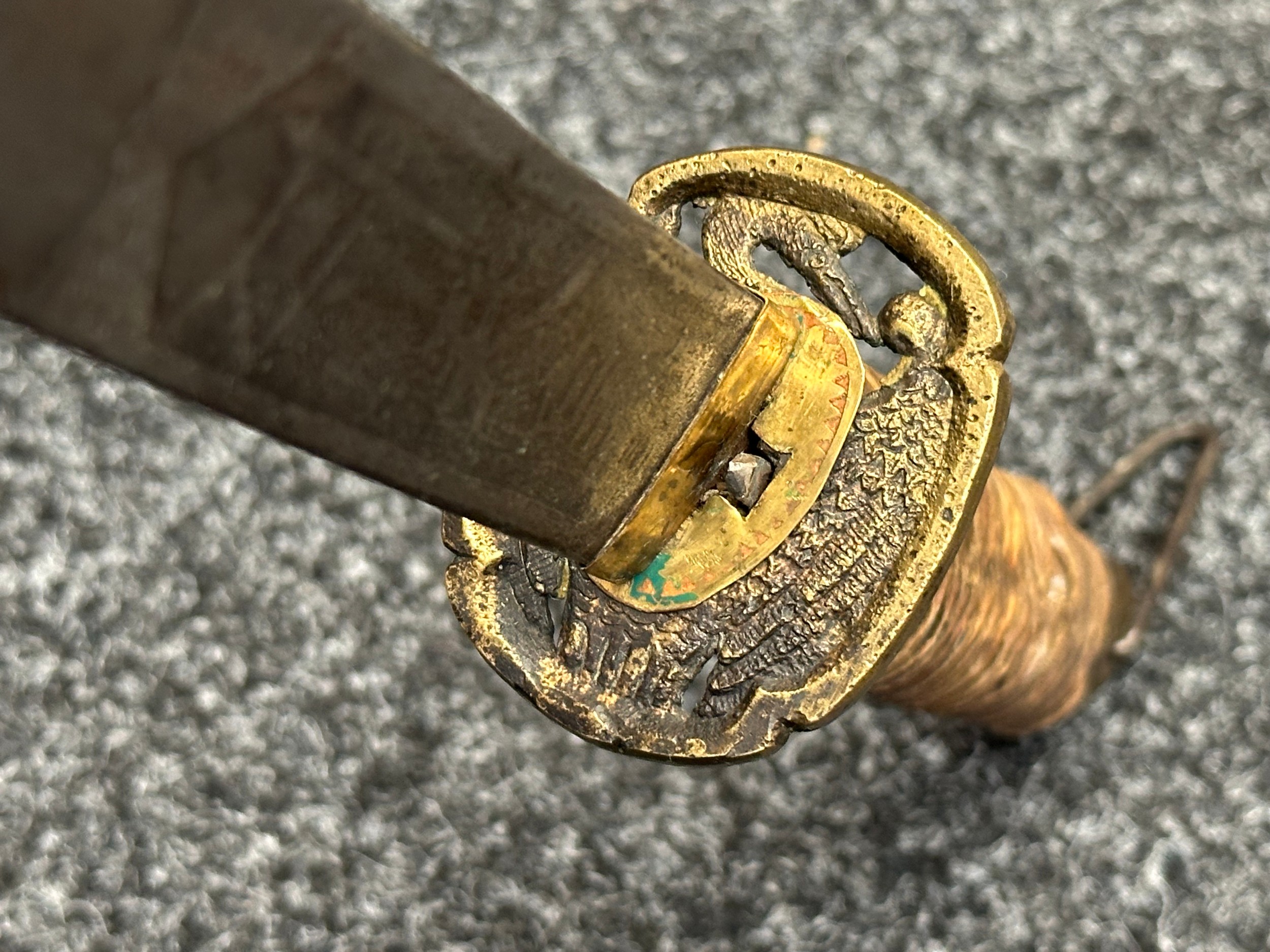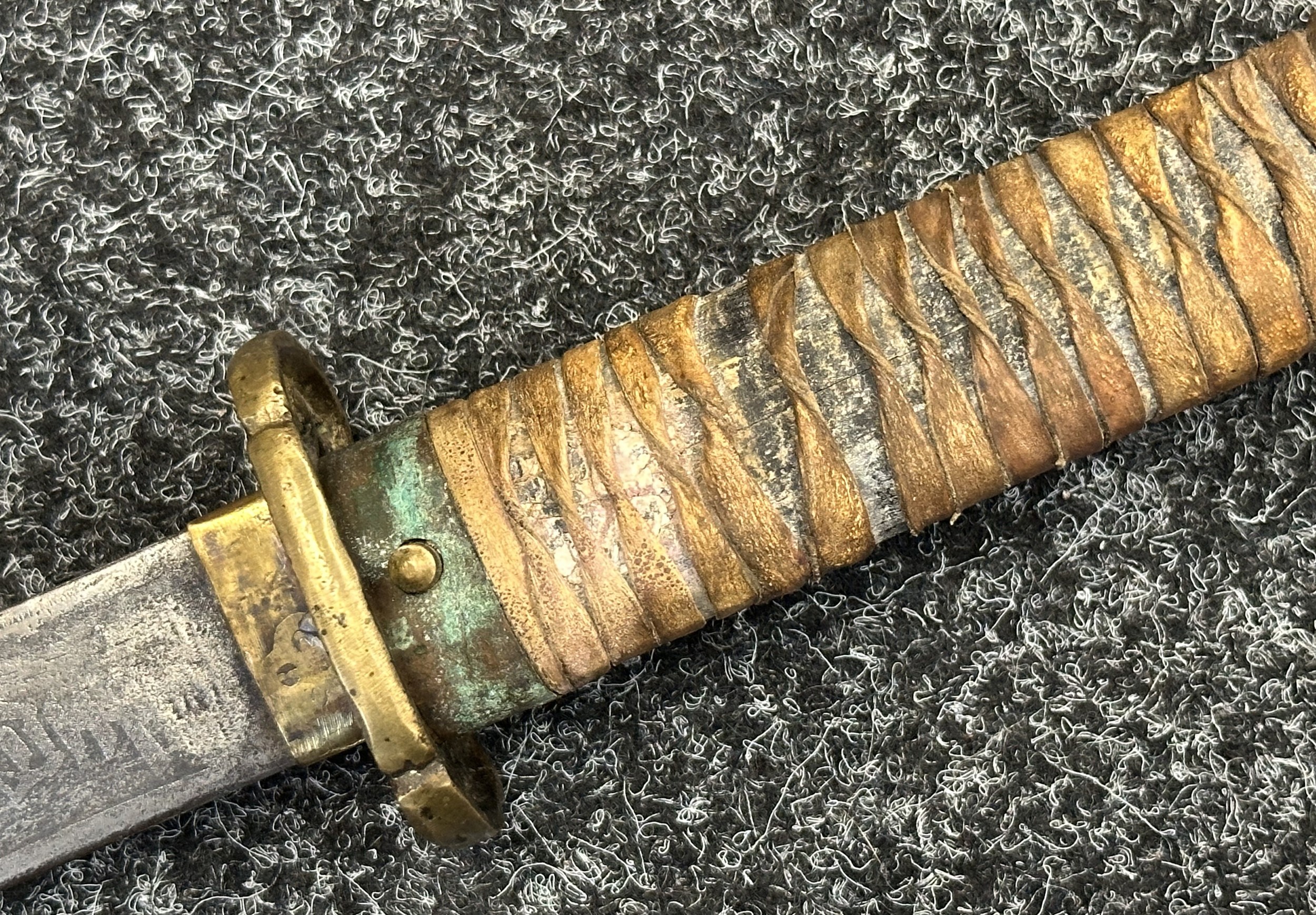Chinese Sword with single edged fullered blade 690mm in length with etched decoration of Nationalist Chinese Flag along with Chinese letters. Cast brass guard. Rawhide leather bound wooden grip. Overall length 925mm. Complete with wooden scabbard with fish skin covering and brass fittings.
