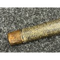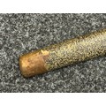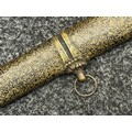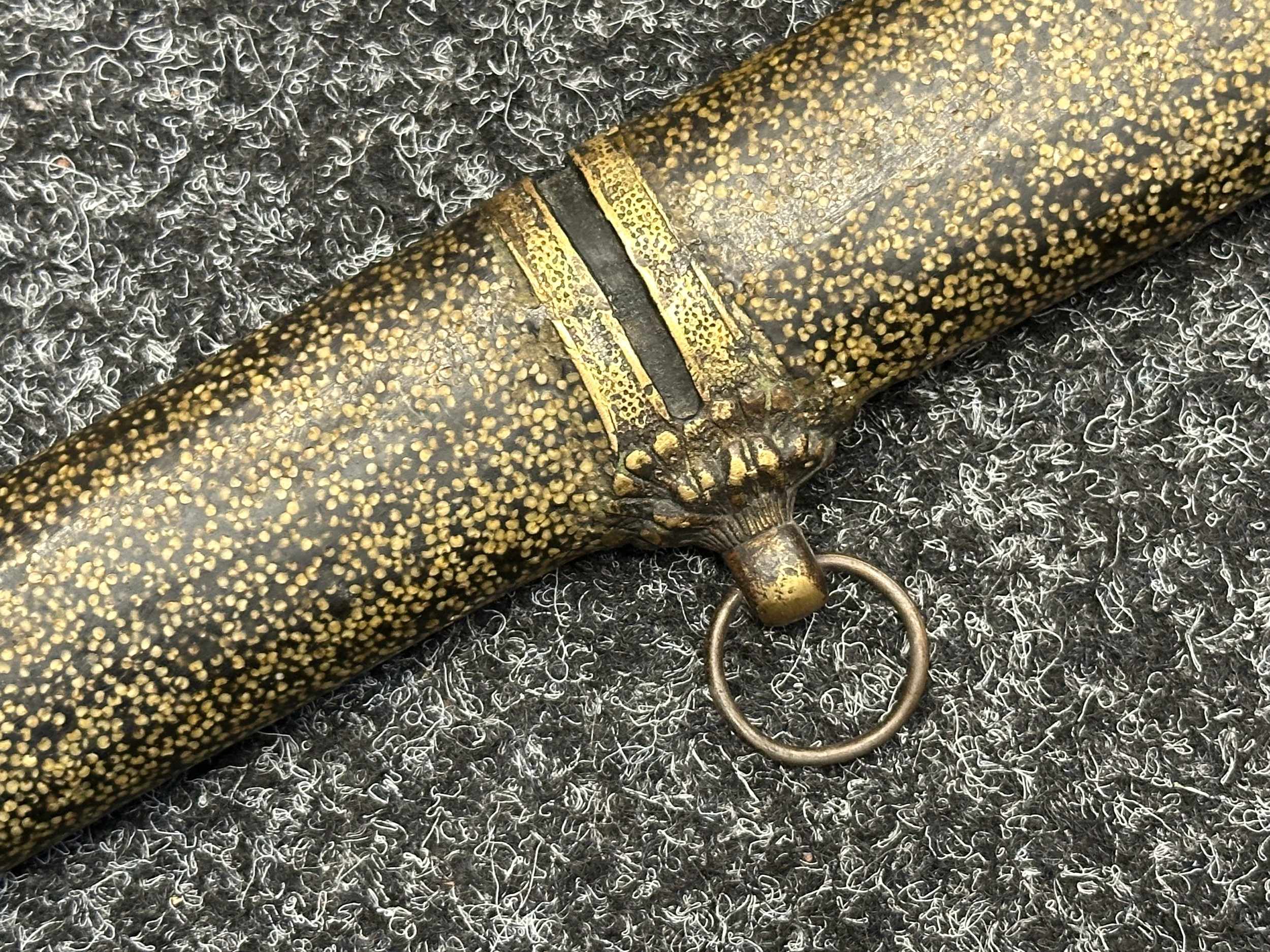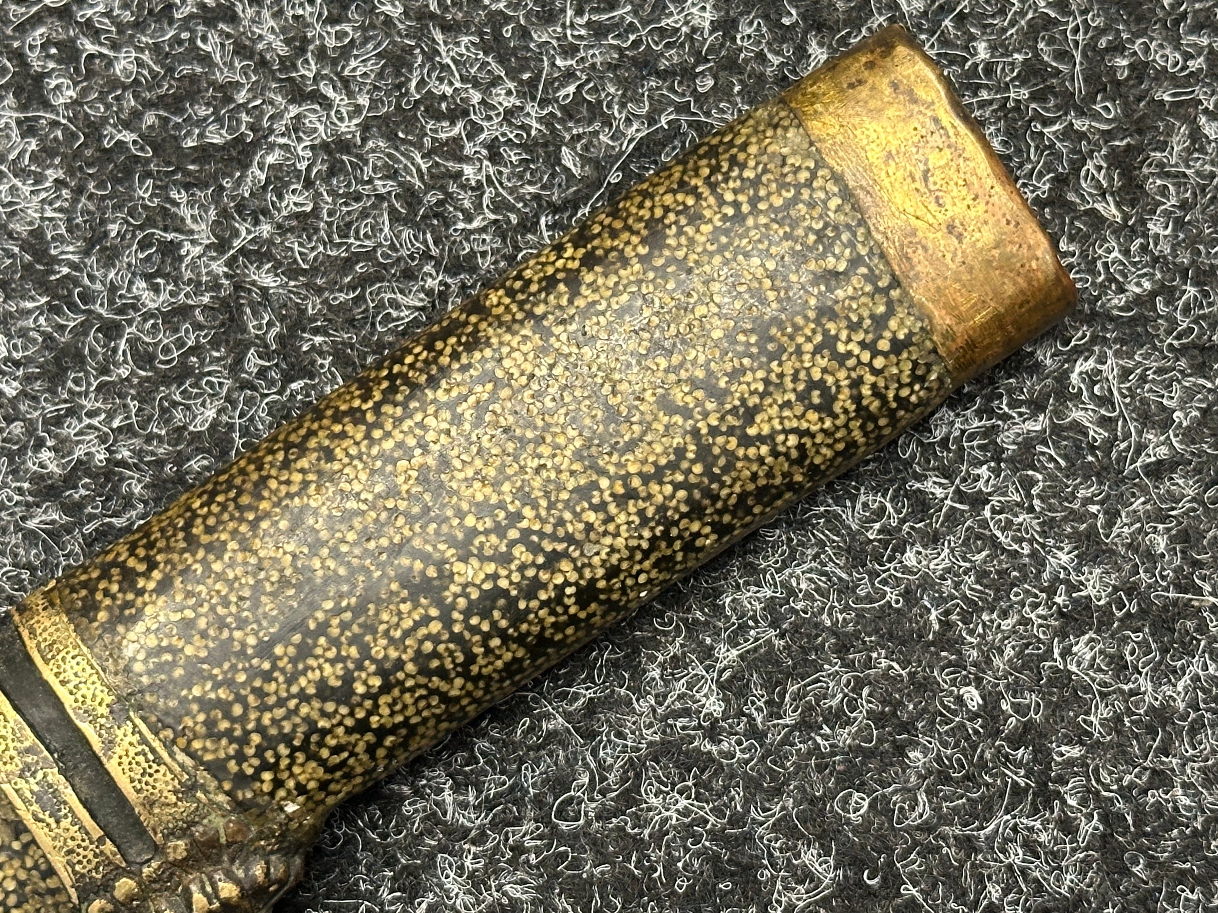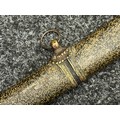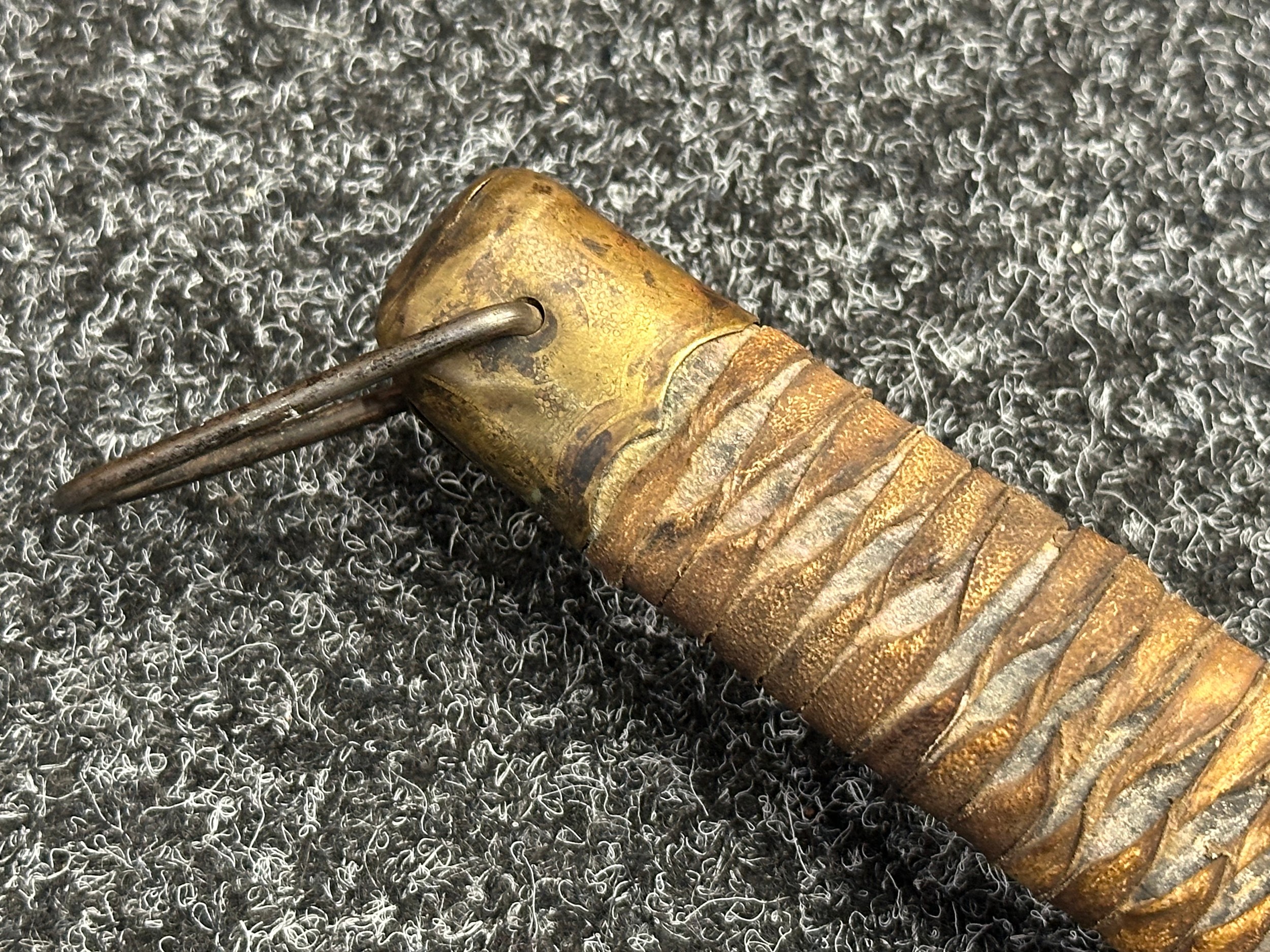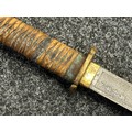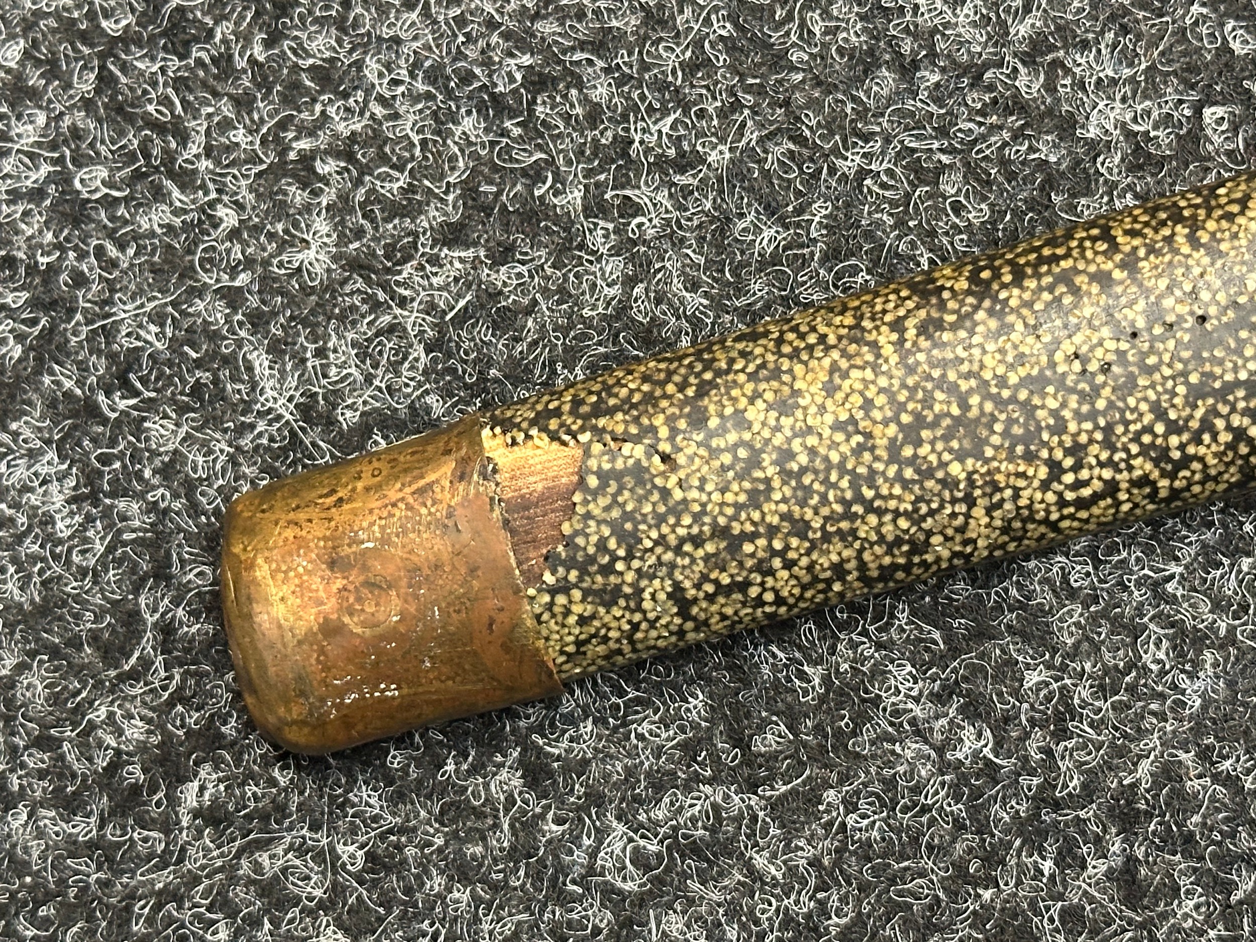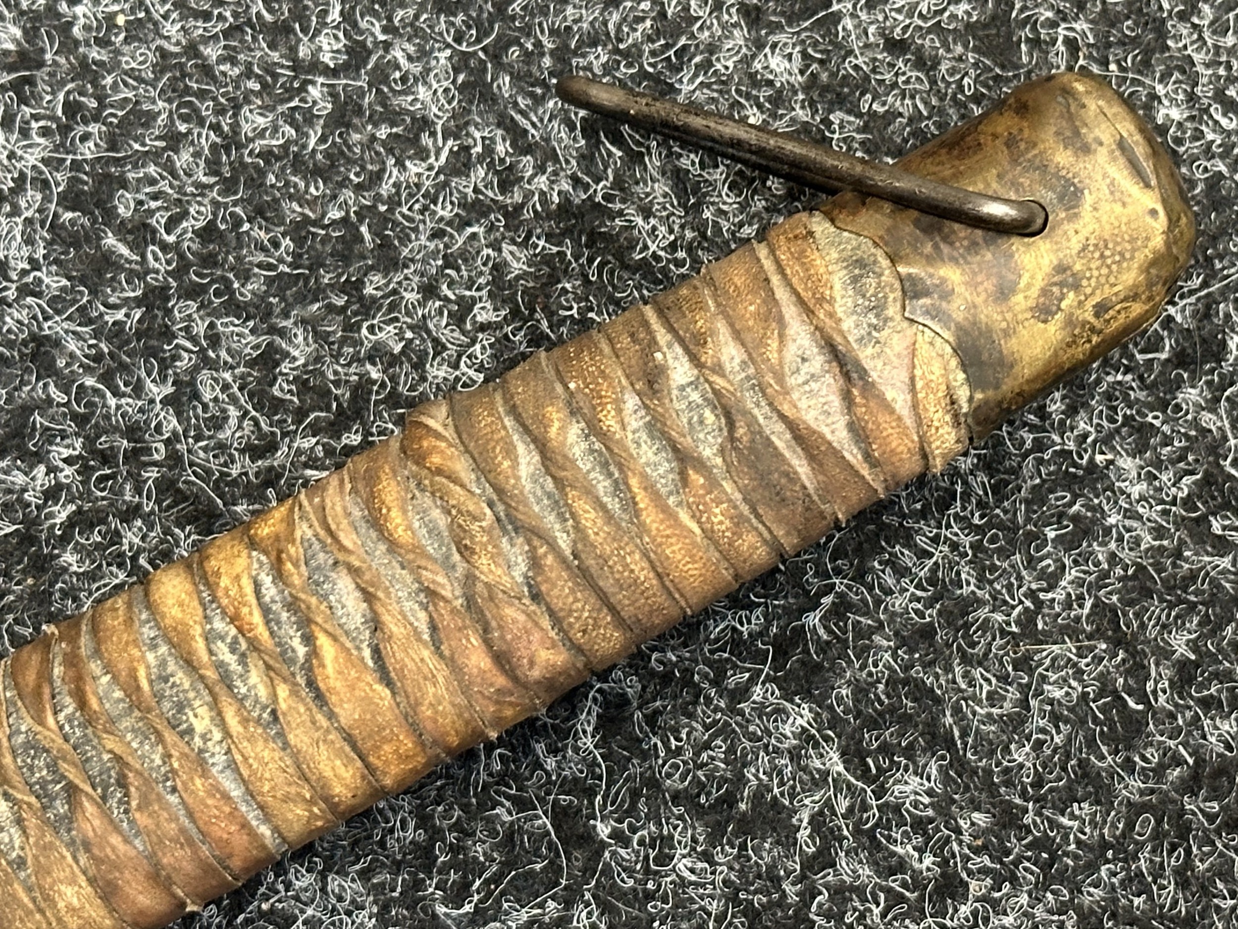 Chinese Sword with single edged fullered blade 690mm in length with etched decoration of Nationalist Chinese Flag along with Chinese letters. Cast brass guard. Rawhide leather bound wooden grip. Overall length 925mm. Complete with wooden scabbard with fish skin covering and brass fittings.