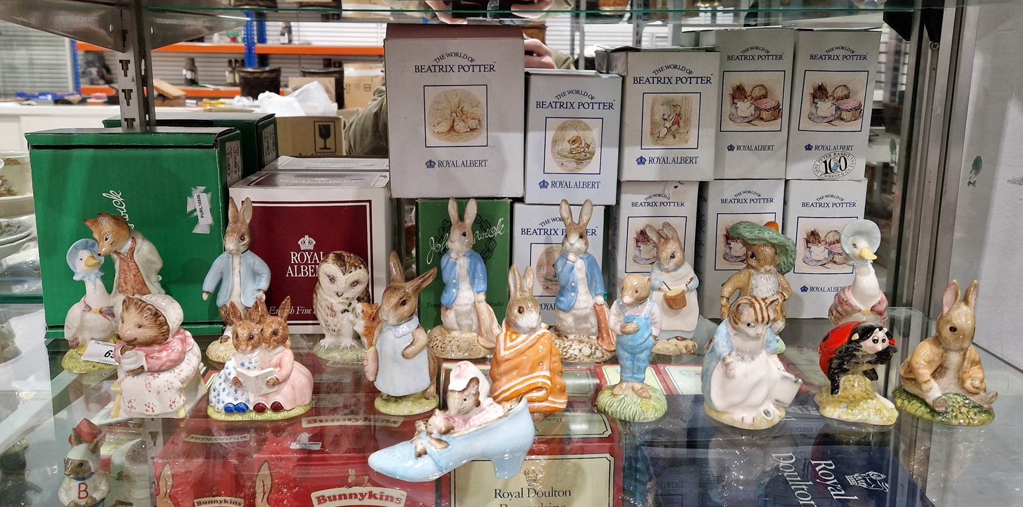 Collection of Royal Albert and Beswick Beatrix Potter figures including the Old Woman Who Lives in a Shoe, Mother Ladybird, Benjamin Bunny, Bunnykins Storytime, Old Mr Brown, Peter Rabbit Digging, Mrs Tiggywinkle Making Tea, Joanna Puddleduck with a Foxy Whiskered Gentleman, with 12 boxes (17)
