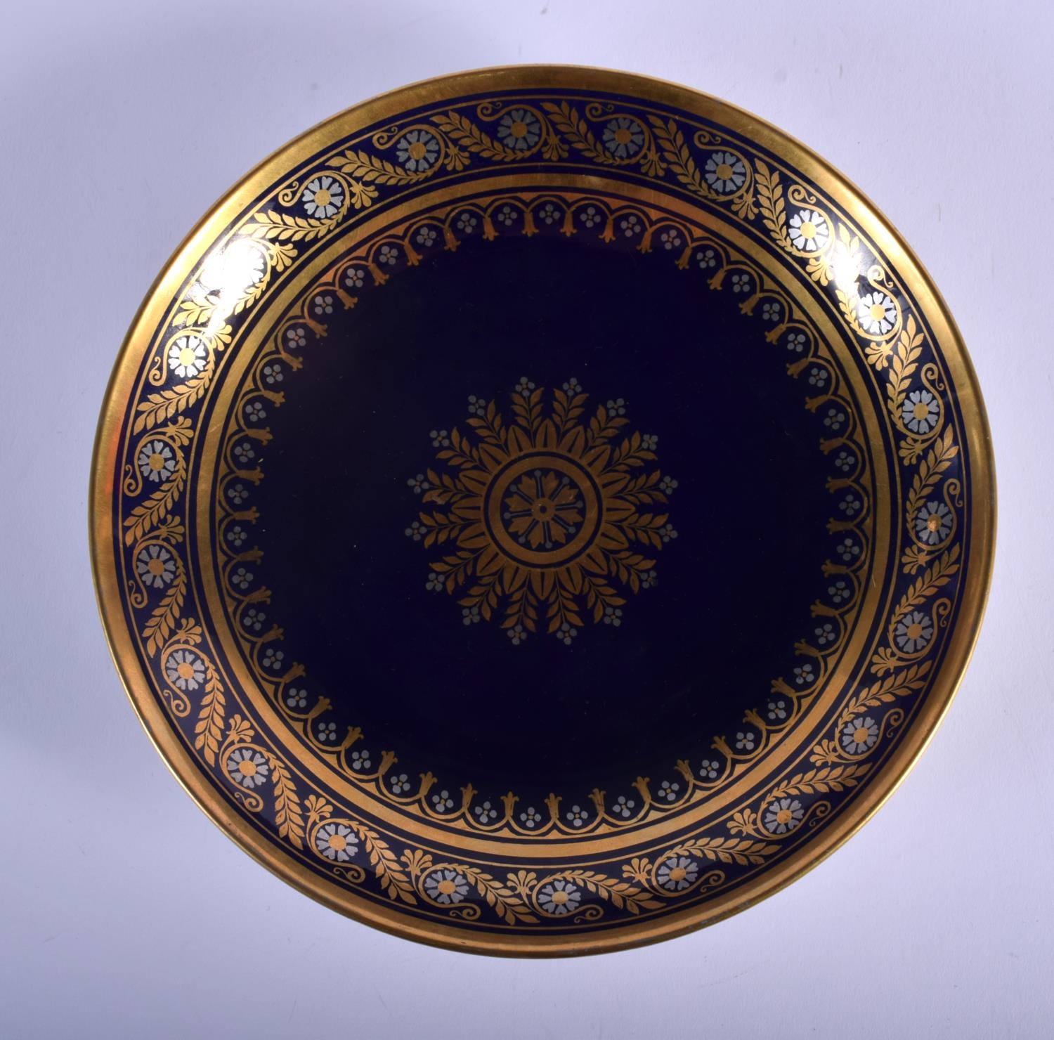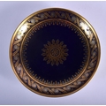 19TH C. SEVRES CIRCULAR DISH DECORATED INGOLD AND PLATINUM ON A DEEP BLUE GROUND. 17.5cm diameter