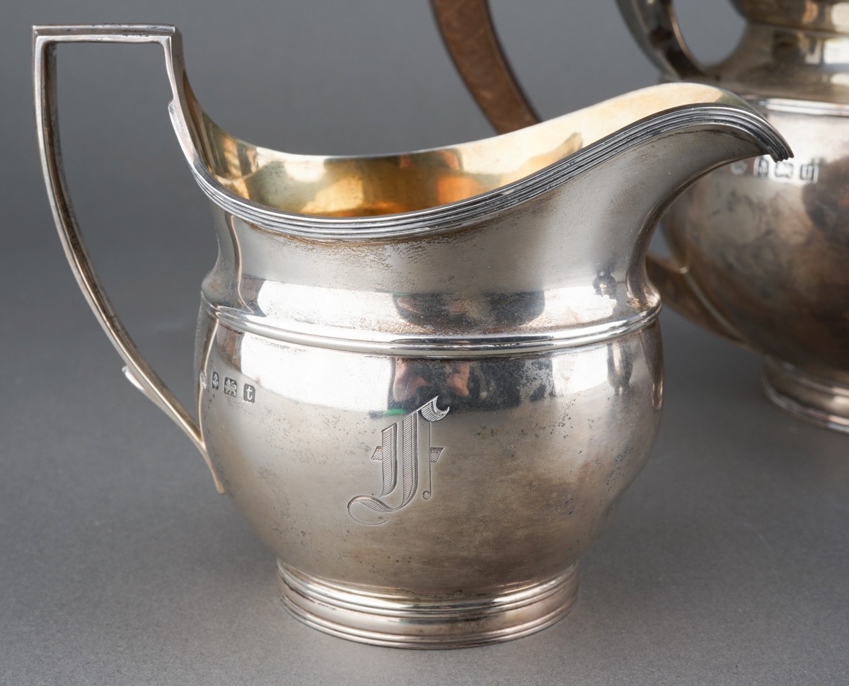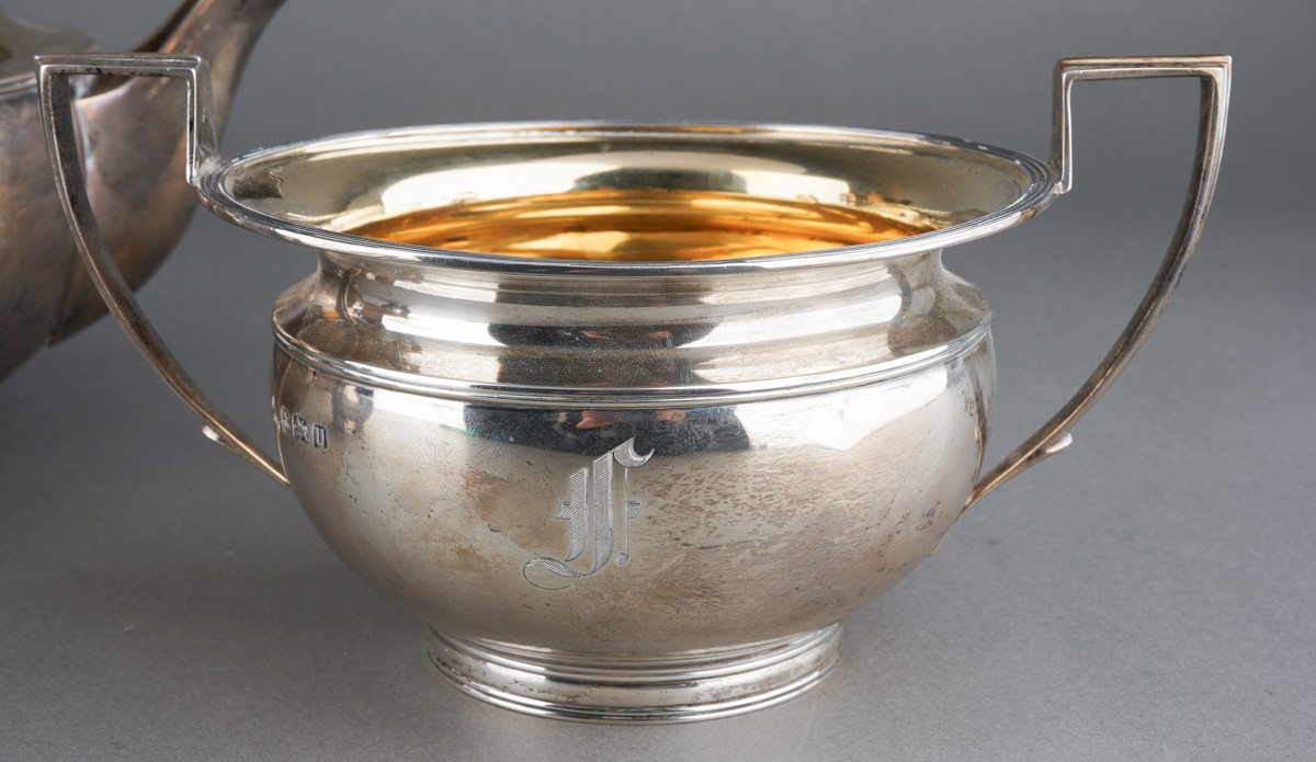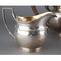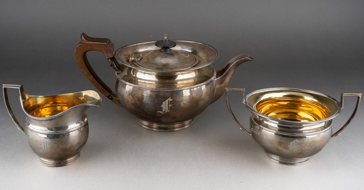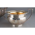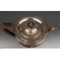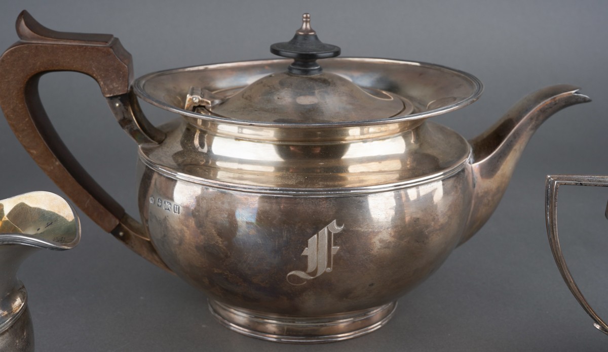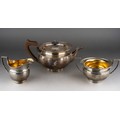 A George V silver teaset comprising teapot with fruitwood handle and finial, milk jug and sugar bowl, melon shaped with flared rim, engraved with initial F., by Elkington & Co., Birmingham, 1928 & 29., stamped to underside, gross weight approx 1082.3 grams [3]