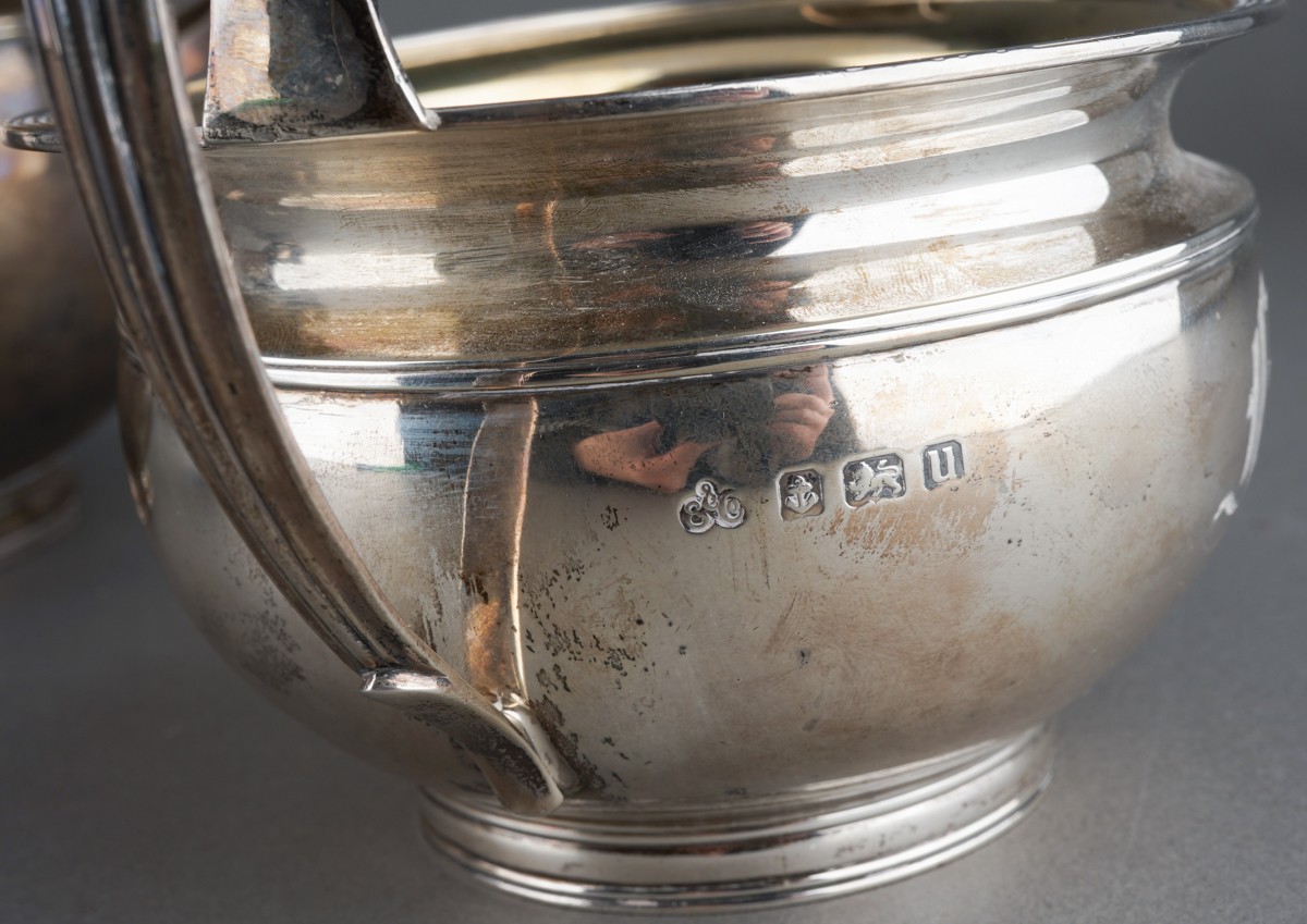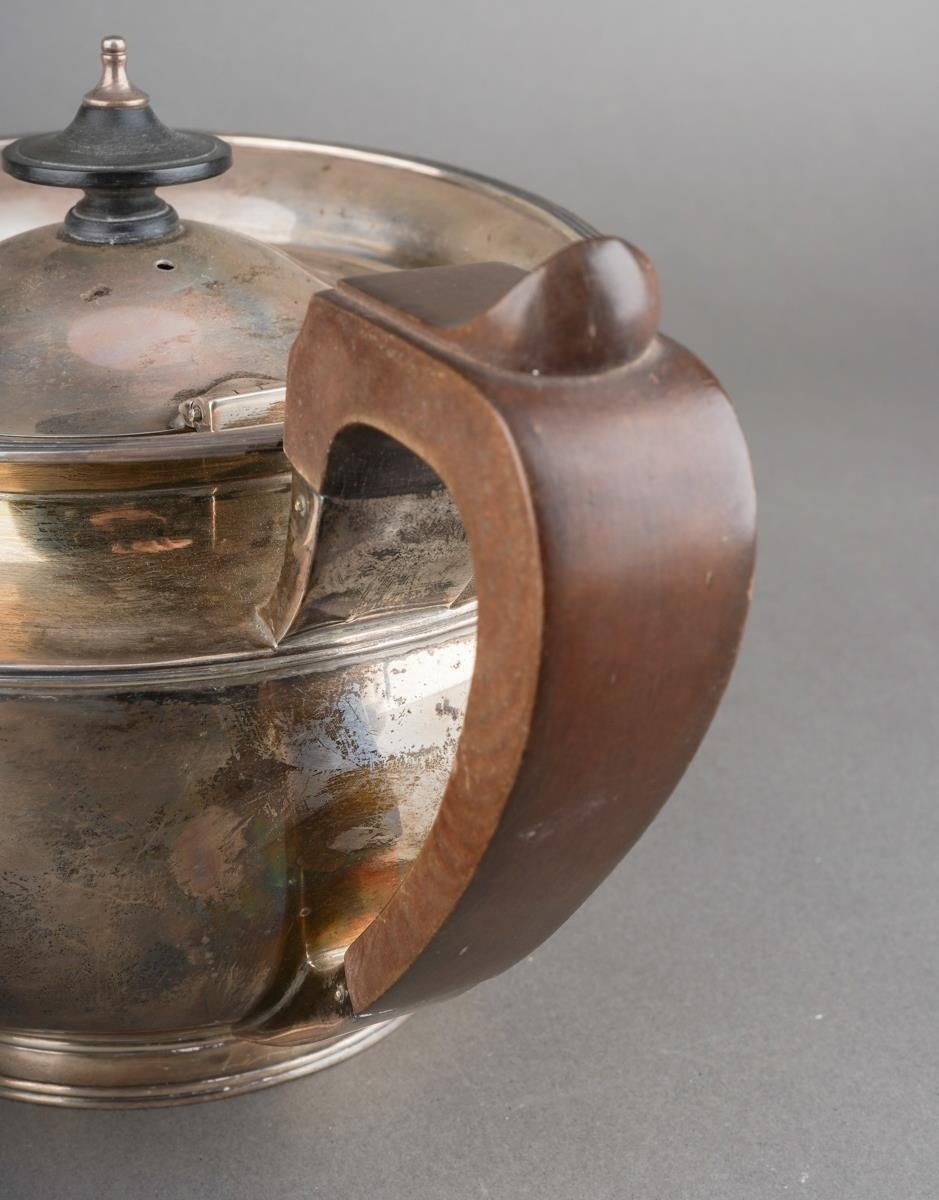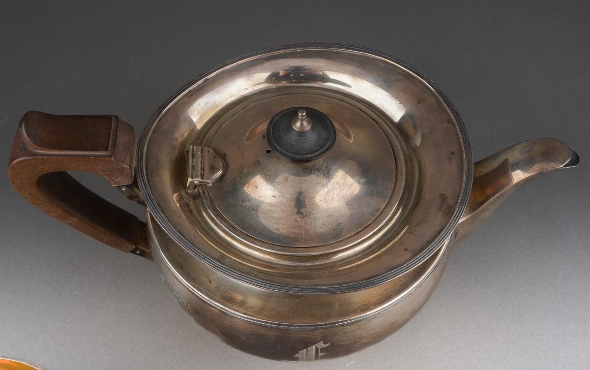 A George V silver teaset comprising teapot with fruitwood handle and finial, milk jug and sugar bowl, melon shaped with flared rim, engraved with initial F., by Elkington & Co., Birmingham, 1928 & 29., stamped to underside, gross weight approx 1082.3 grams [3]