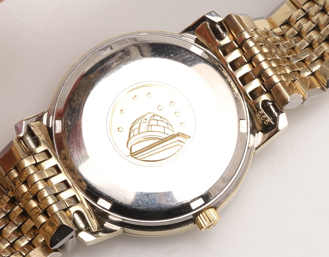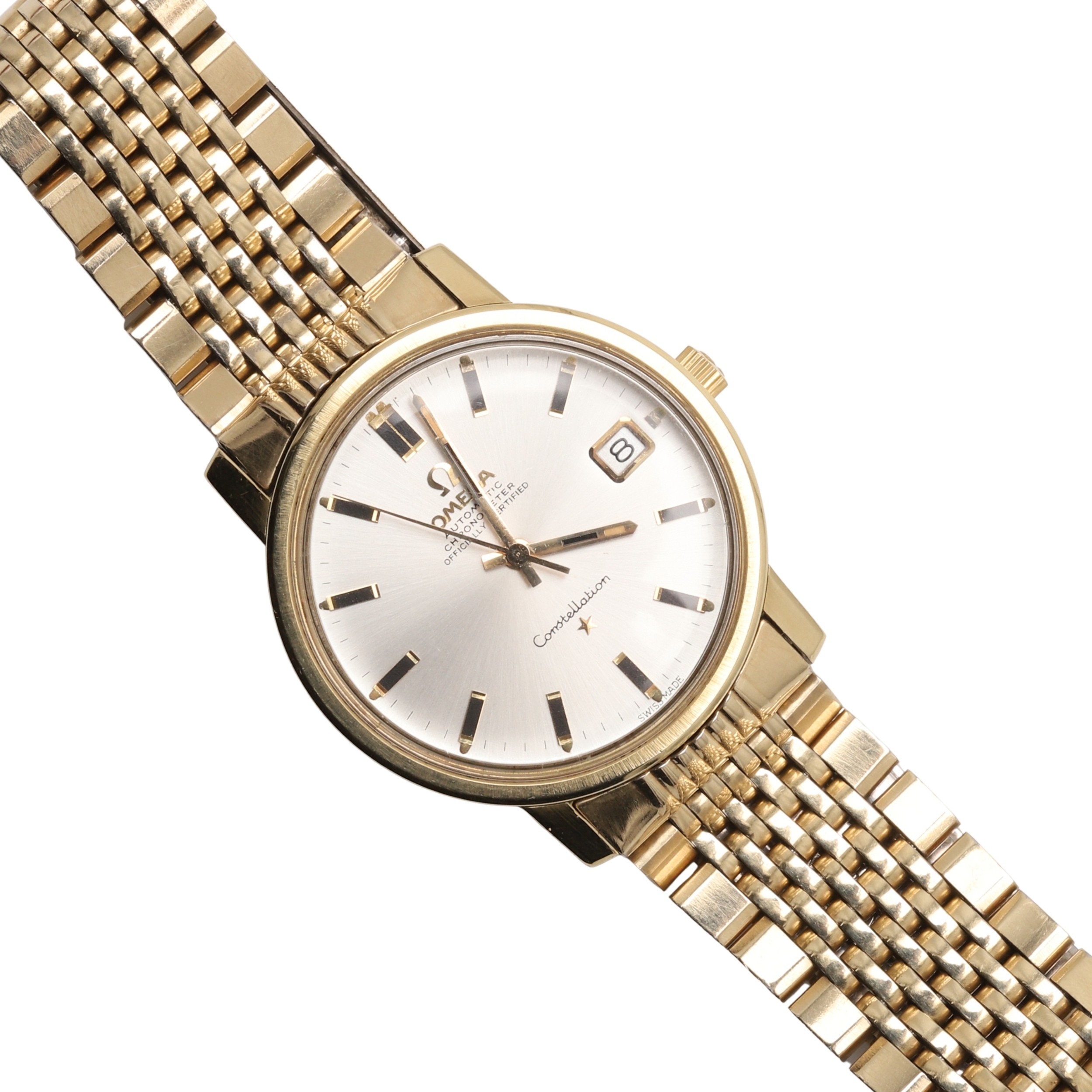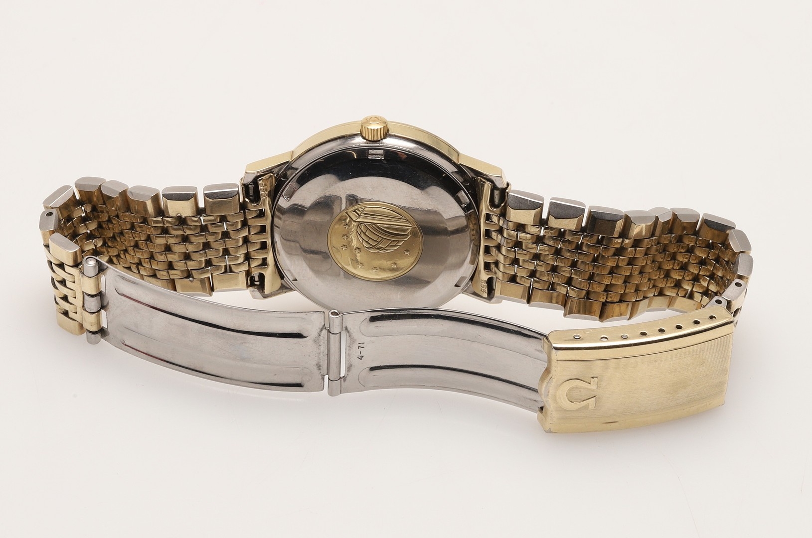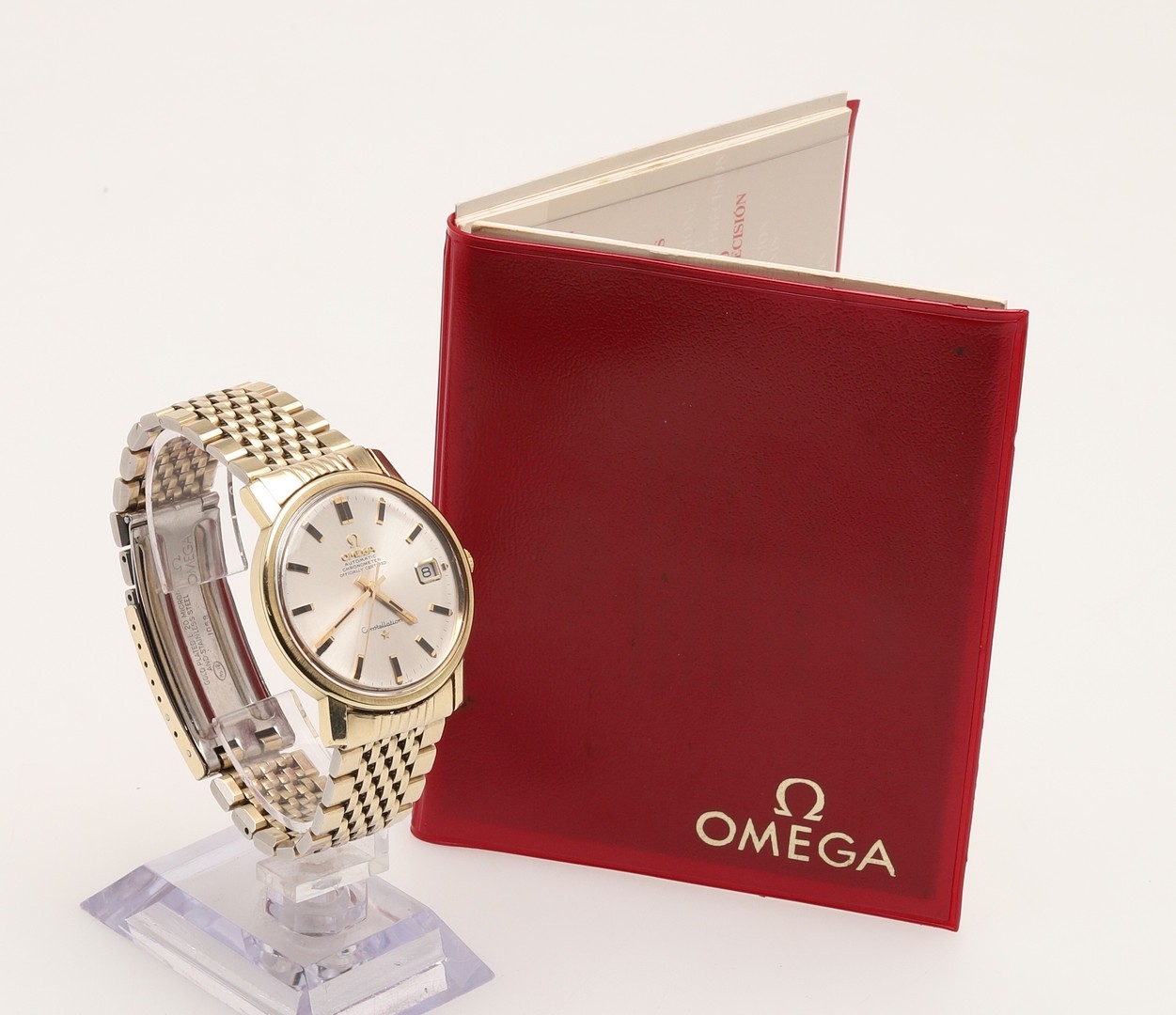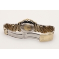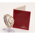 A GENTLEMAN'S STAINLESS STEEL AND GOLD PLATED AUTOMATIC CONSTELLATION WRISTWATCH BY OMEGA. the signed circular dial with baton numerals and date aperture, with Omega logo to the winder and to the clasp, reference number CD168018, movement number 29358556, on an Omega bracelet with deployant clasp, with Omega guarantee and paper work.