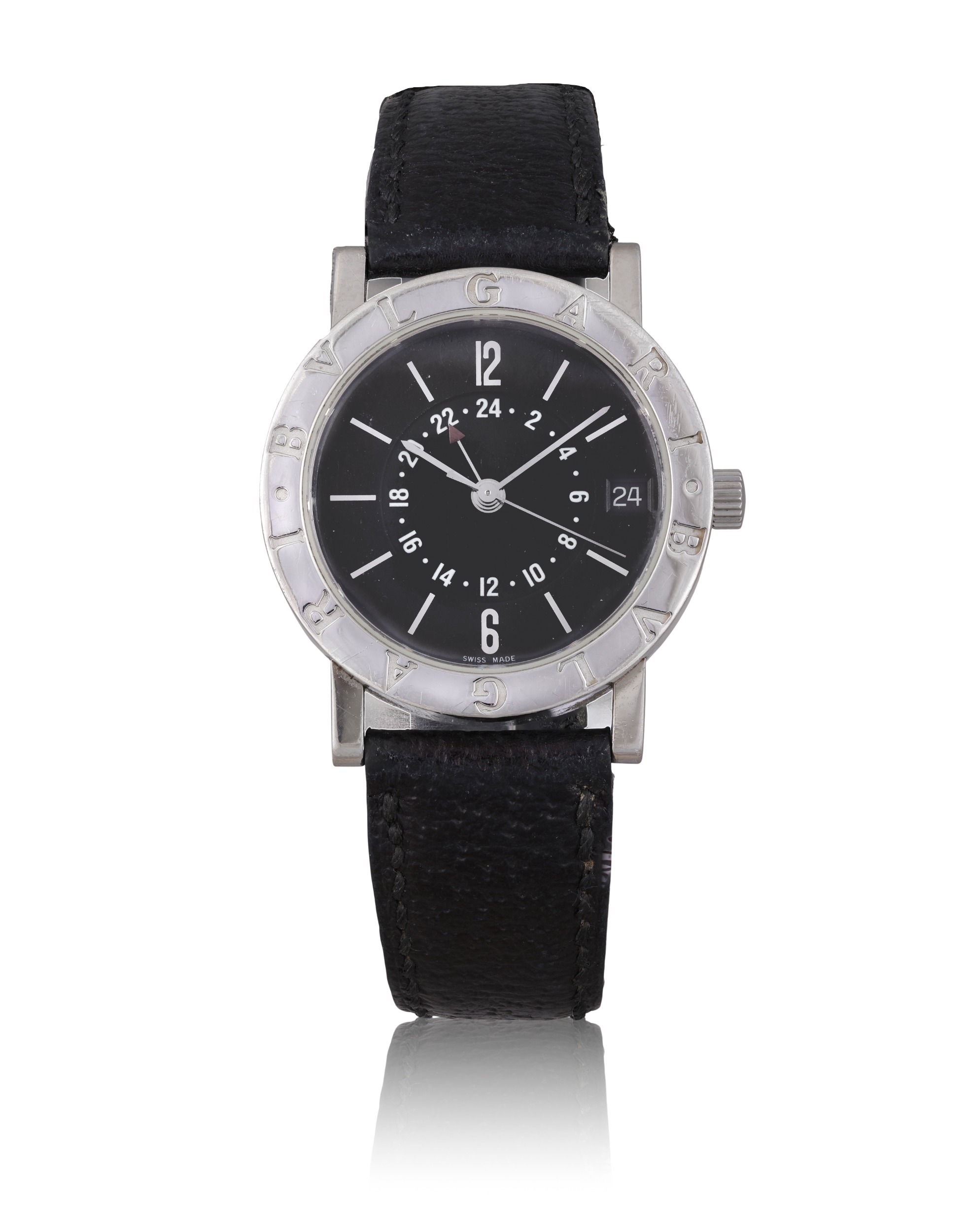 BVLGARI GMT "BB33" WRISTWATCH, AUTOMATIC A contemporary and functional automatic wristwatch by Bvlgari, featuring a dual-time display within the iconic engraved bezel case. Year: Circa 2000s Dial: Black dial with baton hour markers, inner 24-hour track with red arrow GMT hand, date aperture at 3 o'clock, central seconds Calibre: Automatic movement, cal. 2993-2, signed Bvlgari Case: Stainless steel case with engraved "BVLGARI BVLGARI" bezel, screw-down caseback, reference BB33 SL GMT, No. L1105 Dimensions: 33 mm diameter Gross Weight: 46.14 g approx. Bracelet/Strap: Black leather strap with stainless steel pin buckle (later, unsigned Bvlgari) Signature: Dial and movement signed