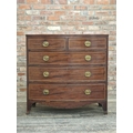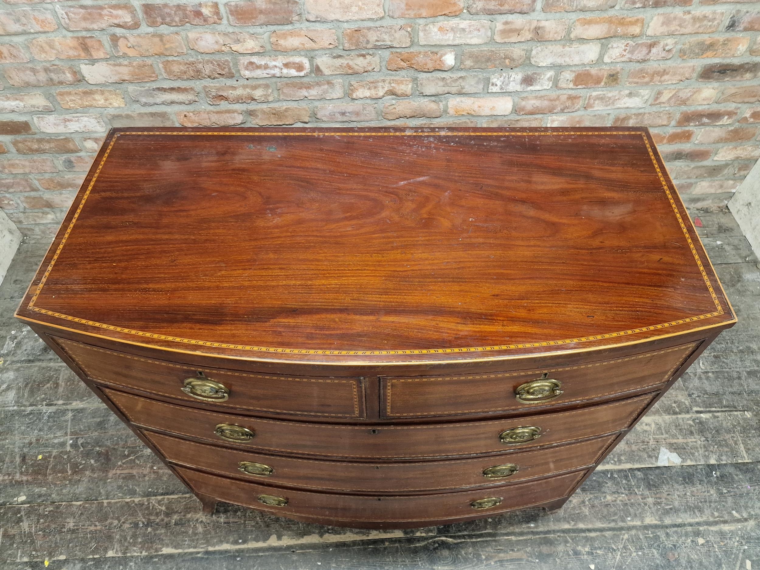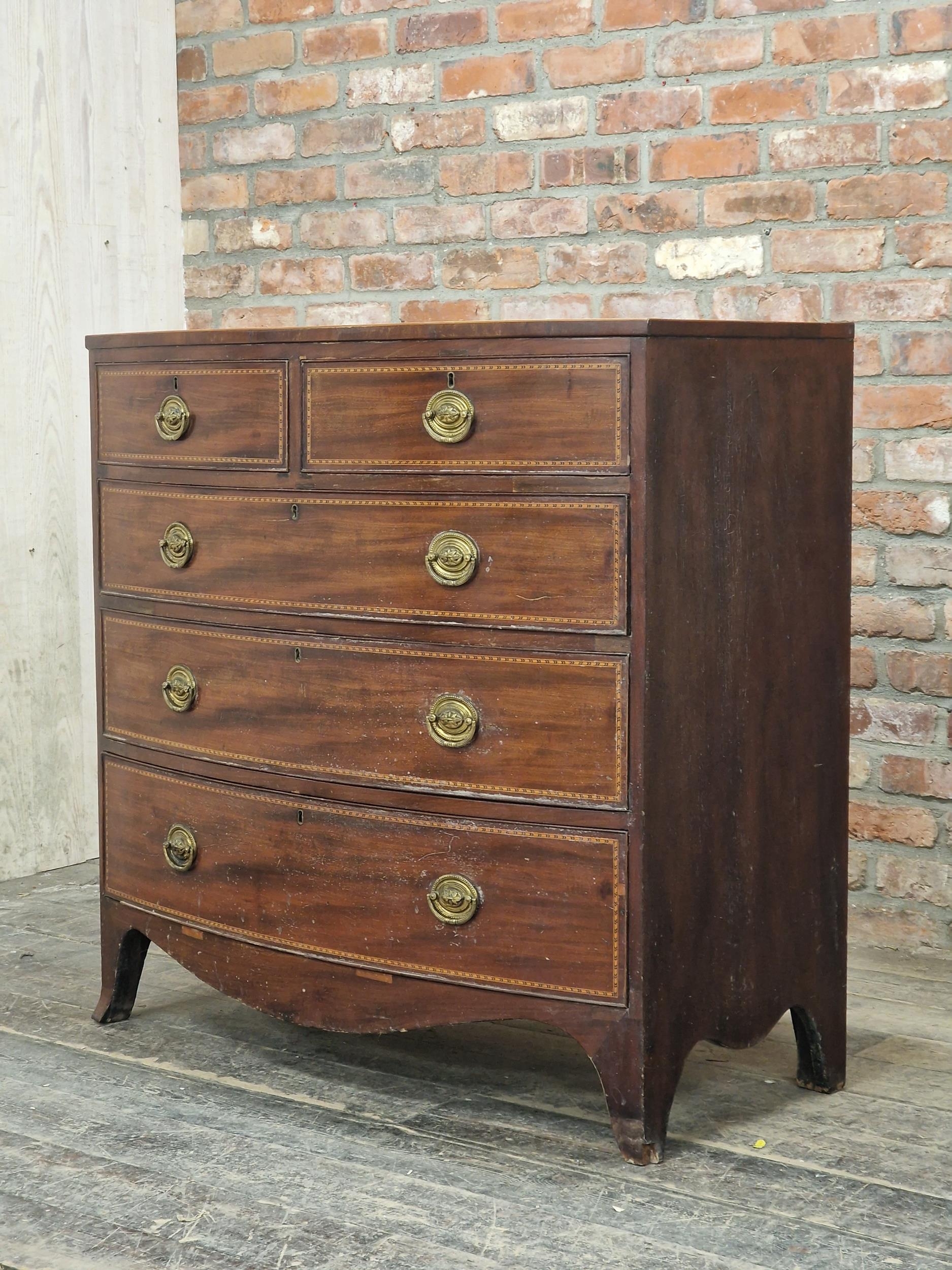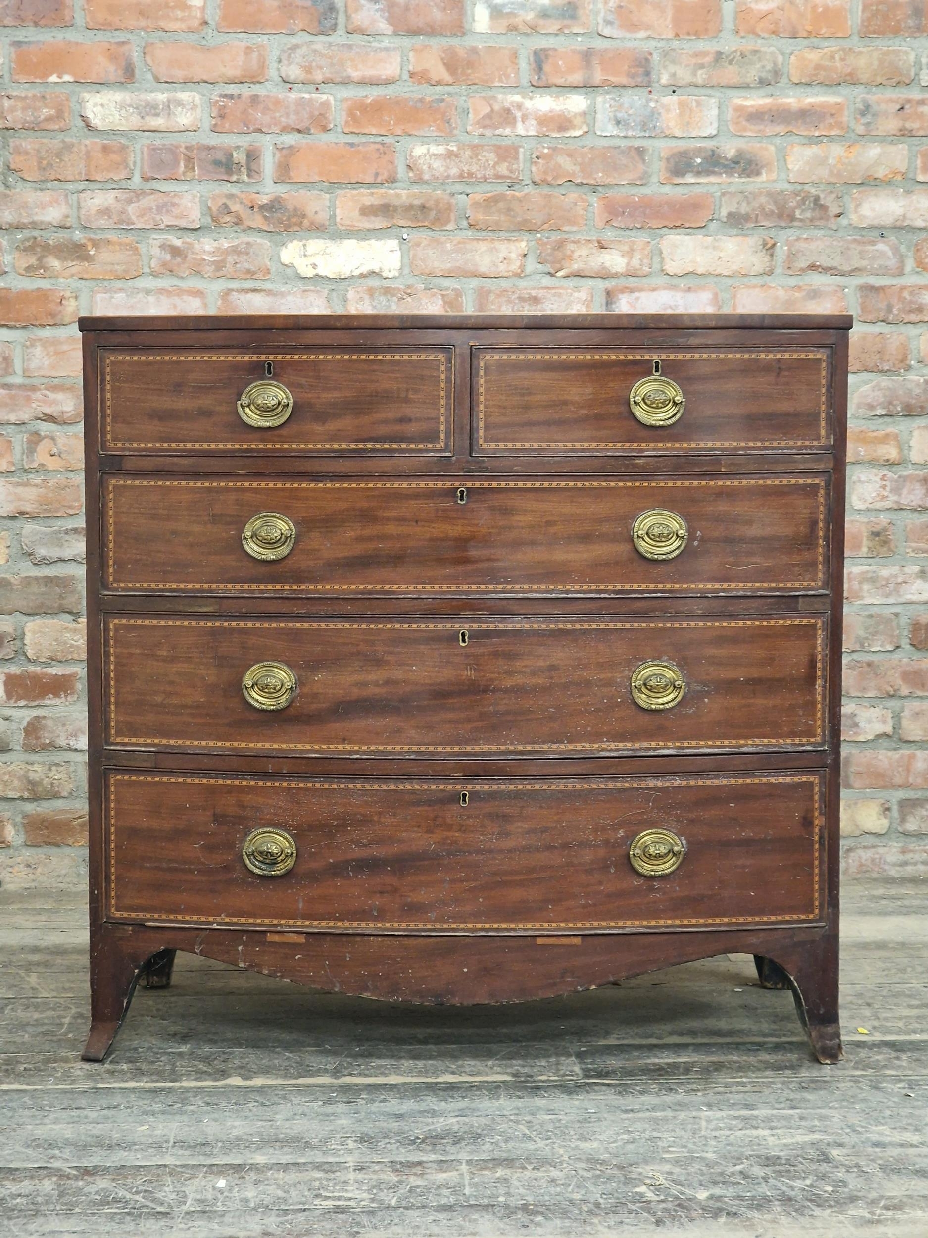 Georgian mahogany and satin wood inlaid bow front chest of two short over three long graduated drawers, raised on swept supports, H 107cm x W 108cm x D 55cm