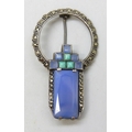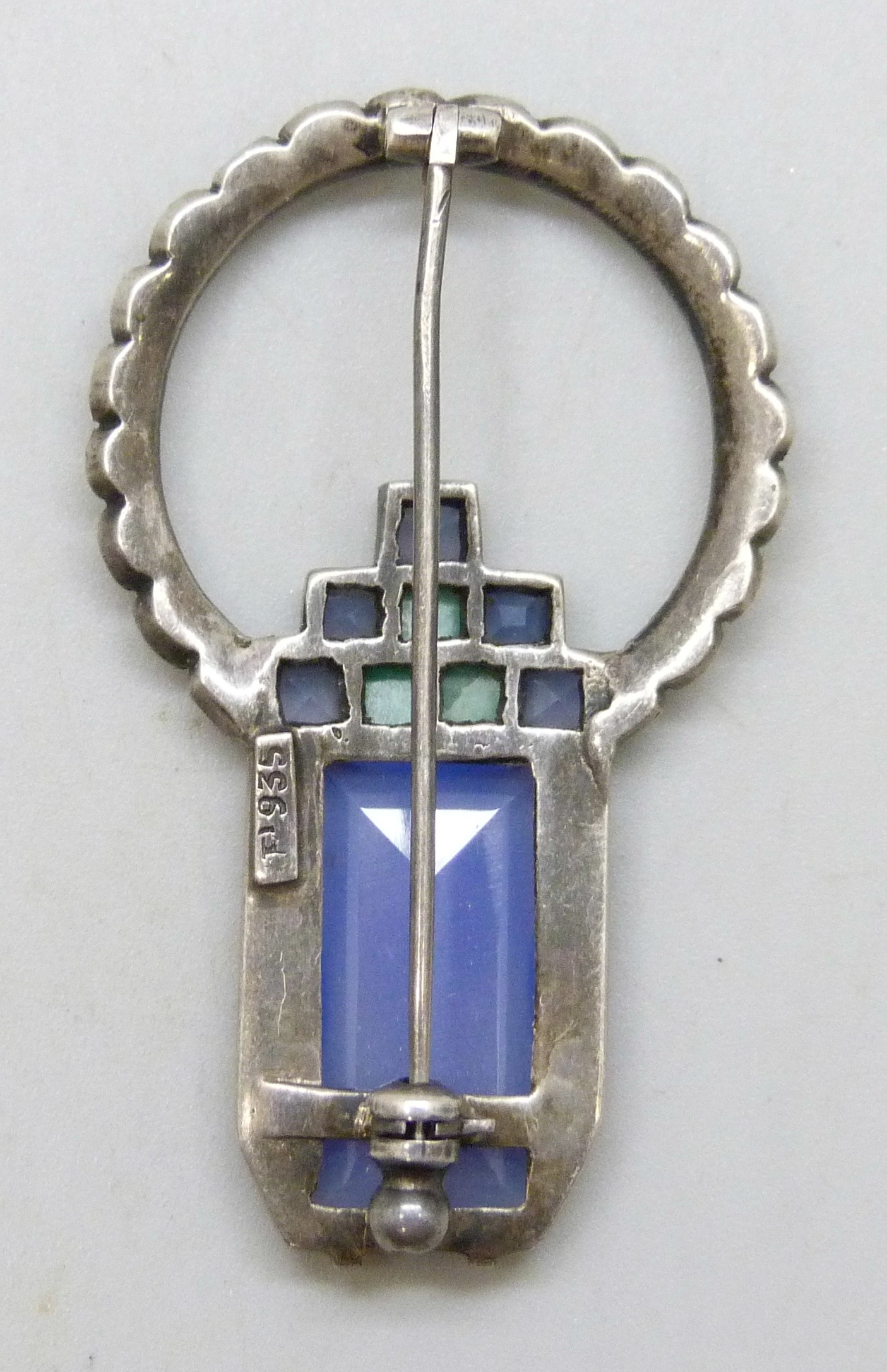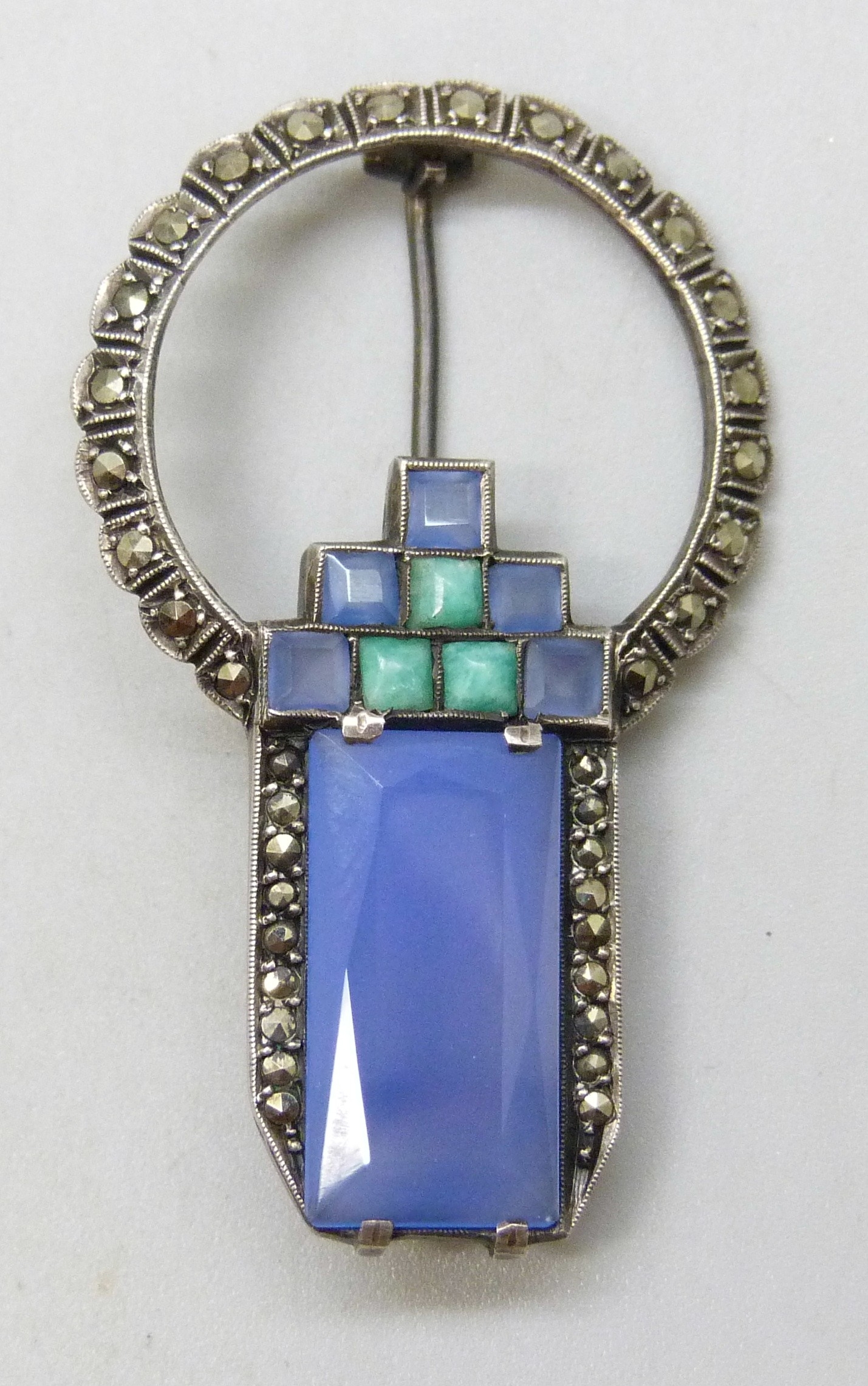 An Art Deco .935 silver, marcasite, Peking glass and possibly chalcedony brooch, 4.5cm