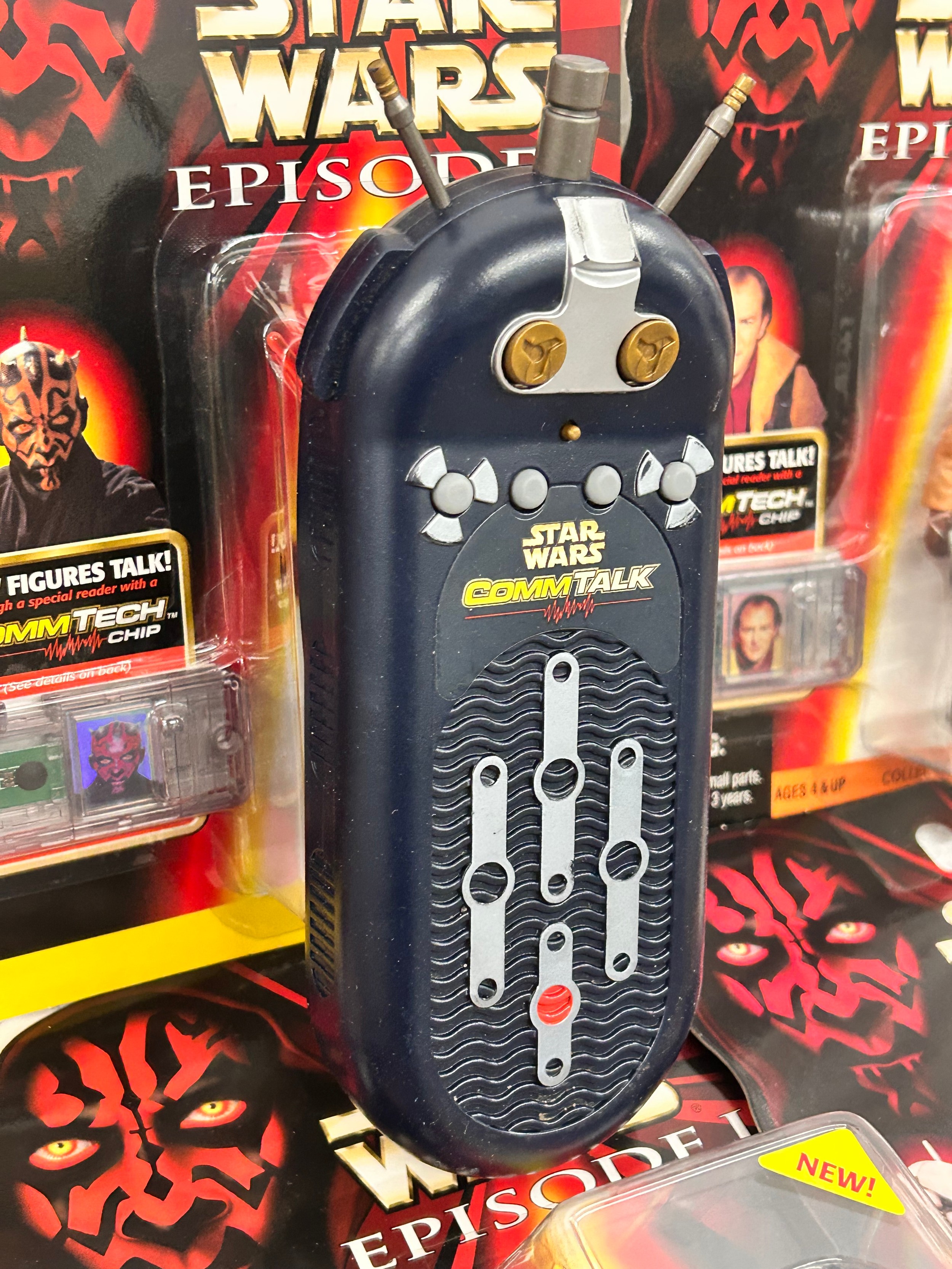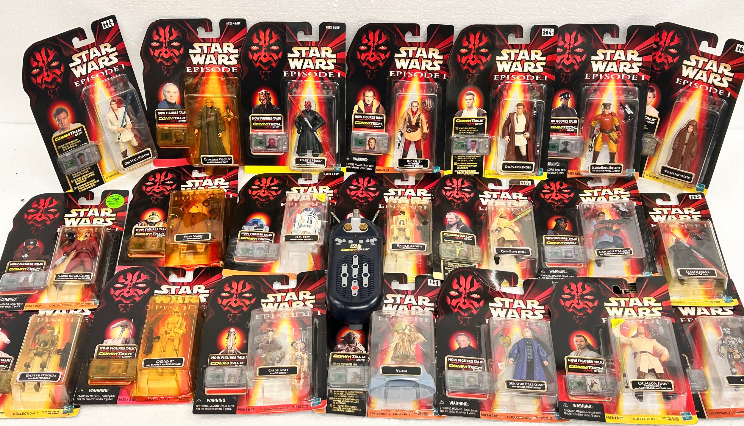 A collection of twenty-one Star Wars Episode I character figures, sealed packets, and a Comm Talk handset