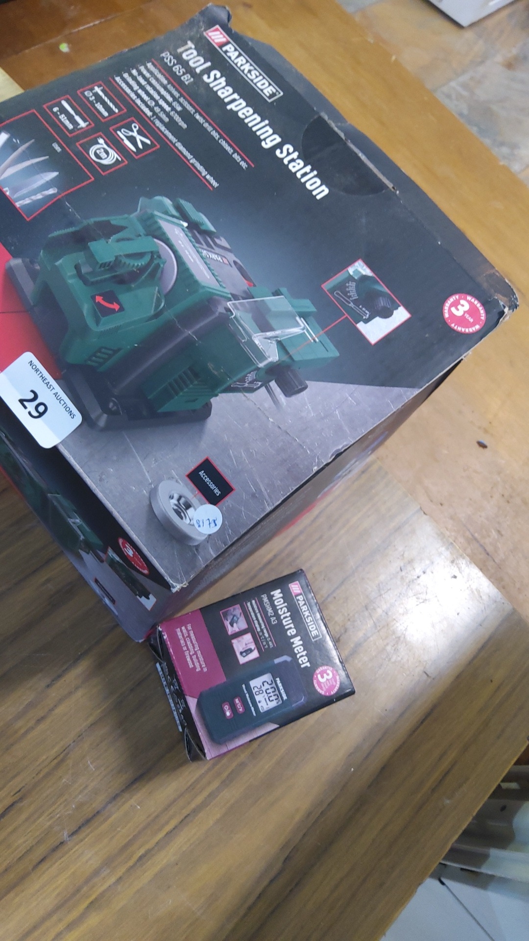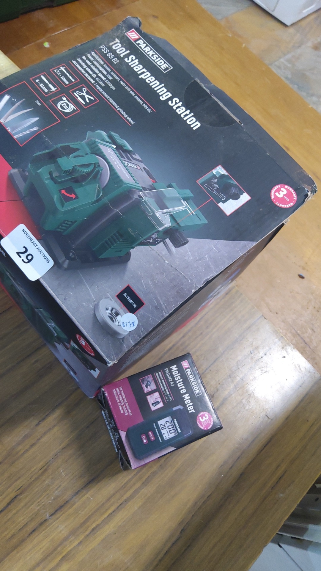 Parkside tool sharpening station, model PSS 65 B1, boxed, with accessories illustrated; accompanied by a Parkside moisture meter, model PMSHM 2 A3, boxed.