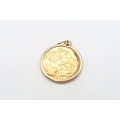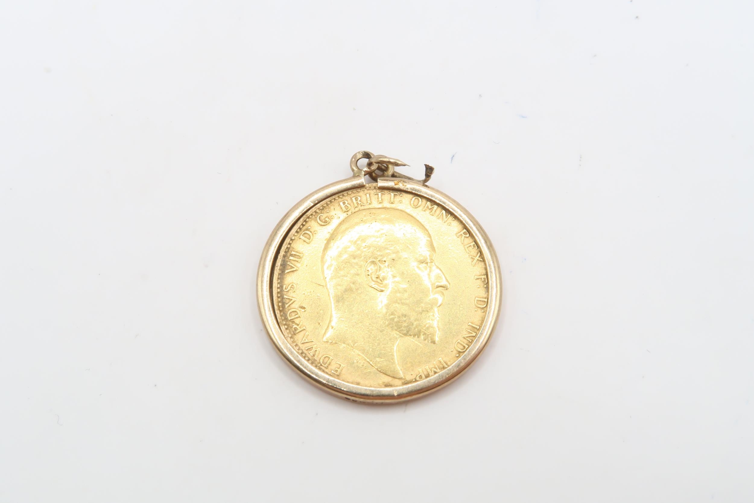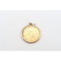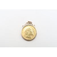 A George VII London Mint 1910 Full Sovereign within a 9ct mount. Weight 8.96 grams