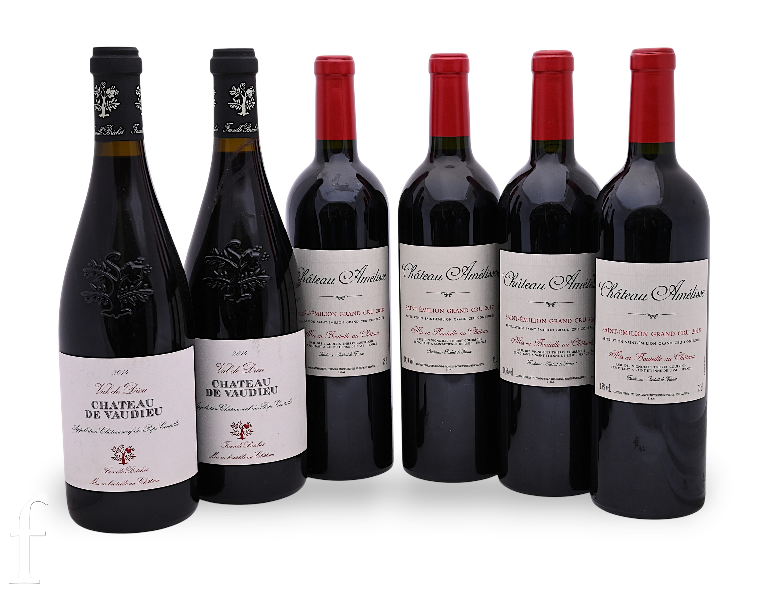 A collection of French red wines, to include four bottles of 2018 Château Amélisse, St.Emilion Grand Cru and two bottles of Château de Vaudieu Châteauneuf-du-Pape Val de Dieu, French, red wine. (6)