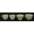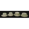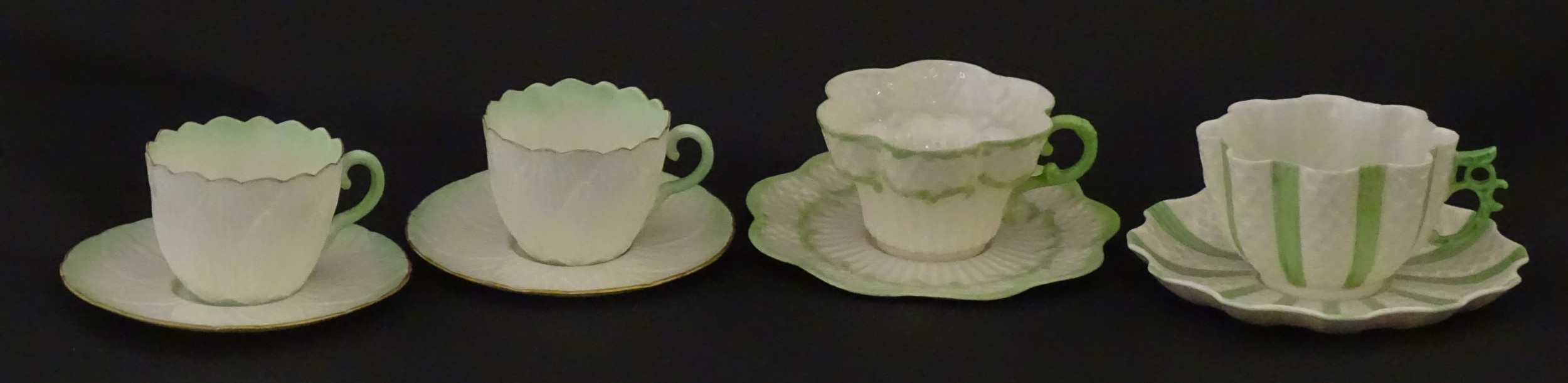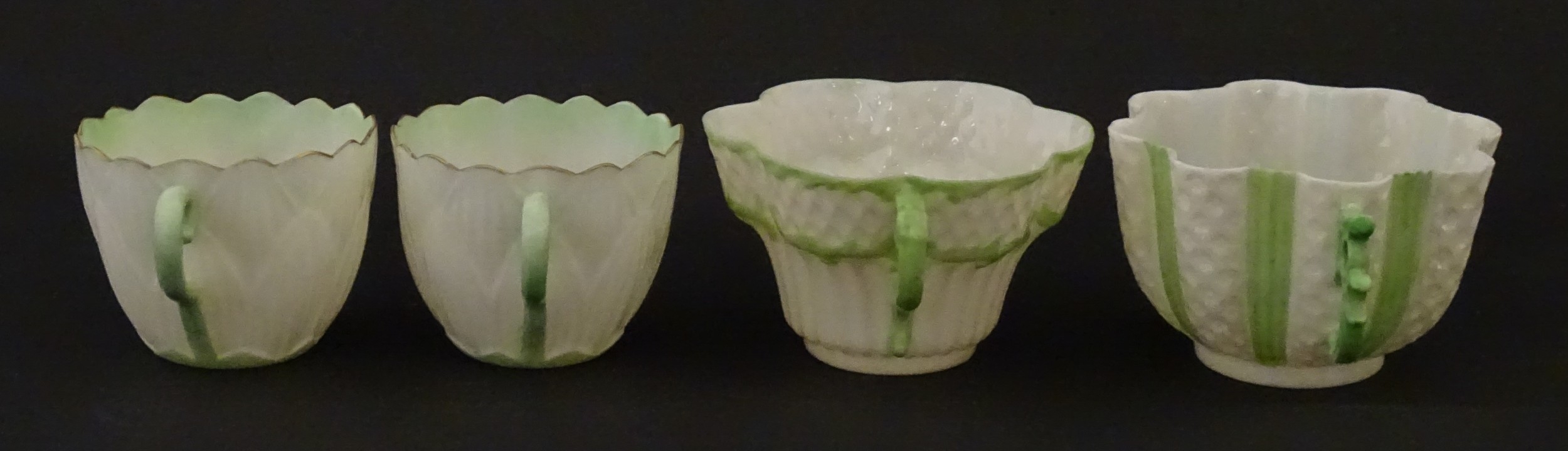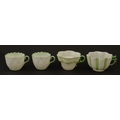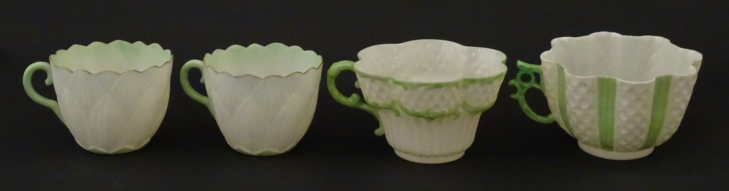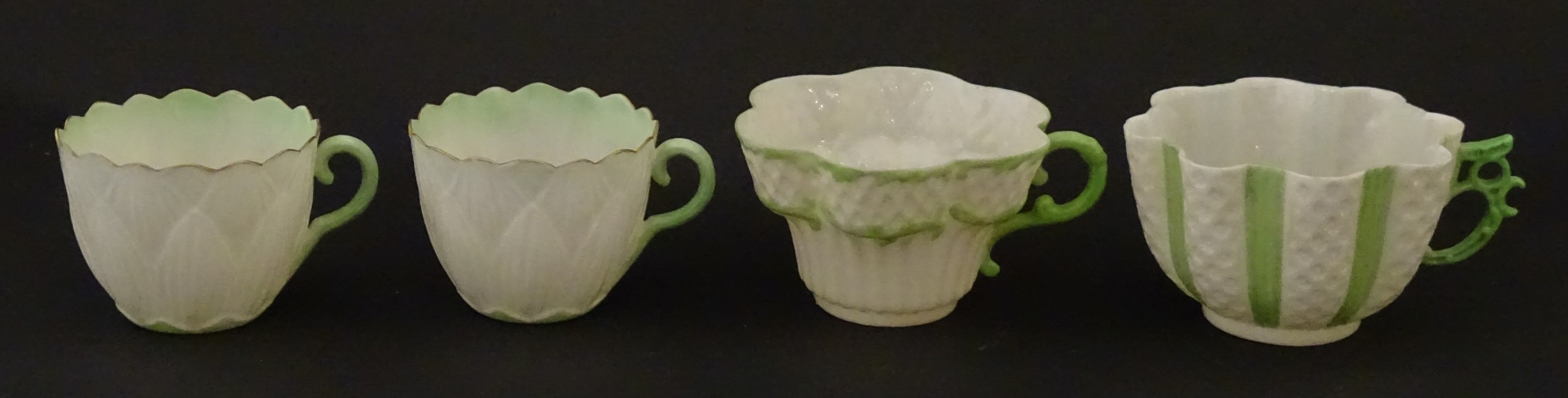 Two Belleek Lily pattern cups and saucers with green highlights. Together with a Belleek 5 O'Clock pattern tea cup and saucer, and another in the Erne pattern, both with green highlights. Largest cup approx. 2" high (6)
