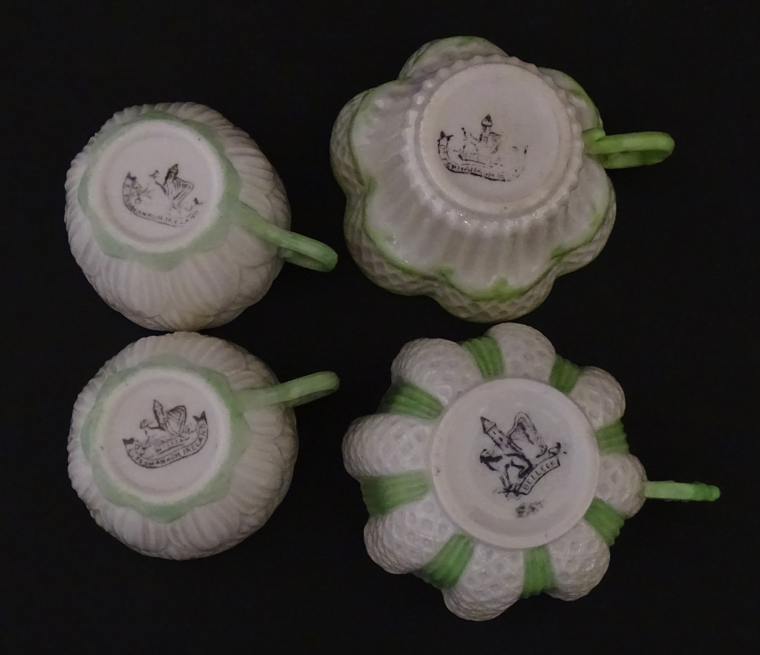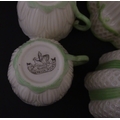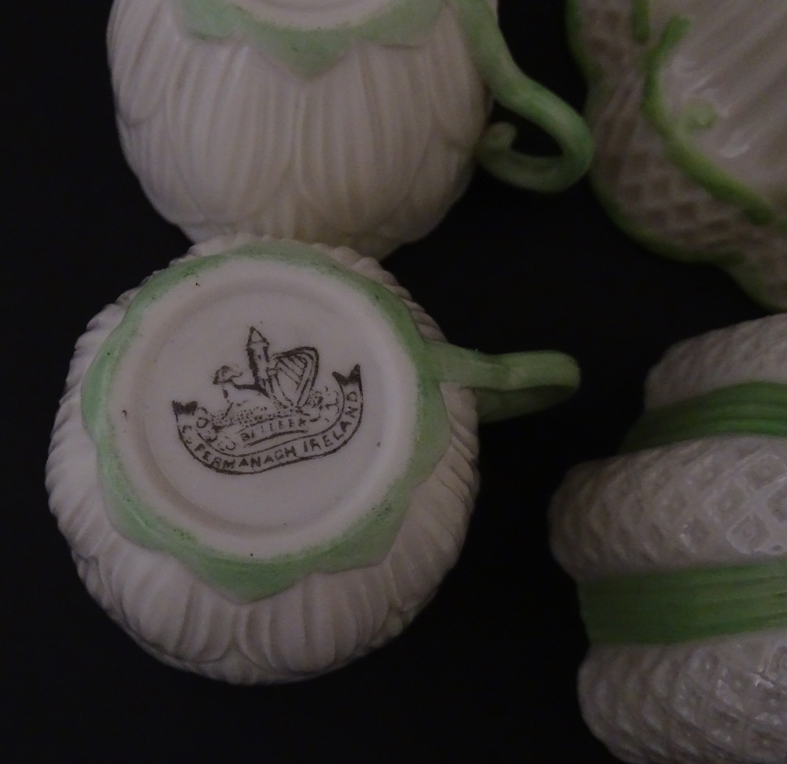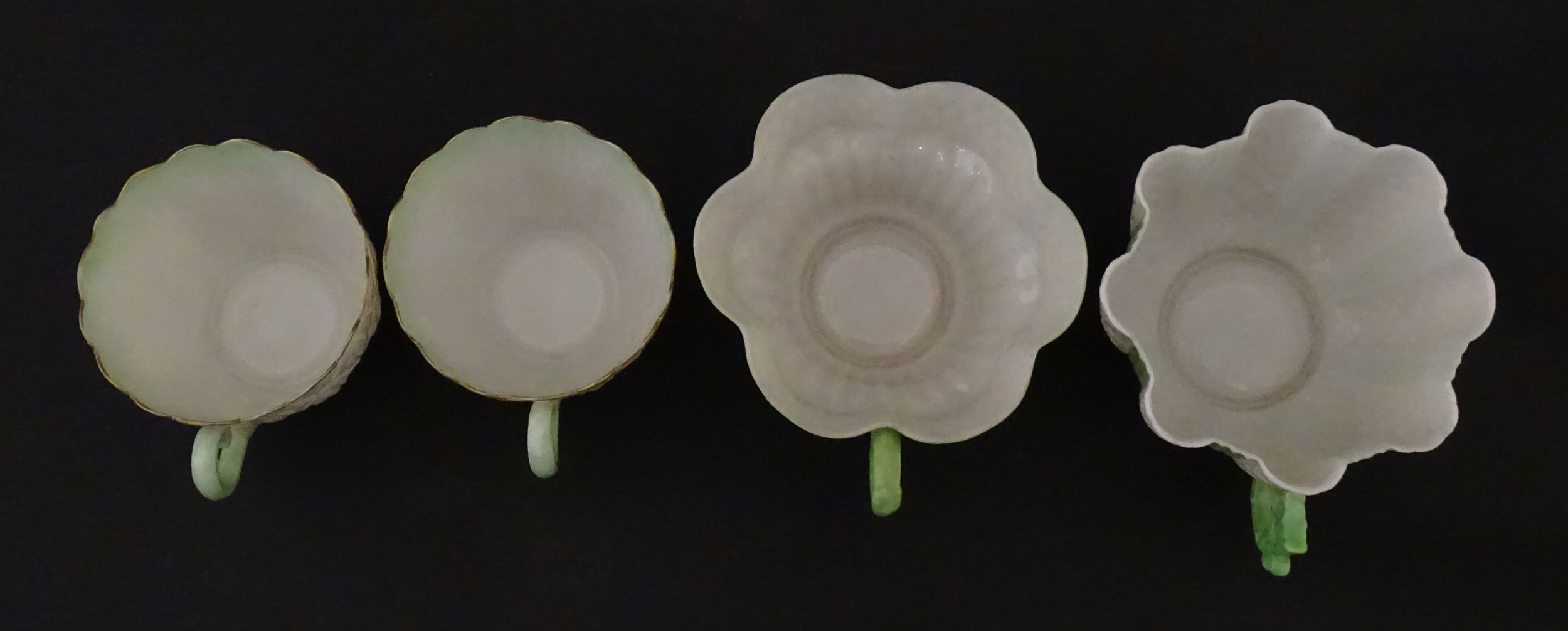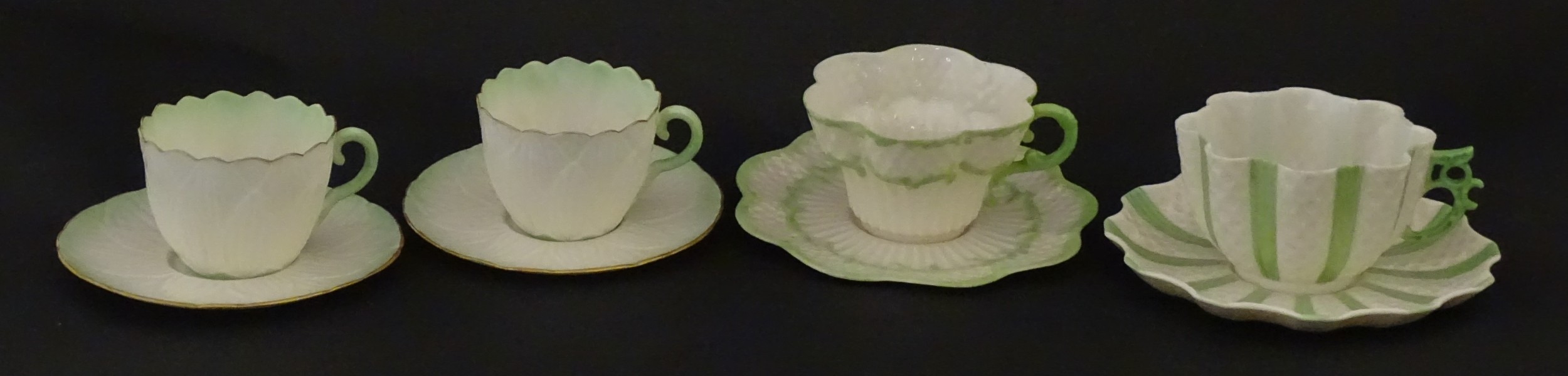 Two Belleek Lily pattern cups and saucers with green highlights. Together with a Belleek 5 O'Clock pattern tea cup and saucer, and another in the Erne pattern, both with green highlights. Largest cup approx. 2" high (6)