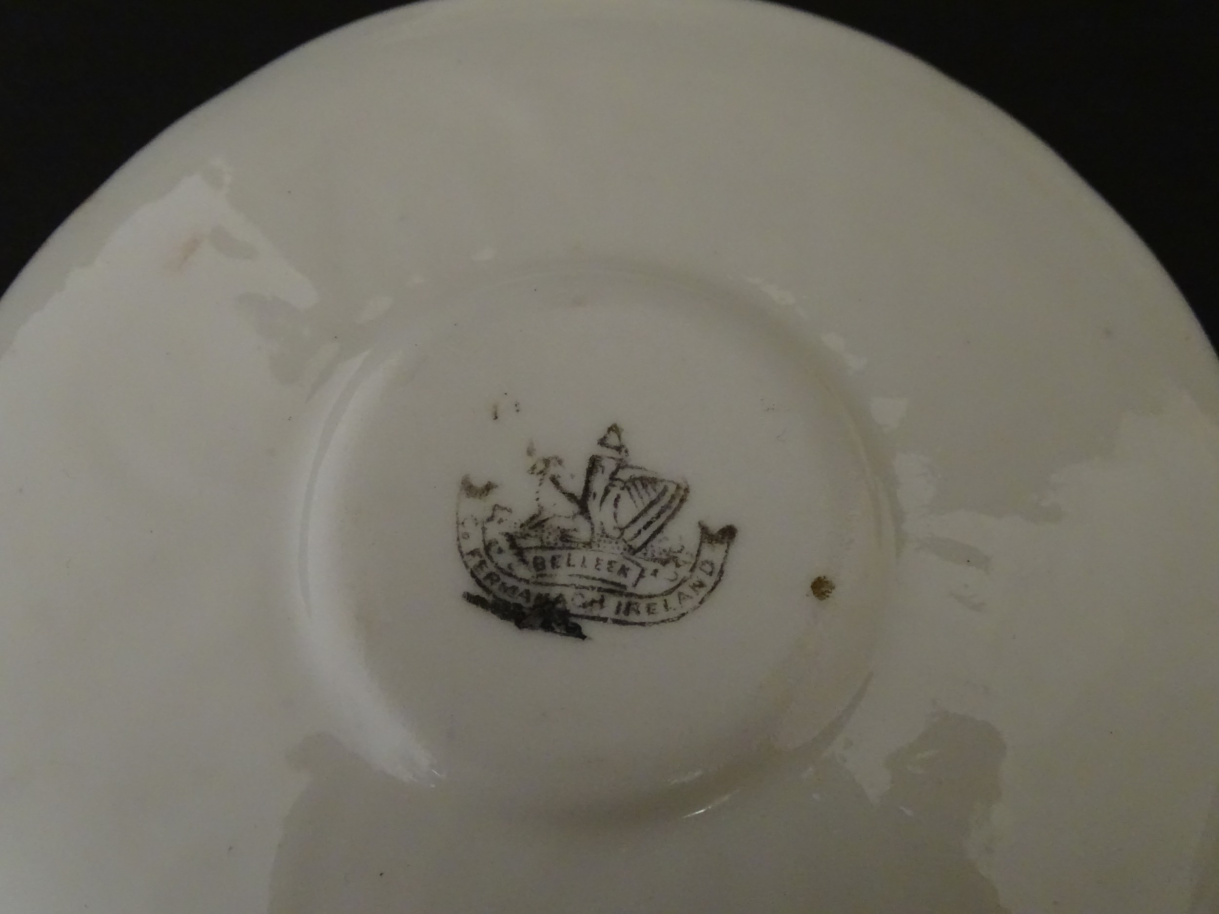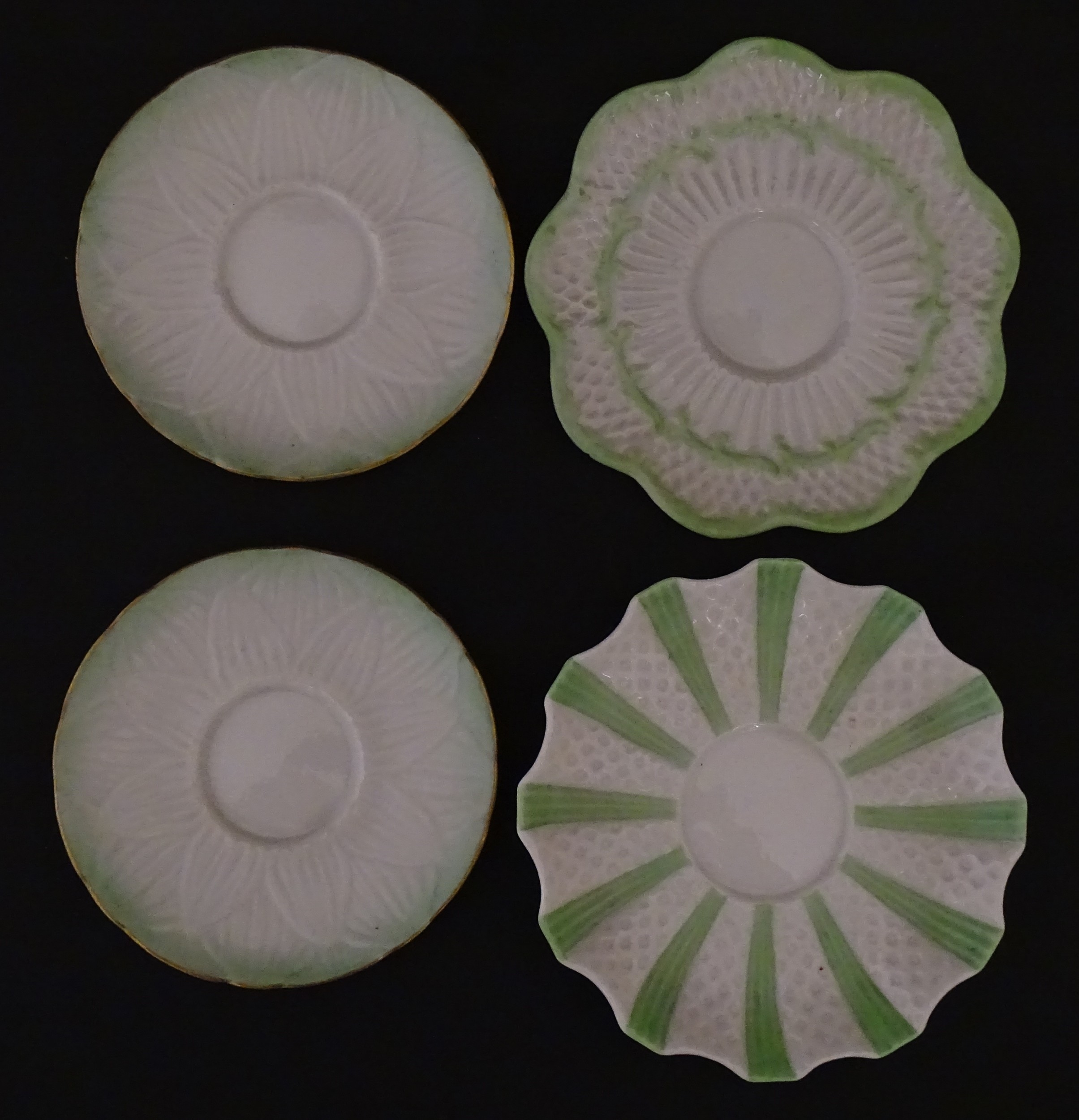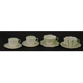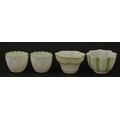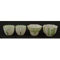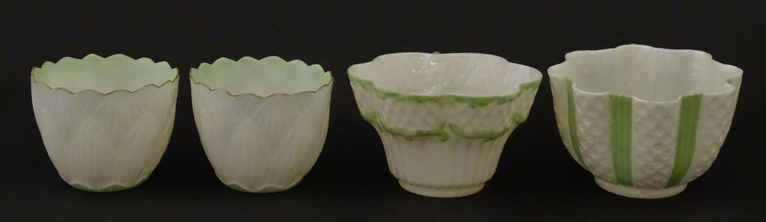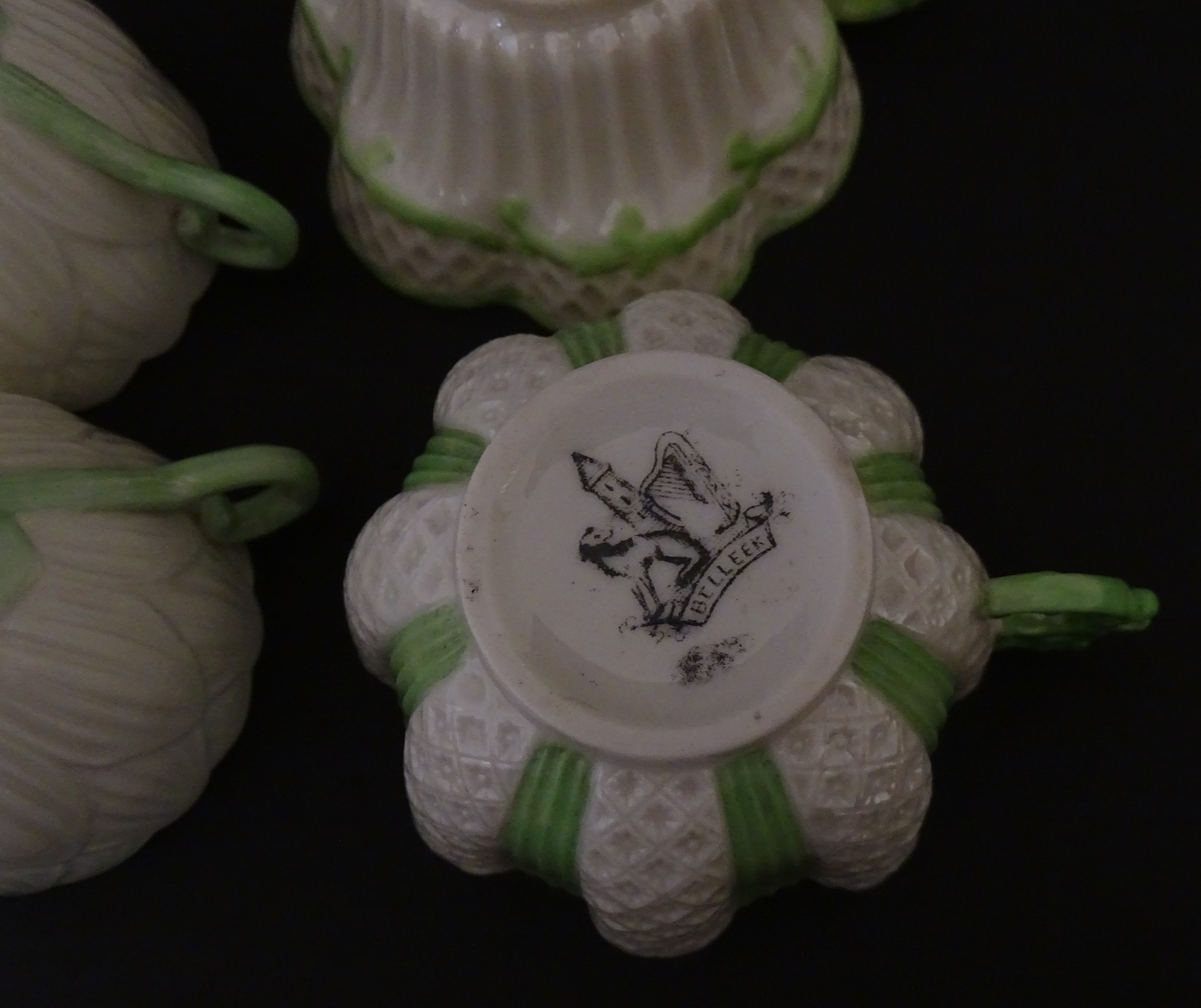 Two Belleek Lily pattern cups and saucers with green highlights. Together with a Belleek 5 O'Clock pattern tea cup and saucer, and another in the Erne pattern, both with green highlights. Largest cup approx. 2" high (6)