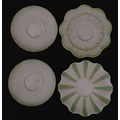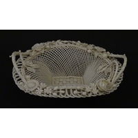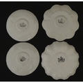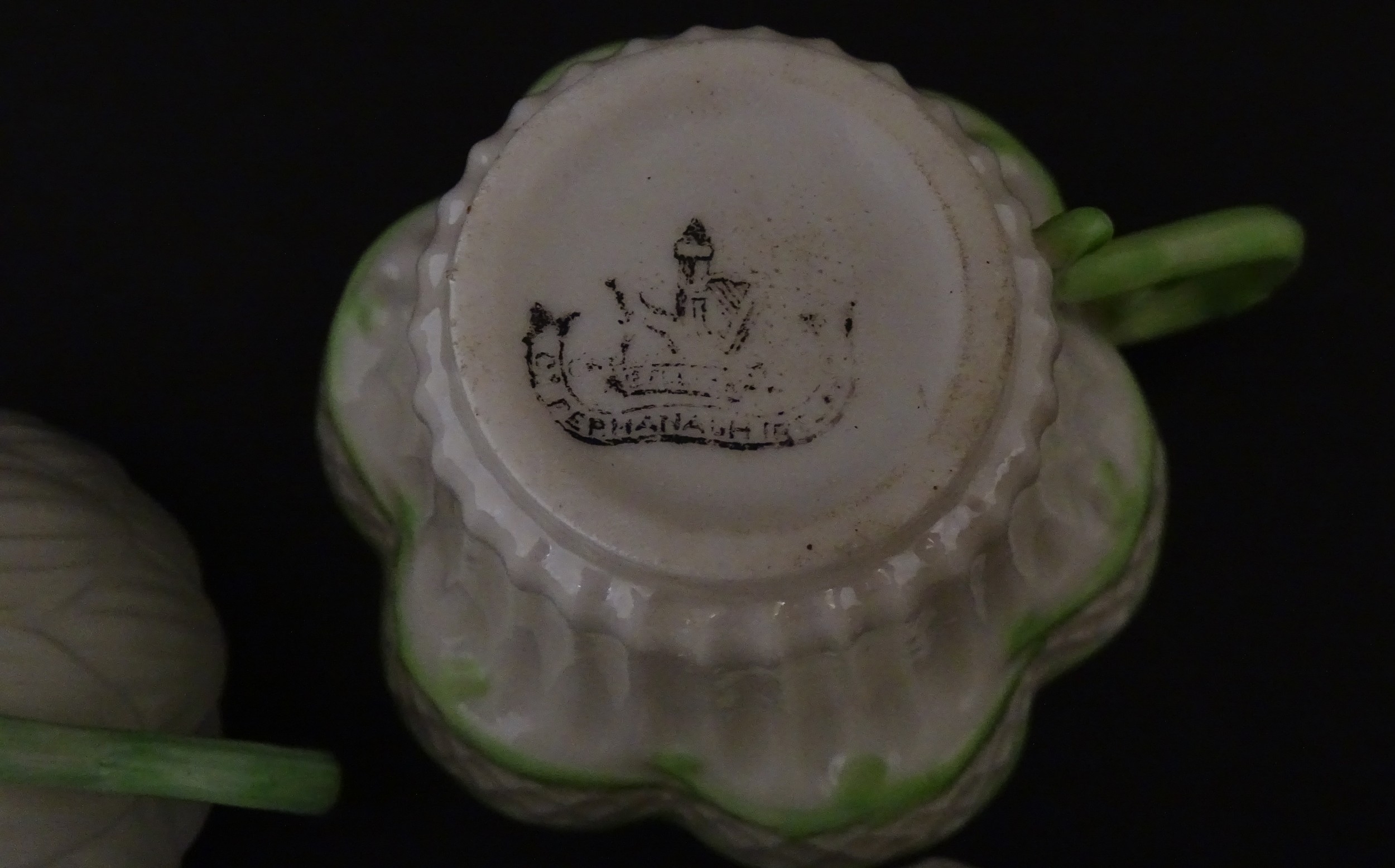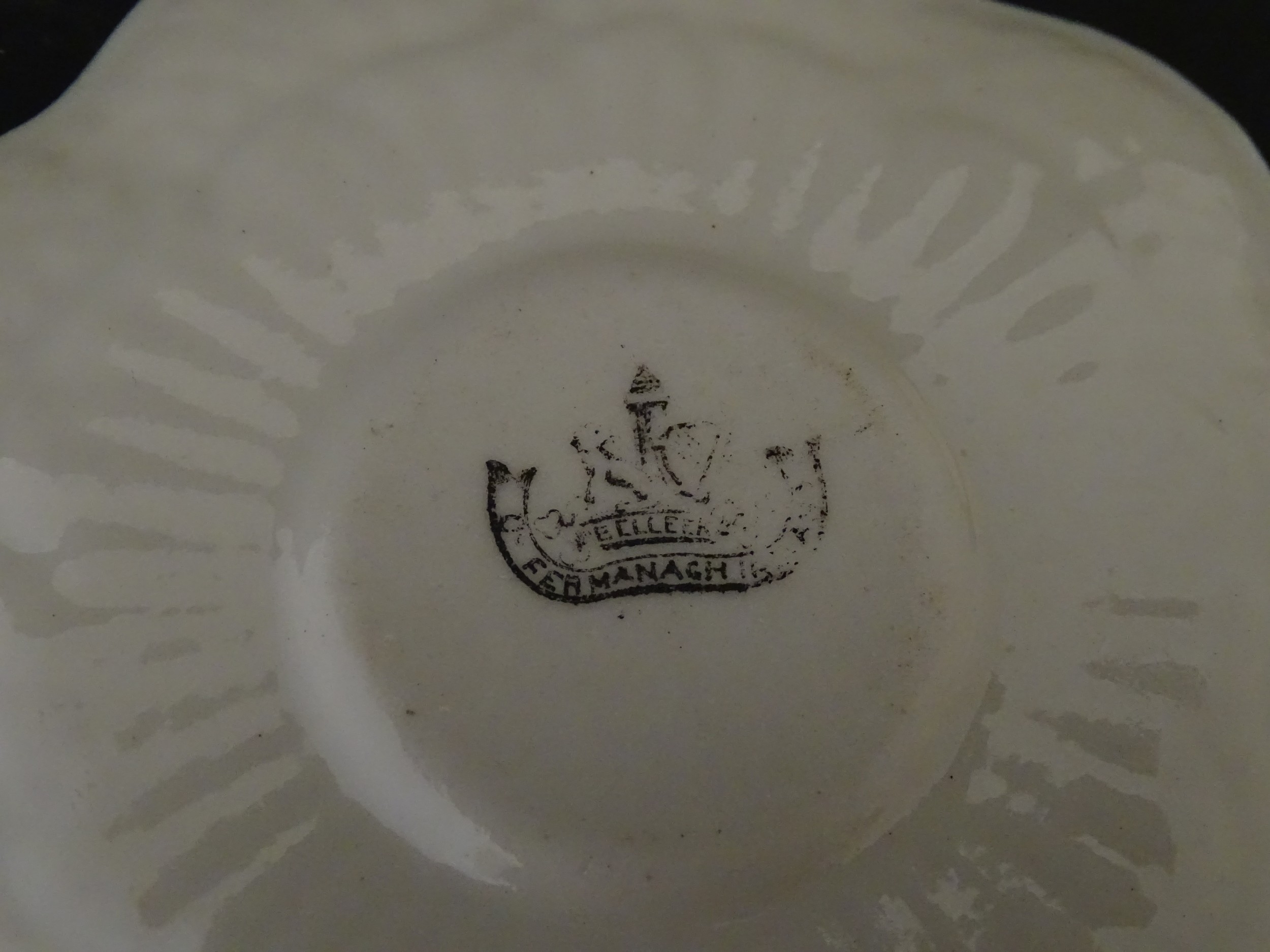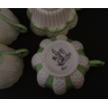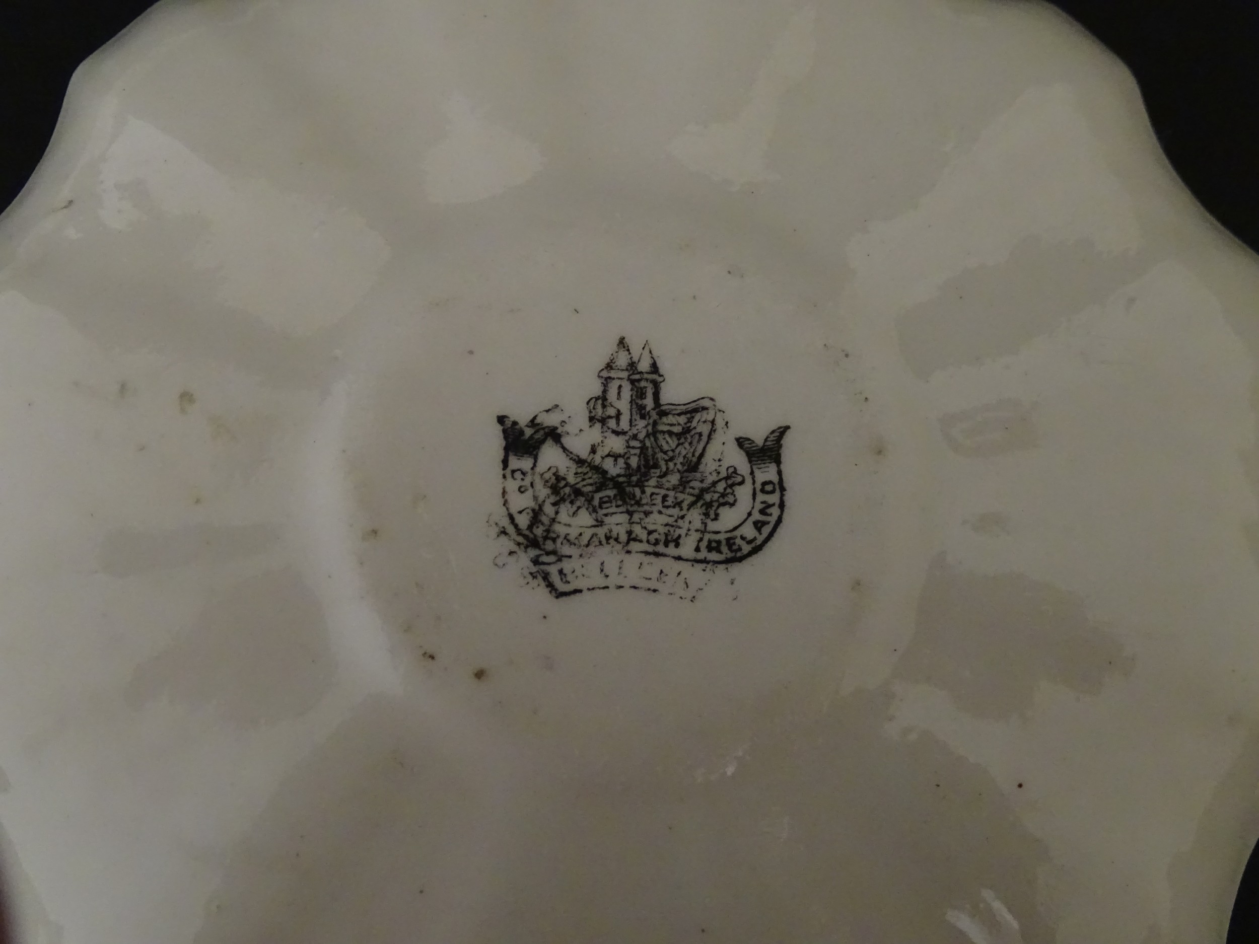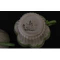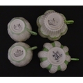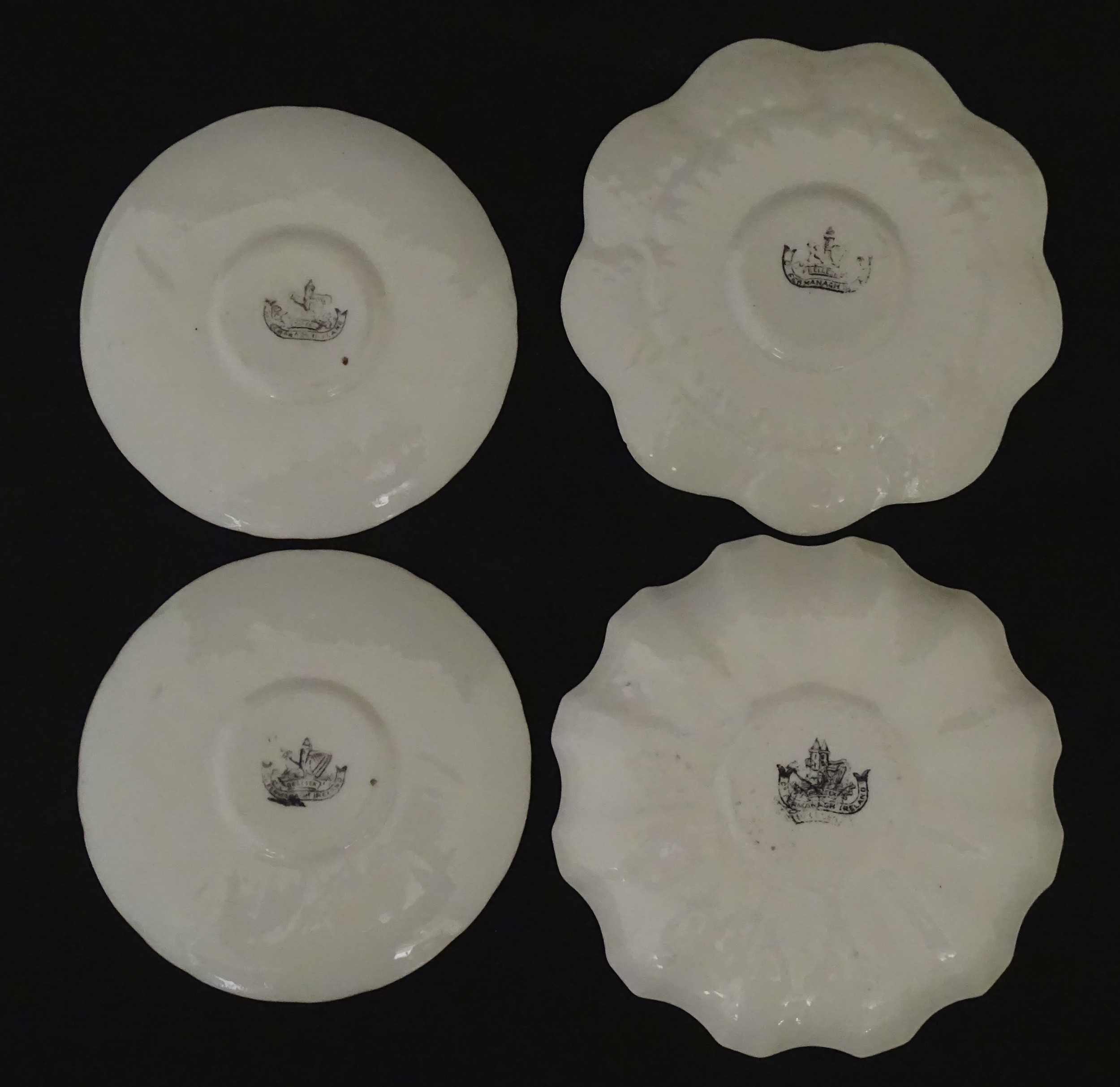 Two Belleek Lily pattern cups and saucers with green highlights. Together with a Belleek 5 O'Clock pattern tea cup and saucer, and another in the Erne pattern, both with green highlights. Largest cup approx. 2" high (6)