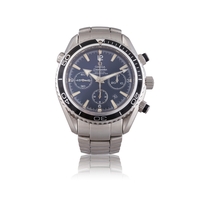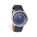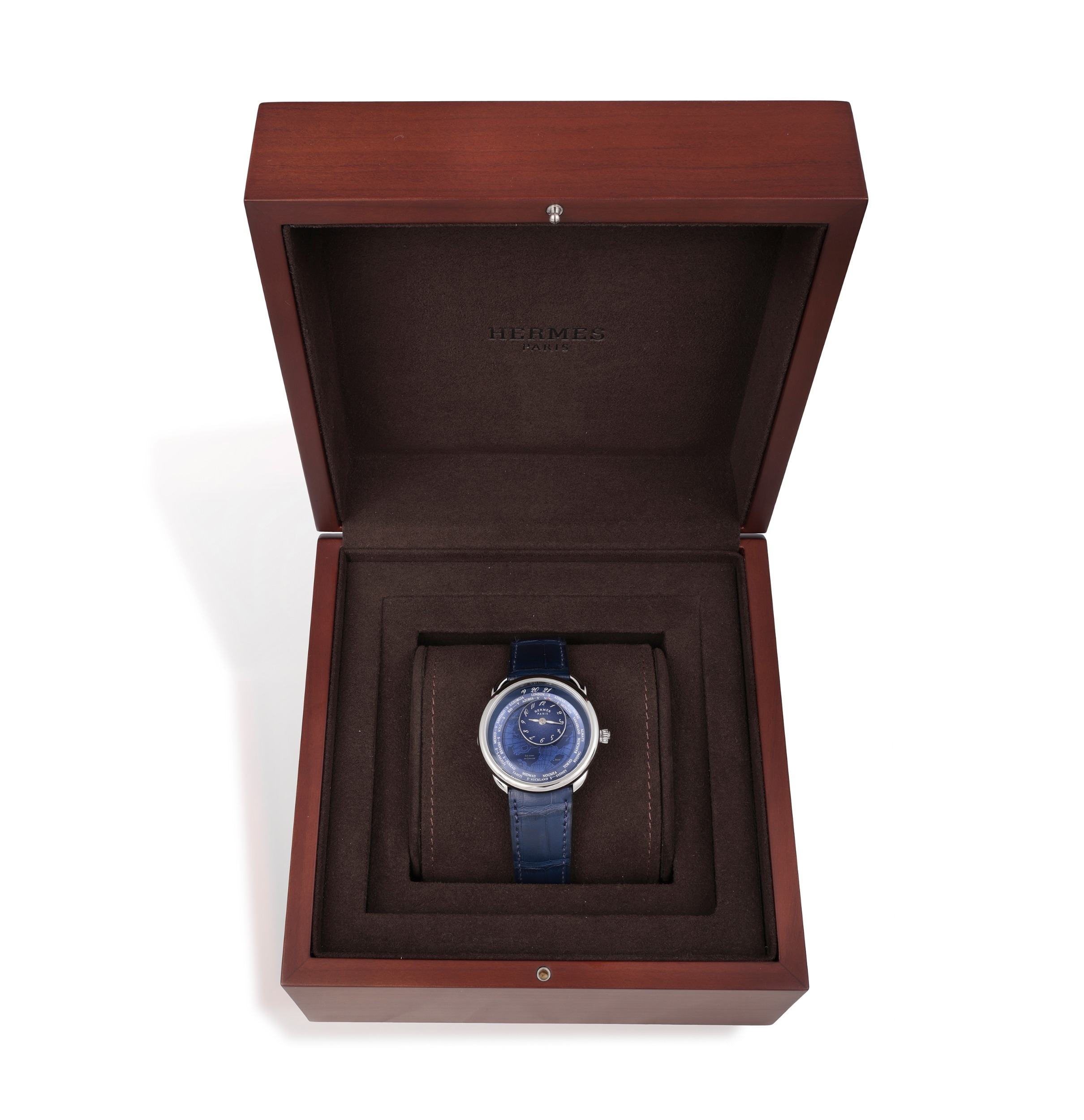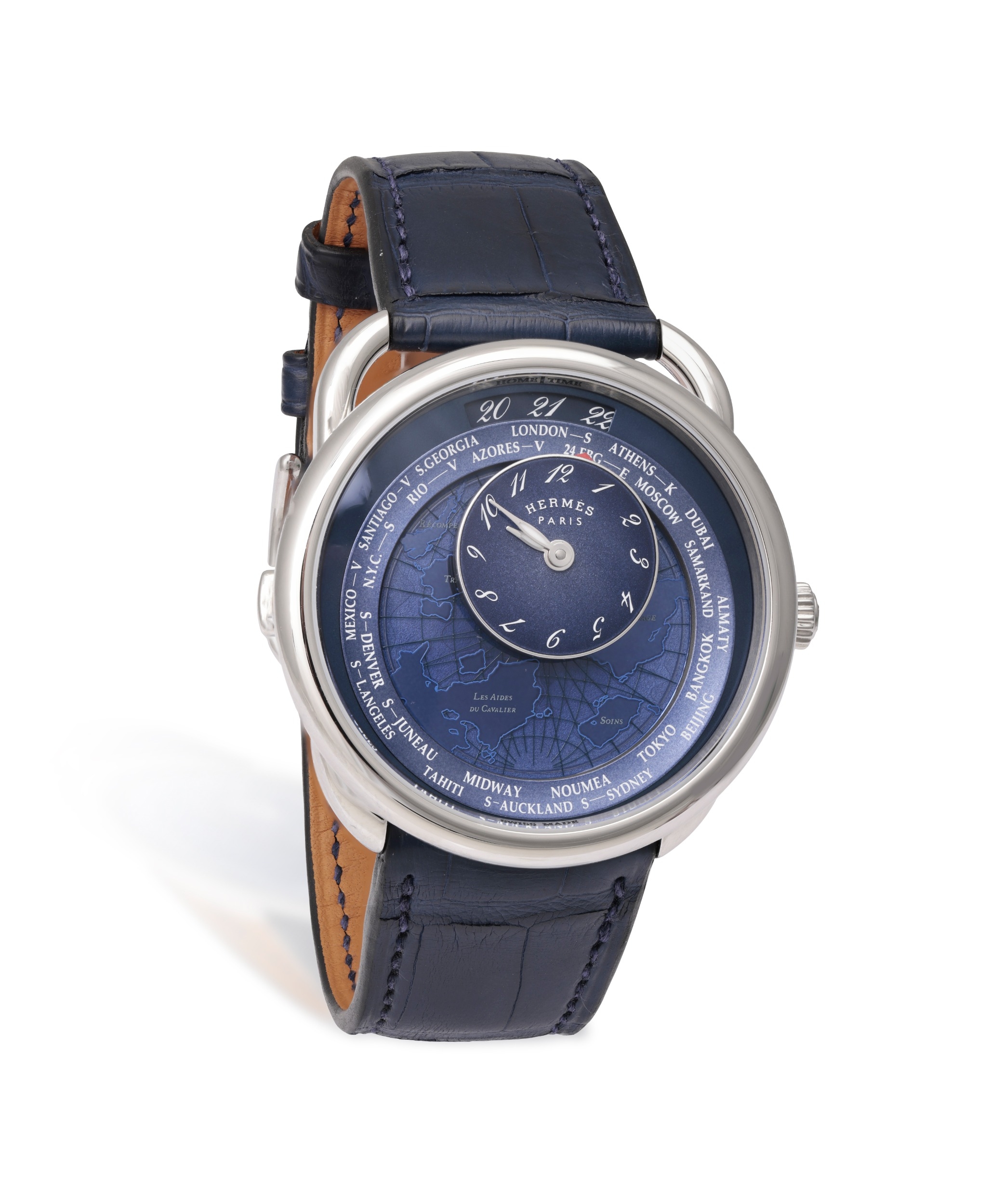 Hermès REF. AR10.510, ARCEAU, LE TEMPS VOYAGEUR, BLUE DIAL An attractive stainless steel world timer wristwatch with date Year : 2023 Dial : blue dial inspired by the 'Planisphère d'un montre équestre' motif designed by Jérome Colliard, sandblasted blue-lacquered mobile counter, galvanized dial, blue transferred continent names and contours, laser-engraved and lacquered oceans, blue transferred meridians and parallels. travelling time module, dual-time display with city indication. Silver luminous hands Caliber : 28-jewels automatic movement no. H1837 Case : 3618906 Bracelet : night blue strap with Hermes Buckle. Dimensions : Ø 38 mm. Signature : Dial, case and movement Accessories : box, warranty, outer box and booklet, accompanied with photocopy of invoice