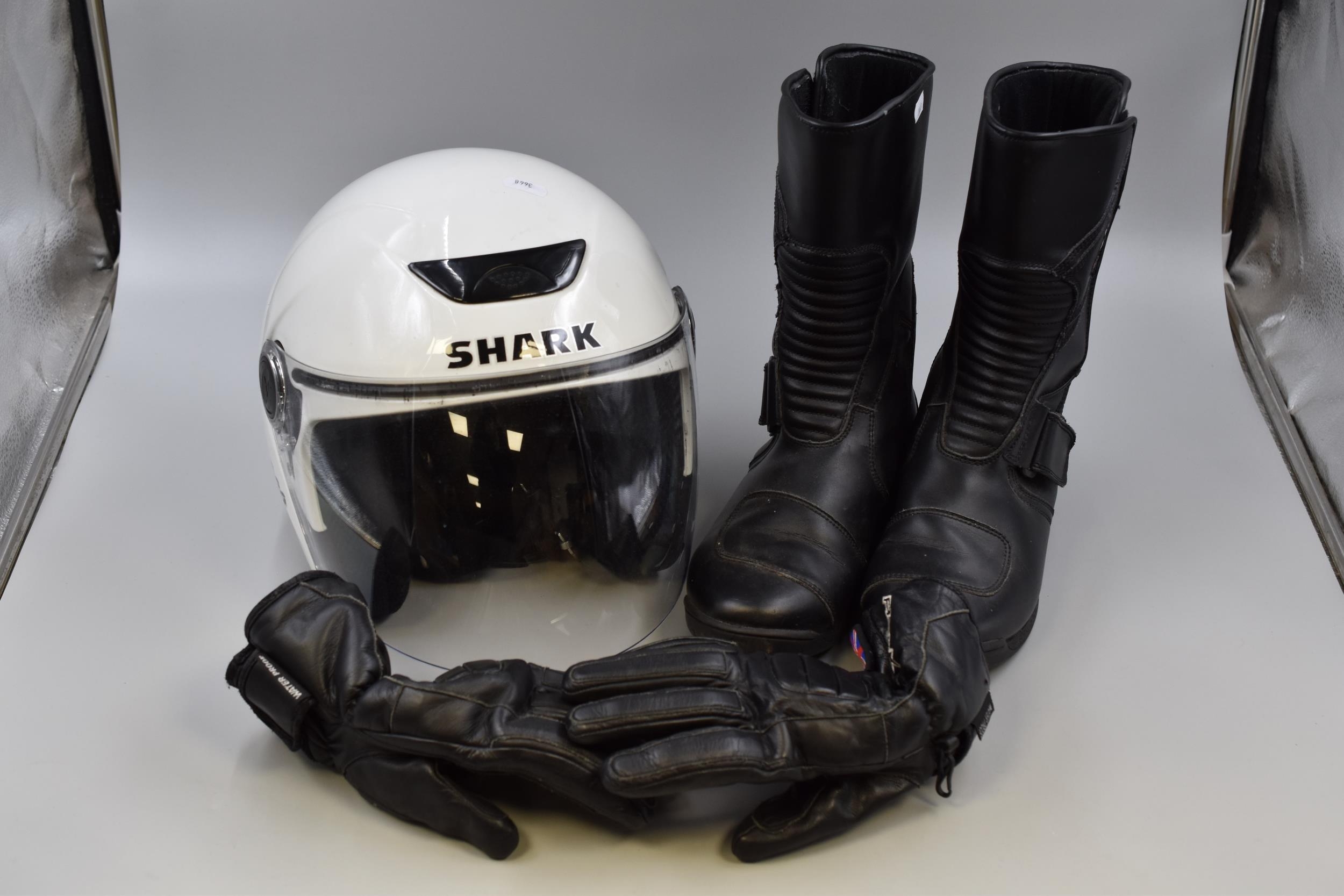 Ladies "Shark" motorcycle helmet in white size L/59, Akita boots size 7/41 and gloves