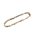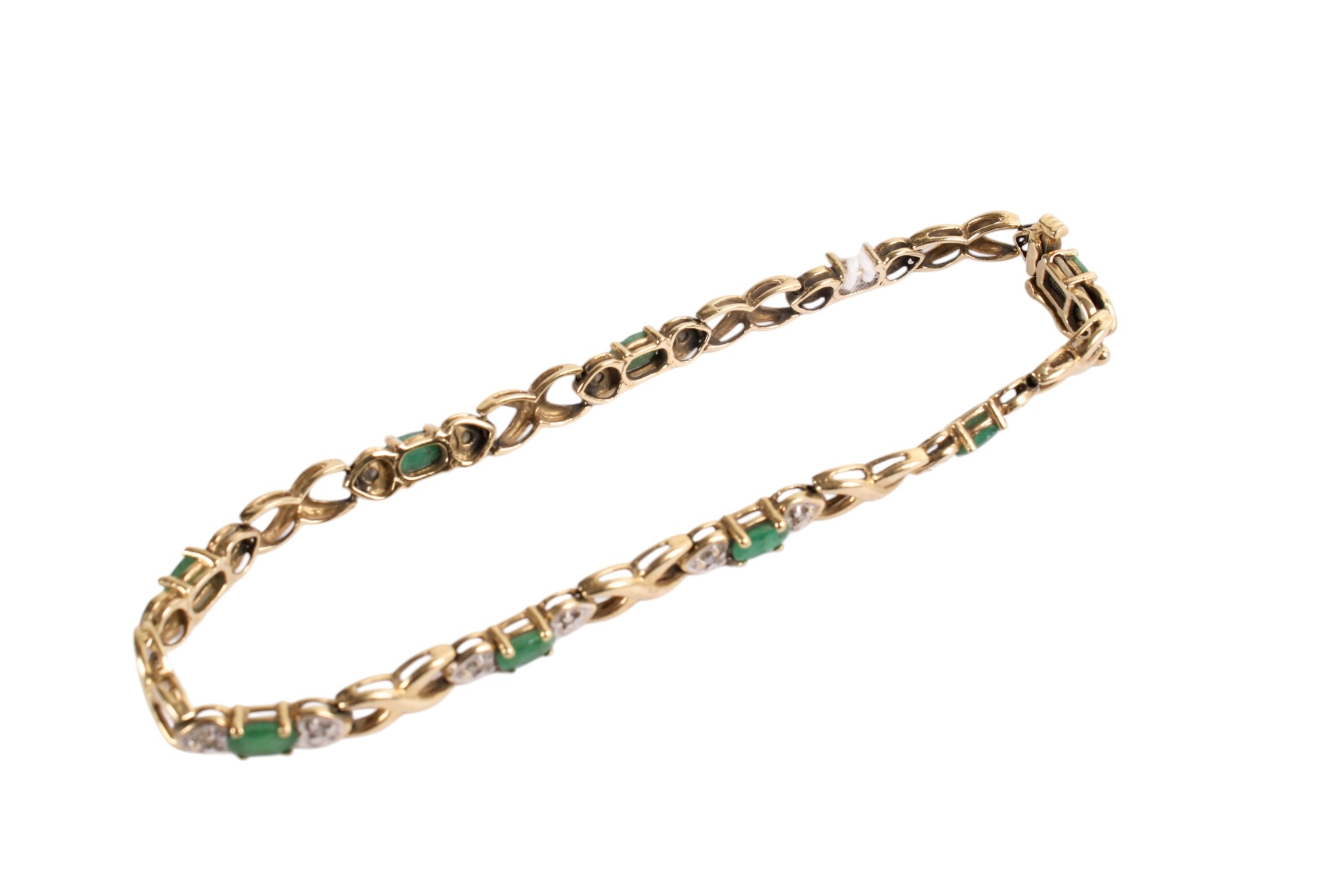 A gold and emerald fancy bracelet. Each oval cut emerald flanked by two small diamonds and crossver links, clasp marked 14k but tests circa 9ct gold, L18cm, gross weight 7.2g.
