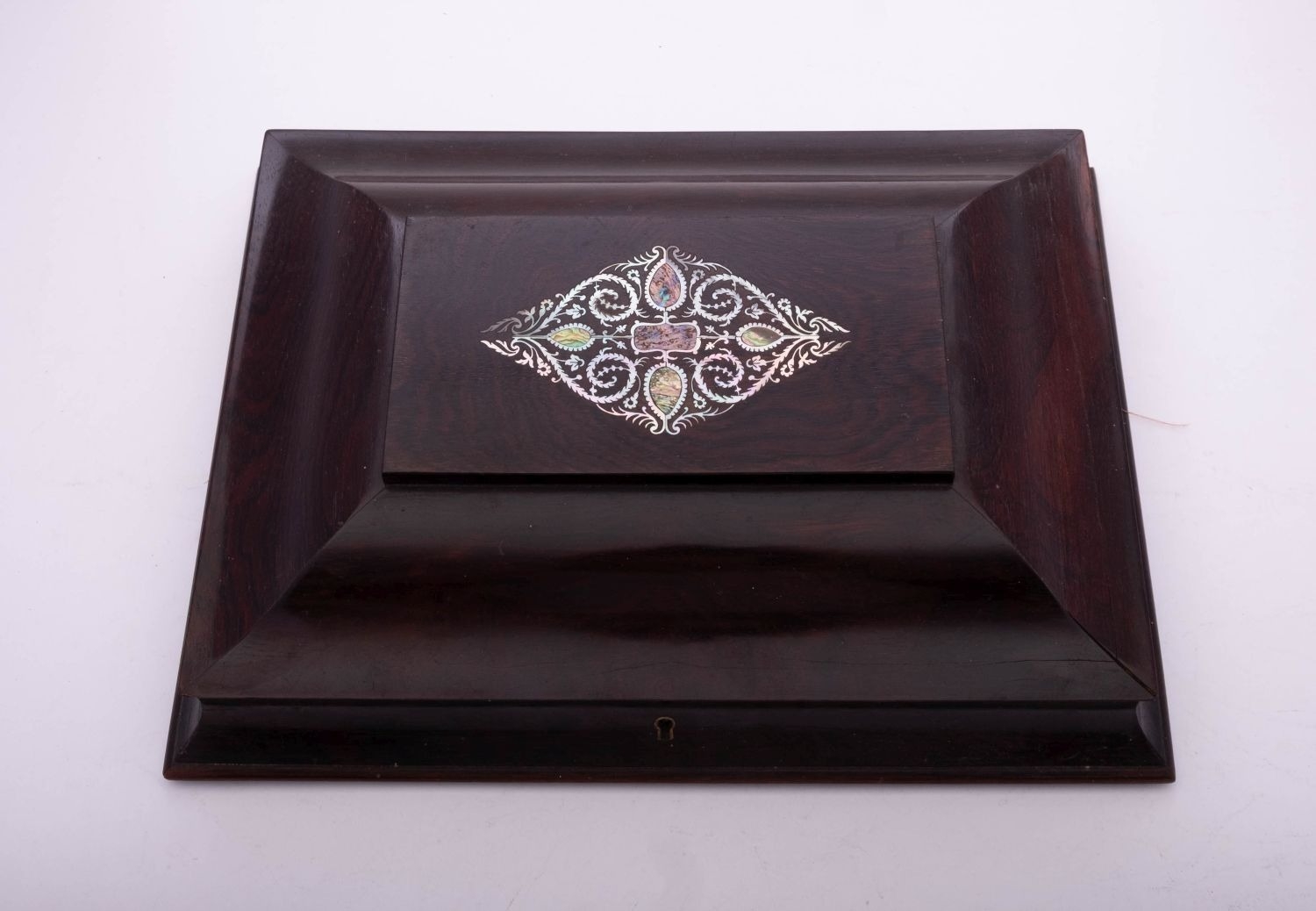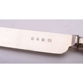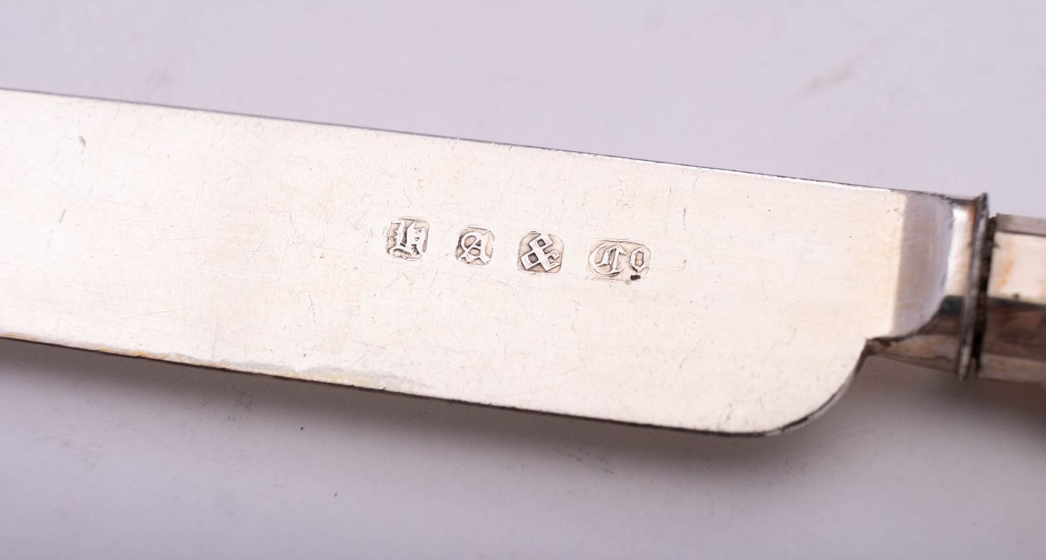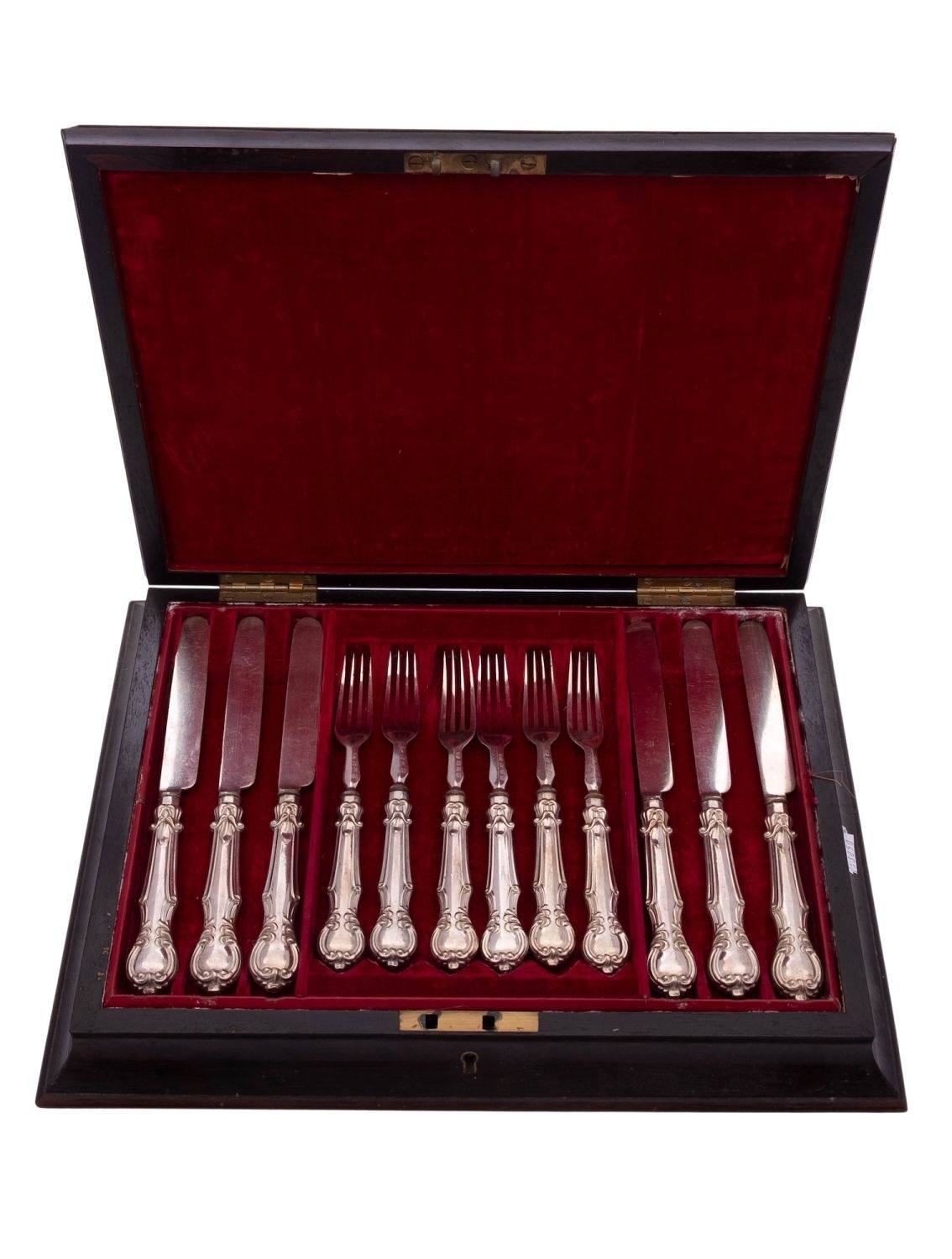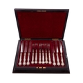 A late 19th/ early 20th century cased set of six pairs of silver plated dessert knives & forks, in a decorative pattern, contained in original fitted rosewood box with mother-of-pearl decoration, by Henry Atkin & Co, Sheffield c.1900; the case 15.1'' (38.2cm) long