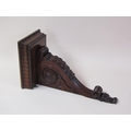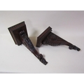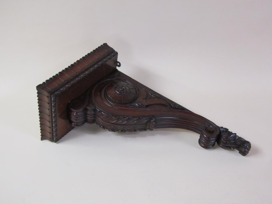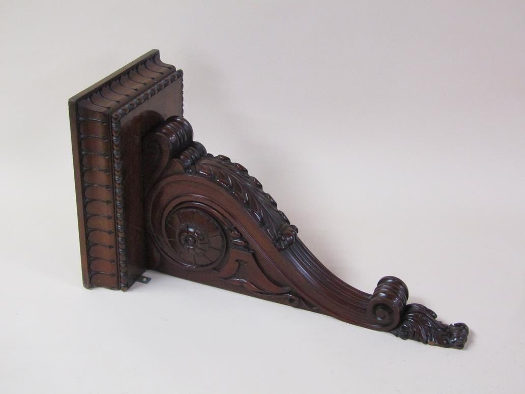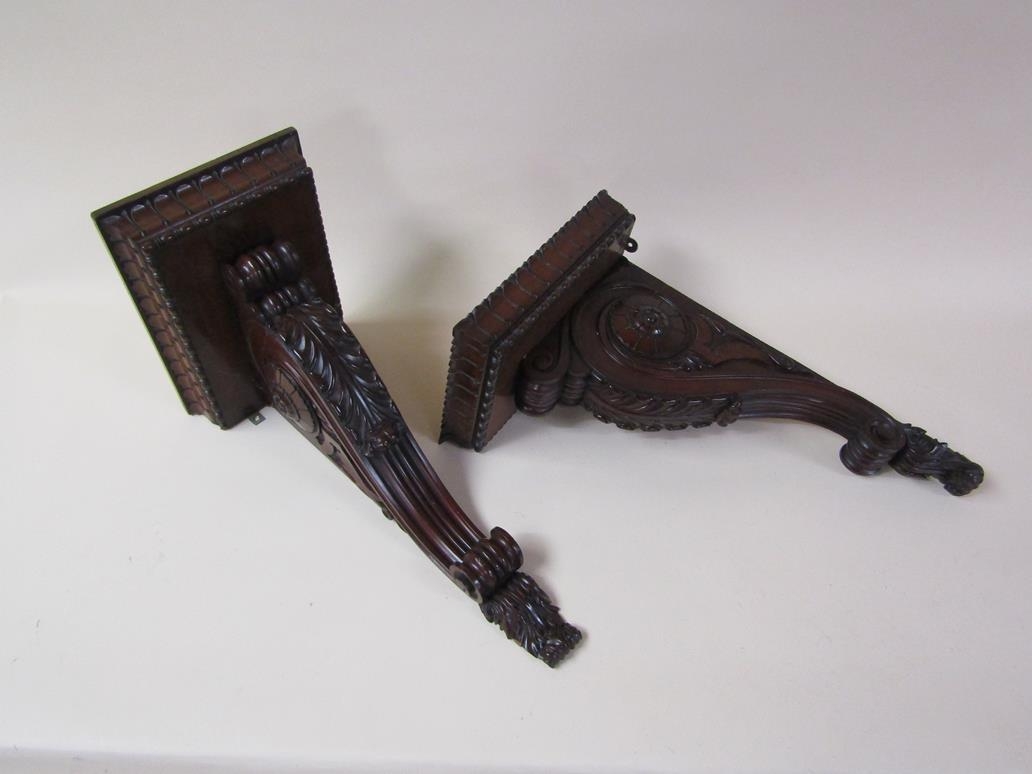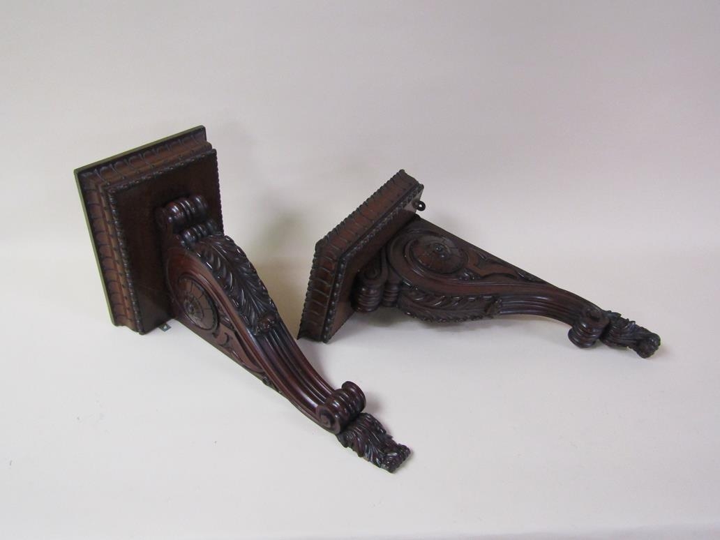 A pair of 19c mahogany wall brackets, the platform with carved edge supported on carved scroll and leaf brackets, 57cm h, bracket platforms 27cm l, 32cm d.