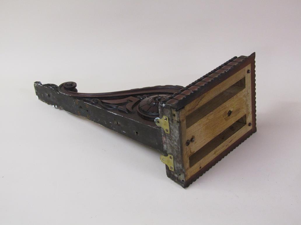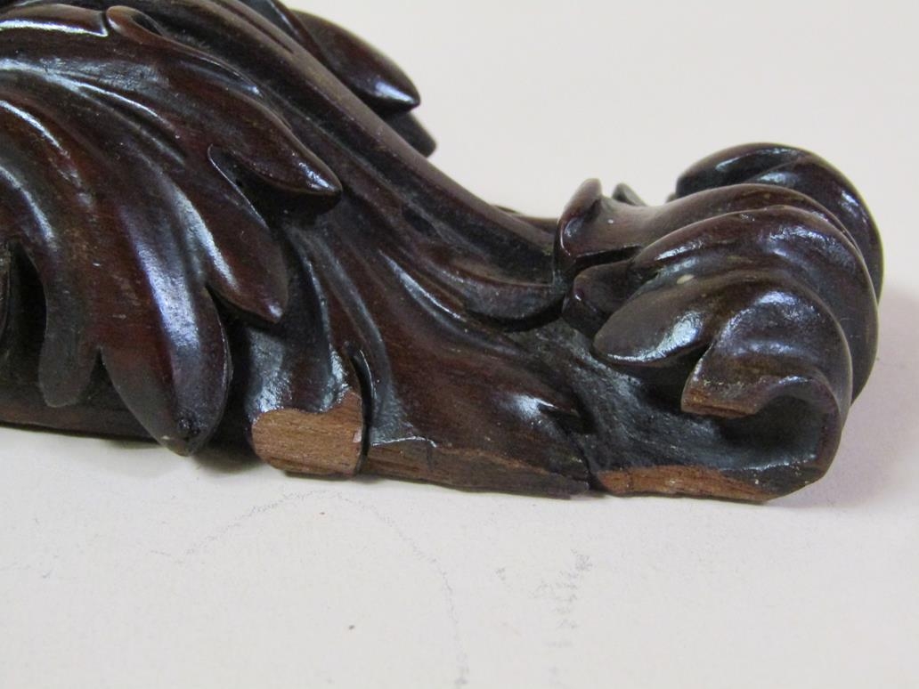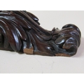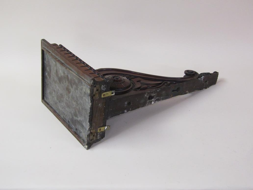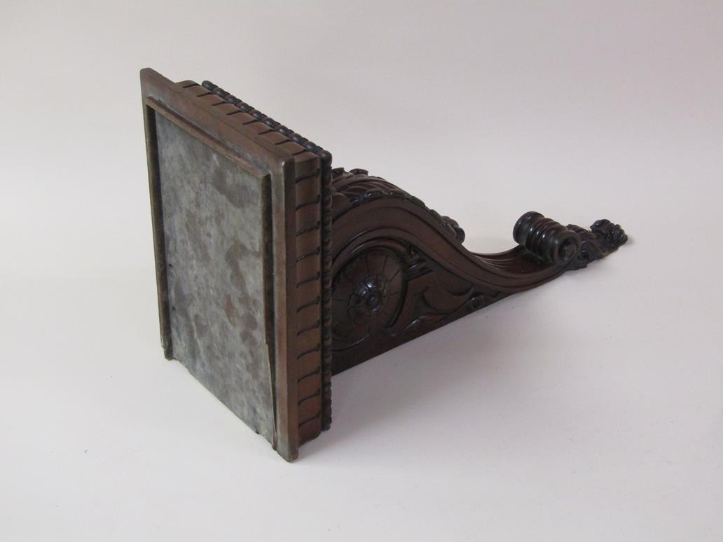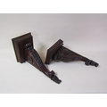 A pair of 19c mahogany wall brackets, the platform with carved edge supported on carved scroll and leaf brackets, 57cm h, bracket platforms 27cm l, 32cm d.