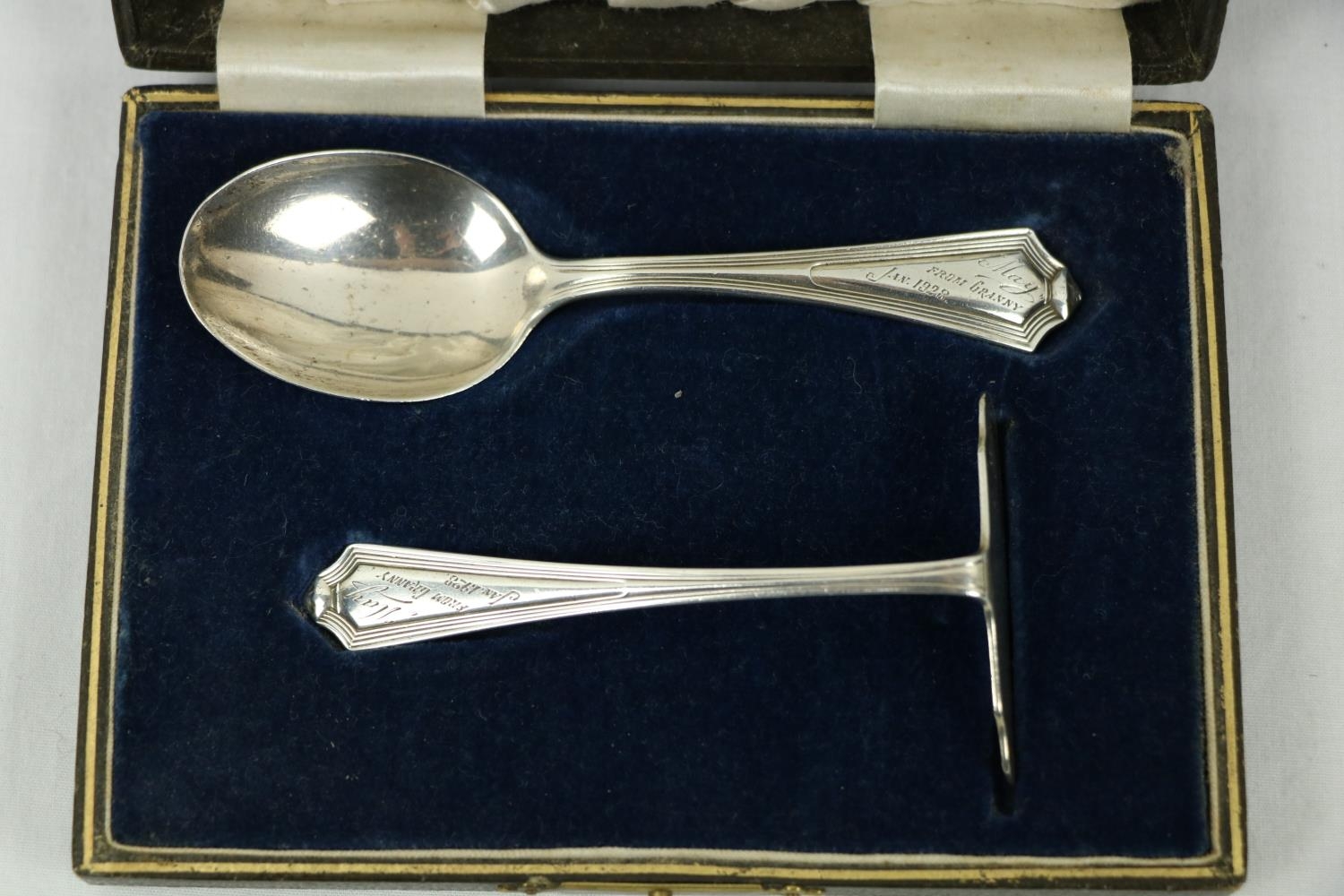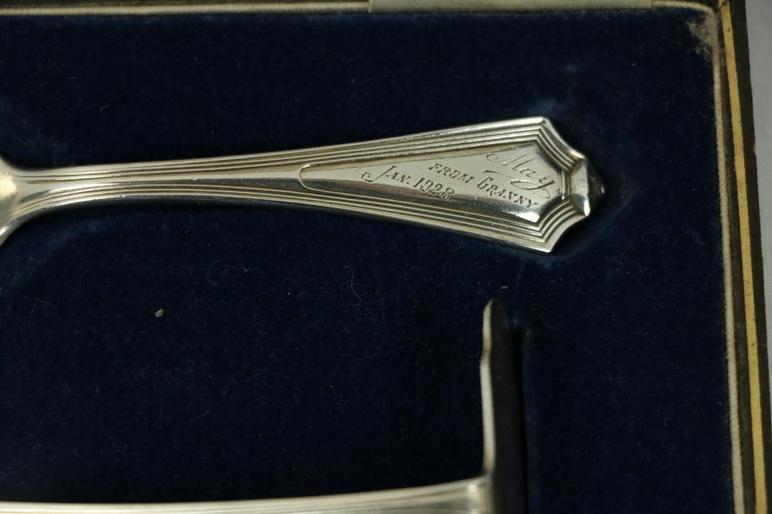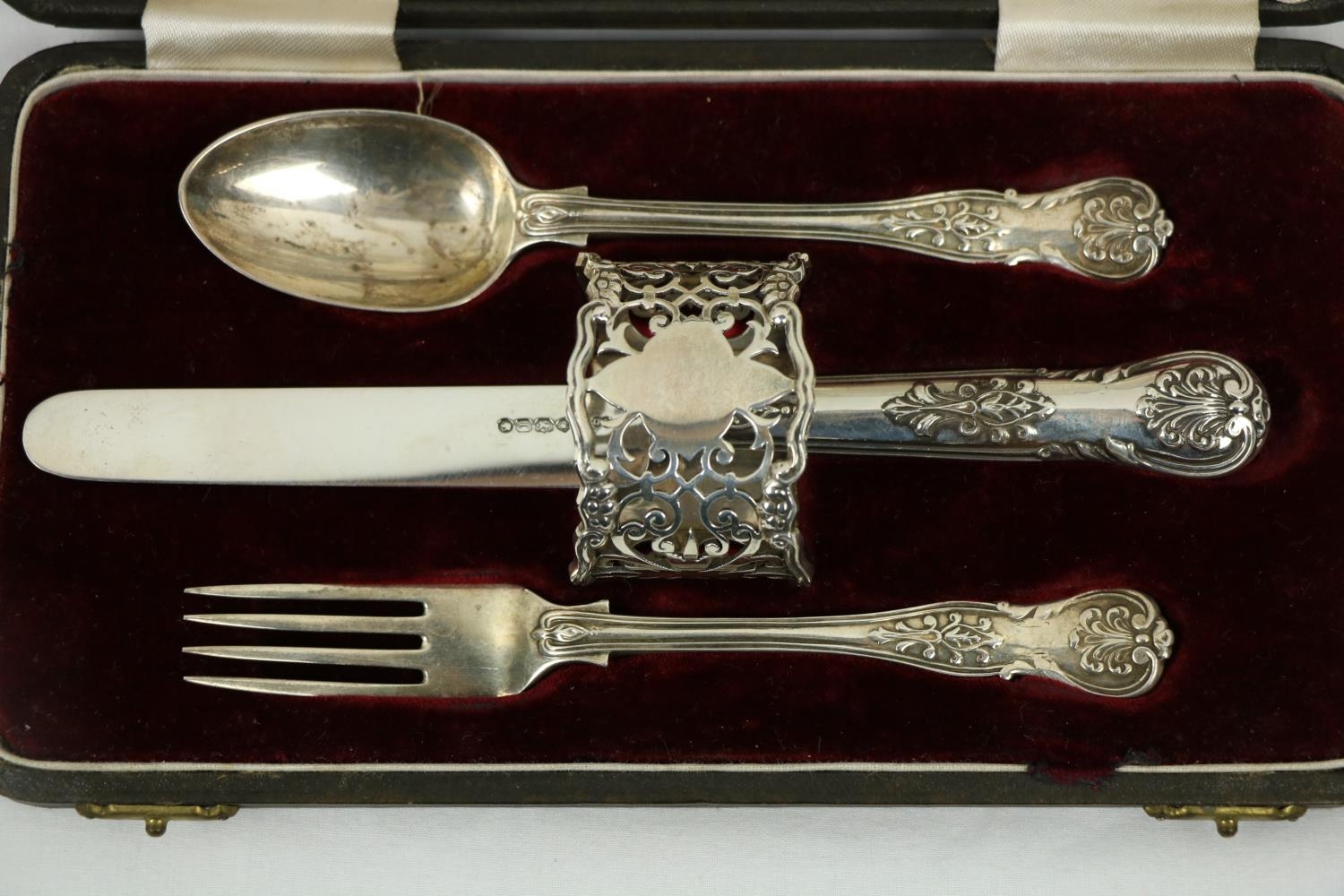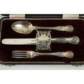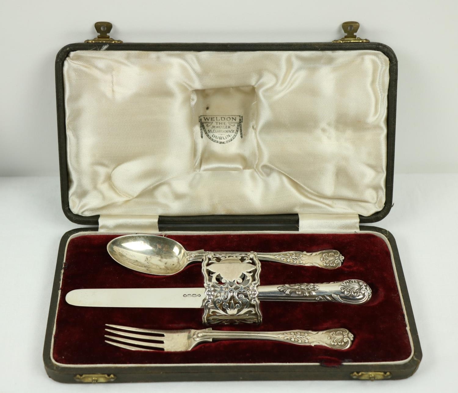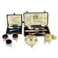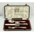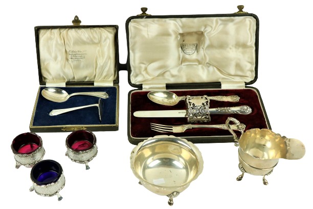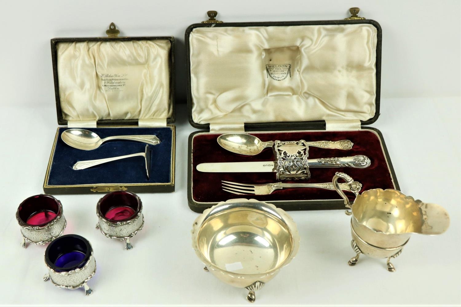 A Victorian silver Set, knife, fork, spoon and napkin, London c. 1858, in original case with label of Weldon, Jewelers, Dublin; a small Irish silver Sugar & Cream, c. 1902; a matching set of three small Birmingham silver Salts with engraved bodies and coloured glass liners; and a cased silver spoon and pusher. As a lot, w.a.f. (1)