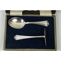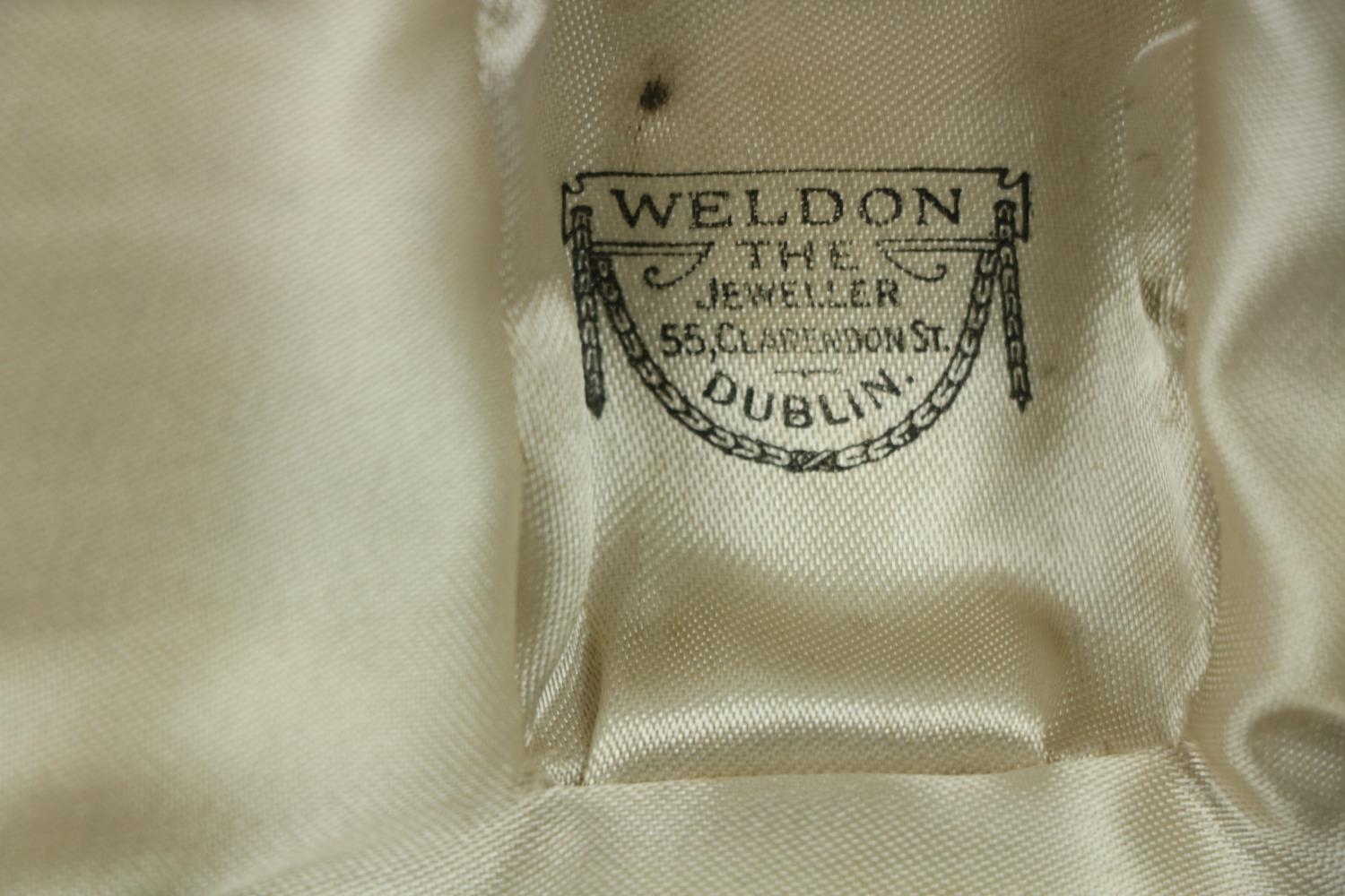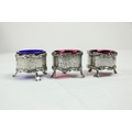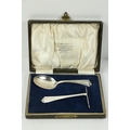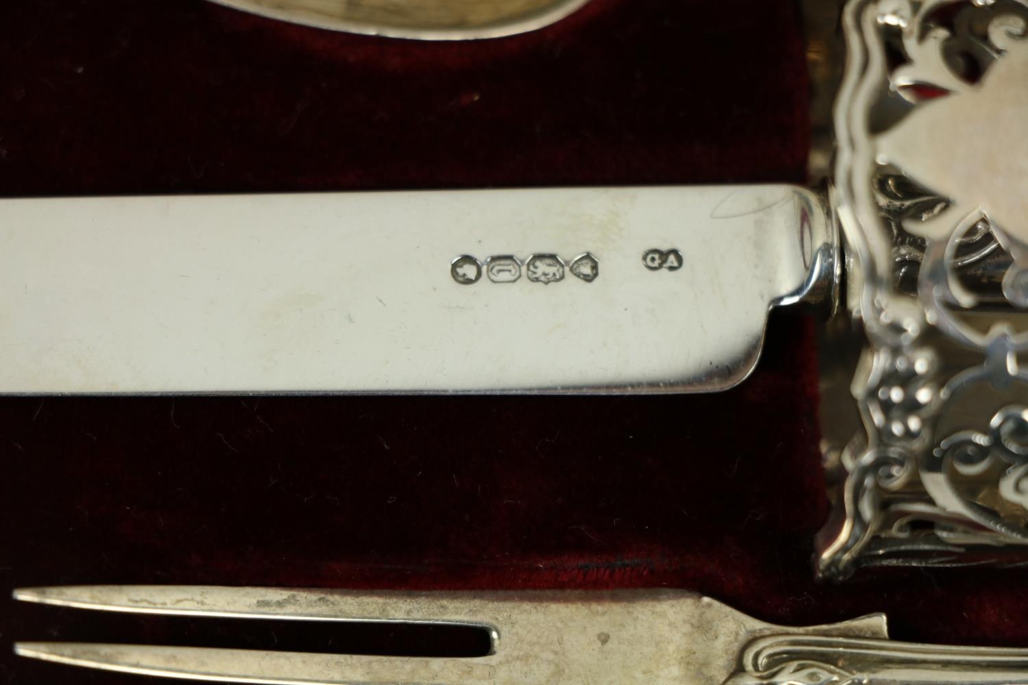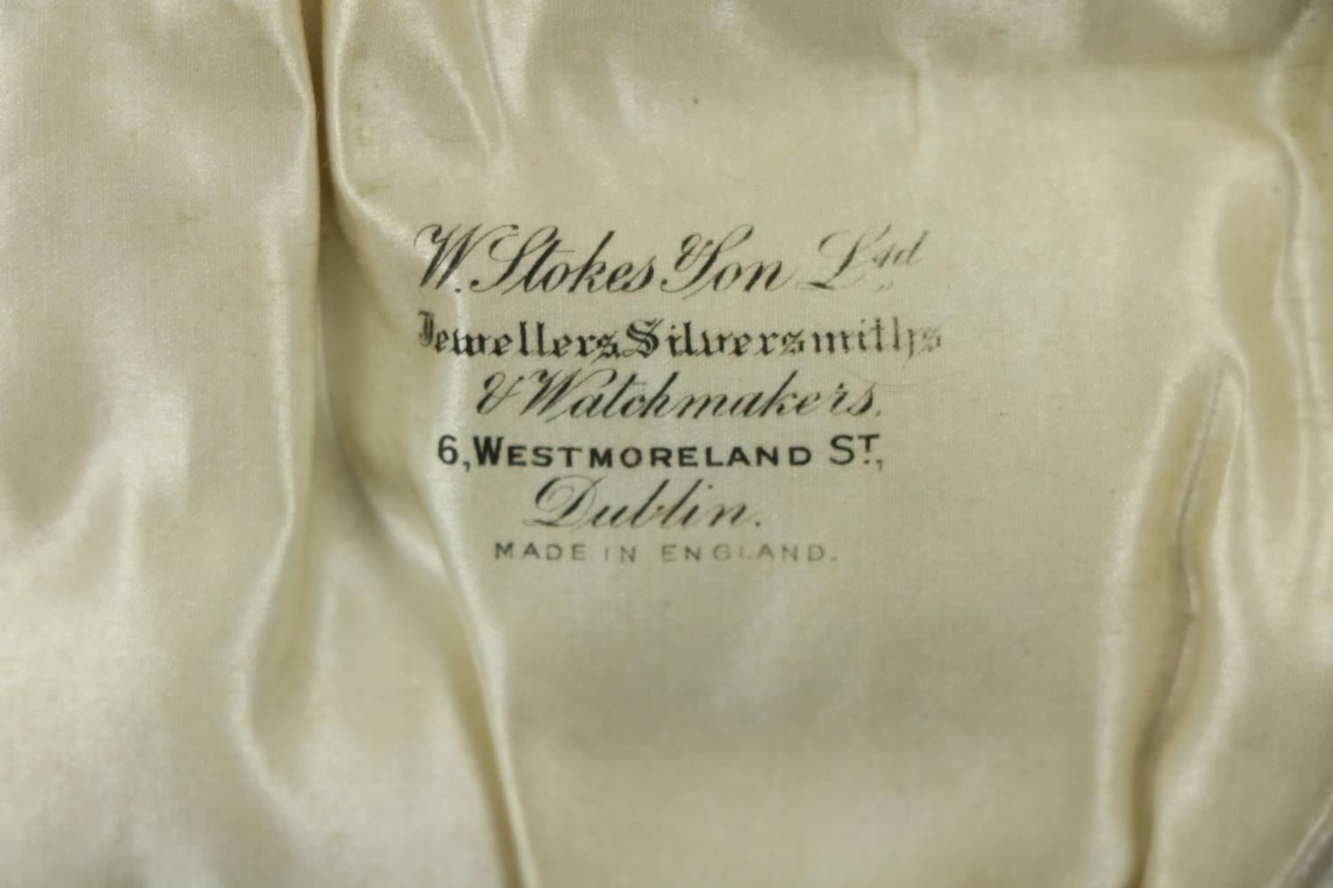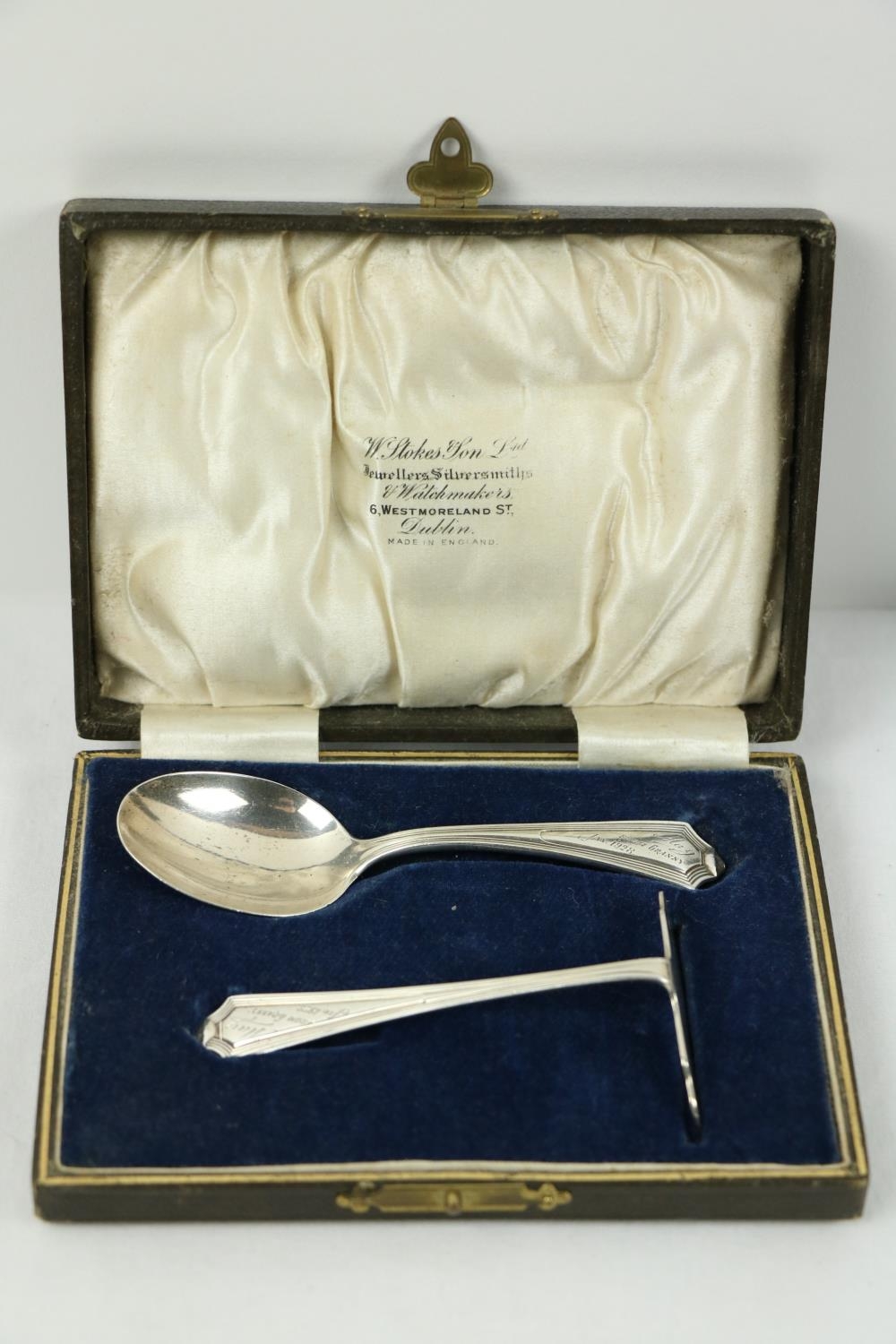 A Victorian silver Set, knife, fork, spoon and napkin, London c. 1858, in original case with label of Weldon, Jewelers, Dublin; a small Irish silver Sugar & Cream, c. 1902; a matching set of three small Birmingham silver Salts with engraved bodies and coloured glass liners; and a cased silver spoon and pusher. As a lot, w.a.f. (1)