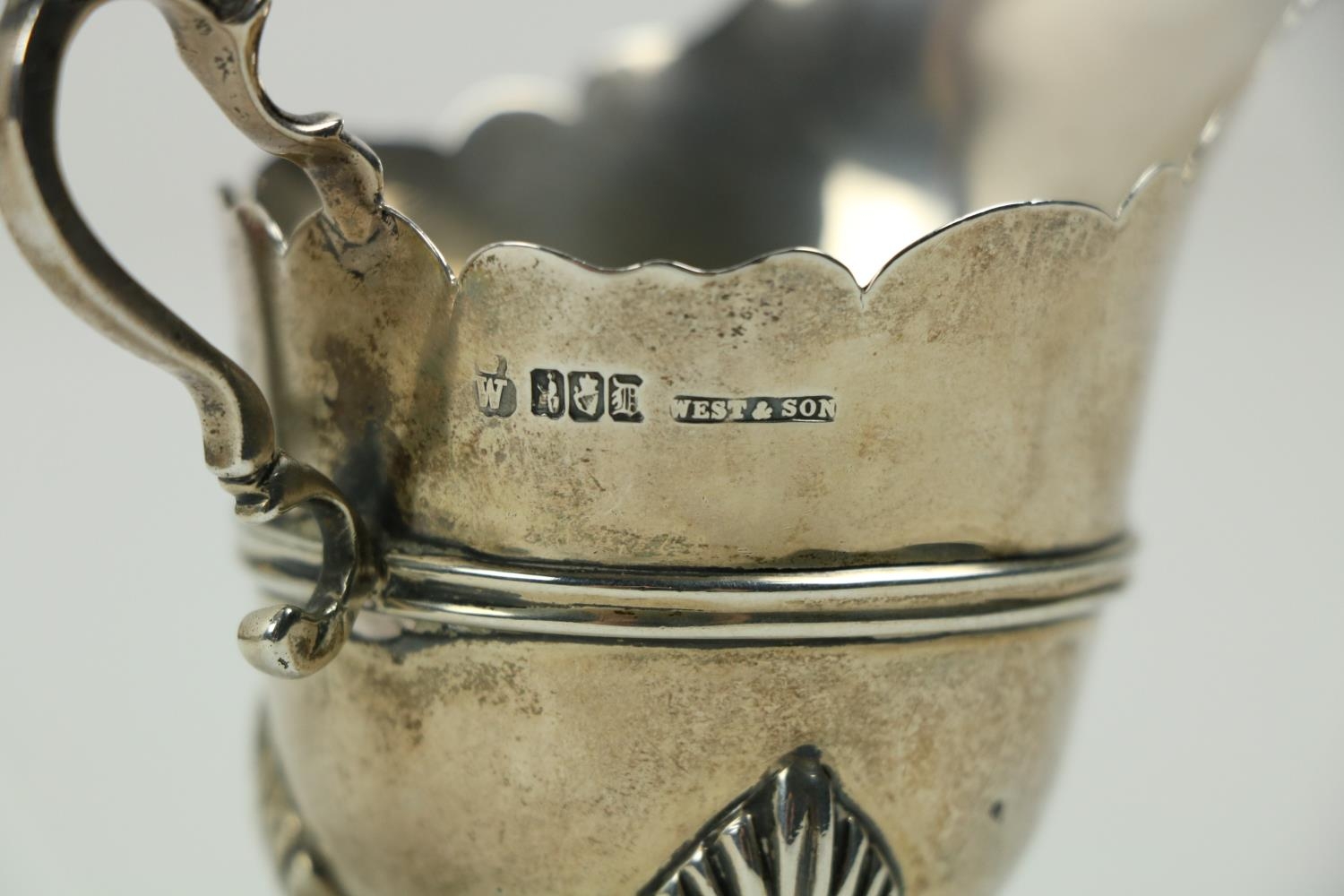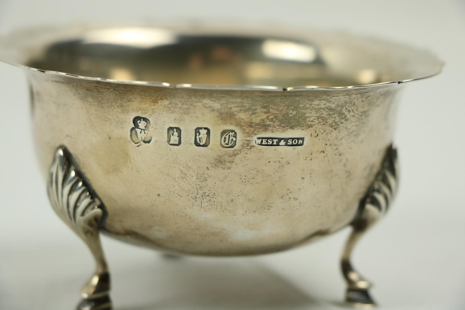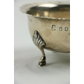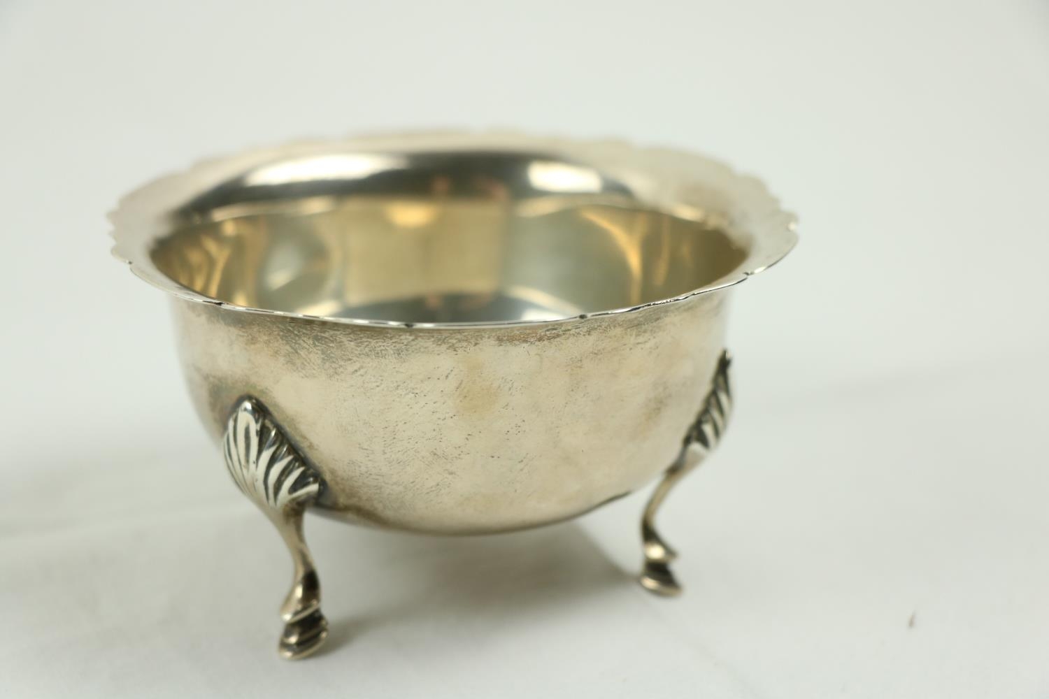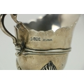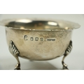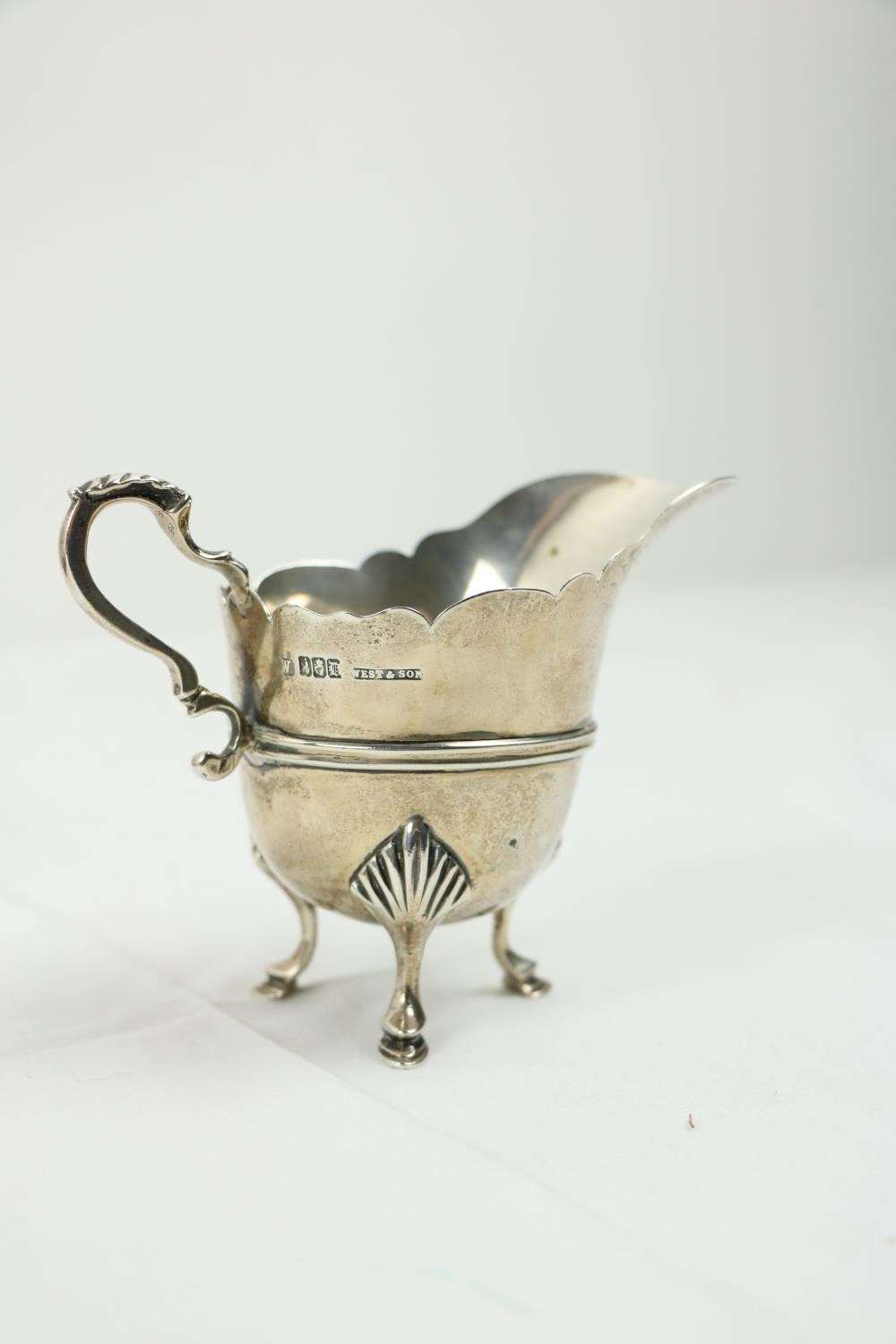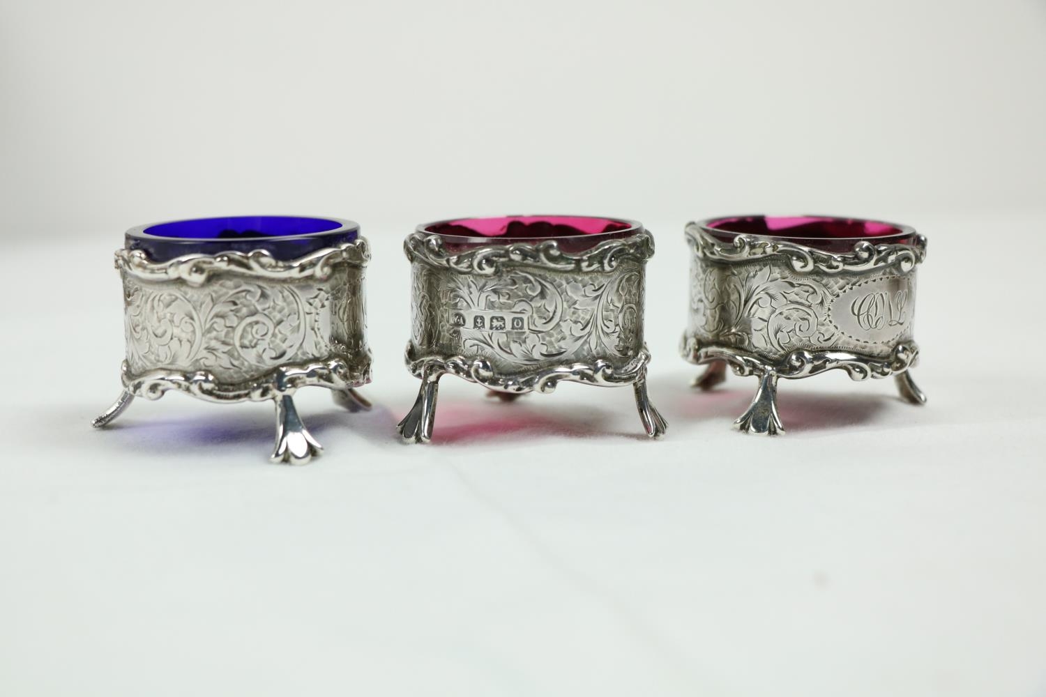 A Victorian silver Set, knife, fork, spoon and napkin, London c. 1858, in original case with label of Weldon, Jewelers, Dublin; a small Irish silver Sugar & Cream, c. 1902; a matching set of three small Birmingham silver Salts with engraved bodies and coloured glass liners; and a cased silver spoon and pusher. As a lot, w.a.f. (1)