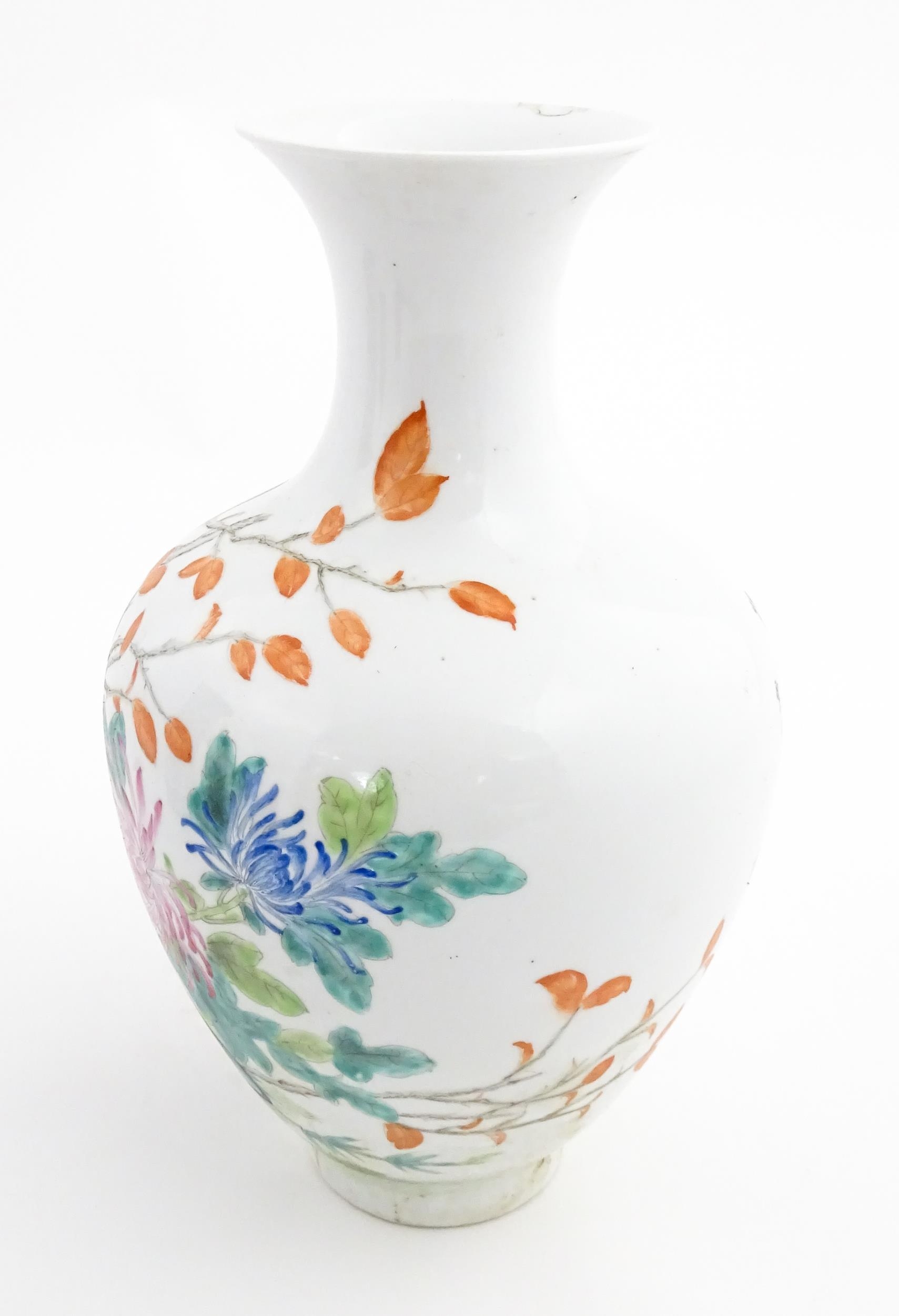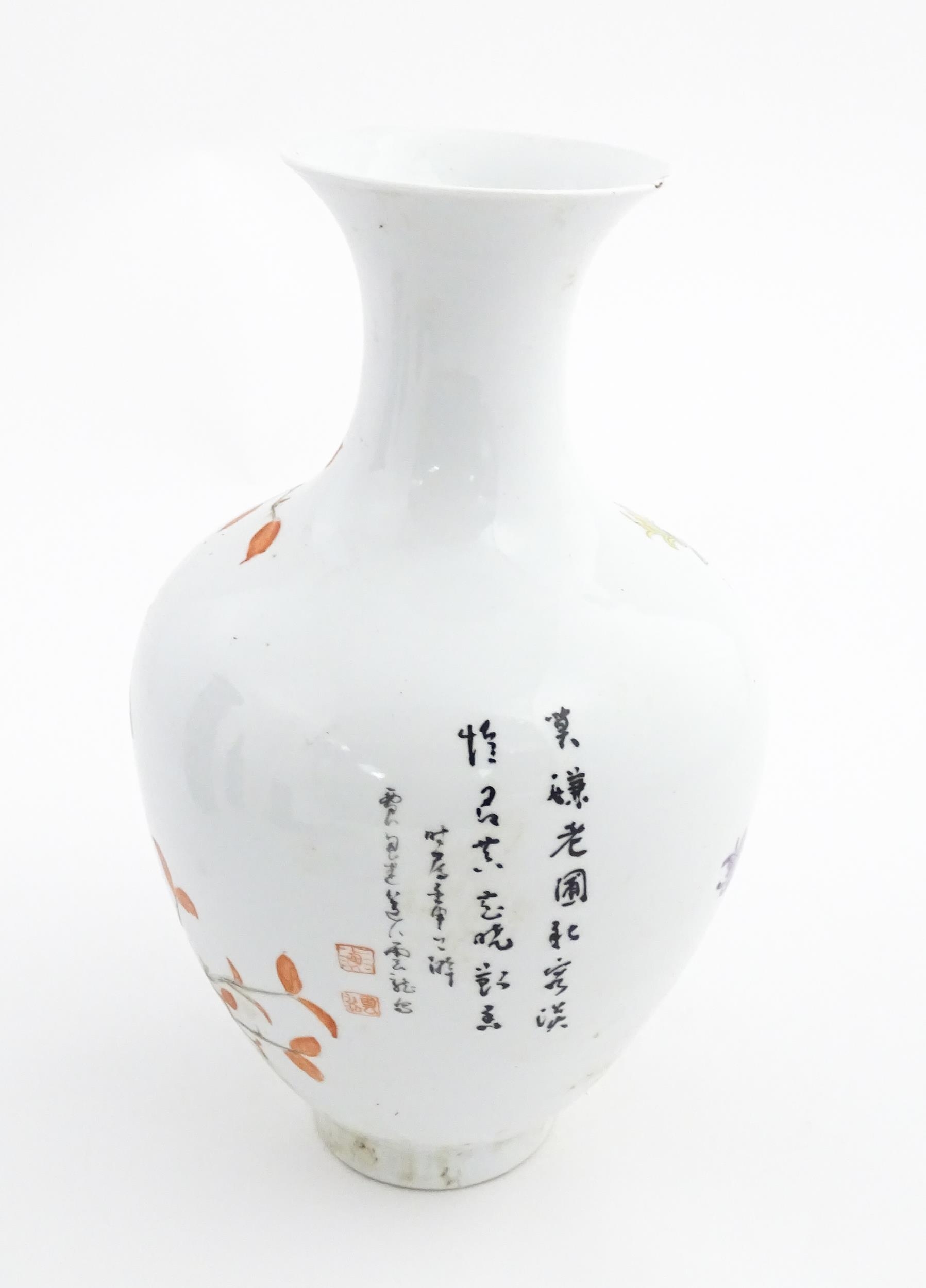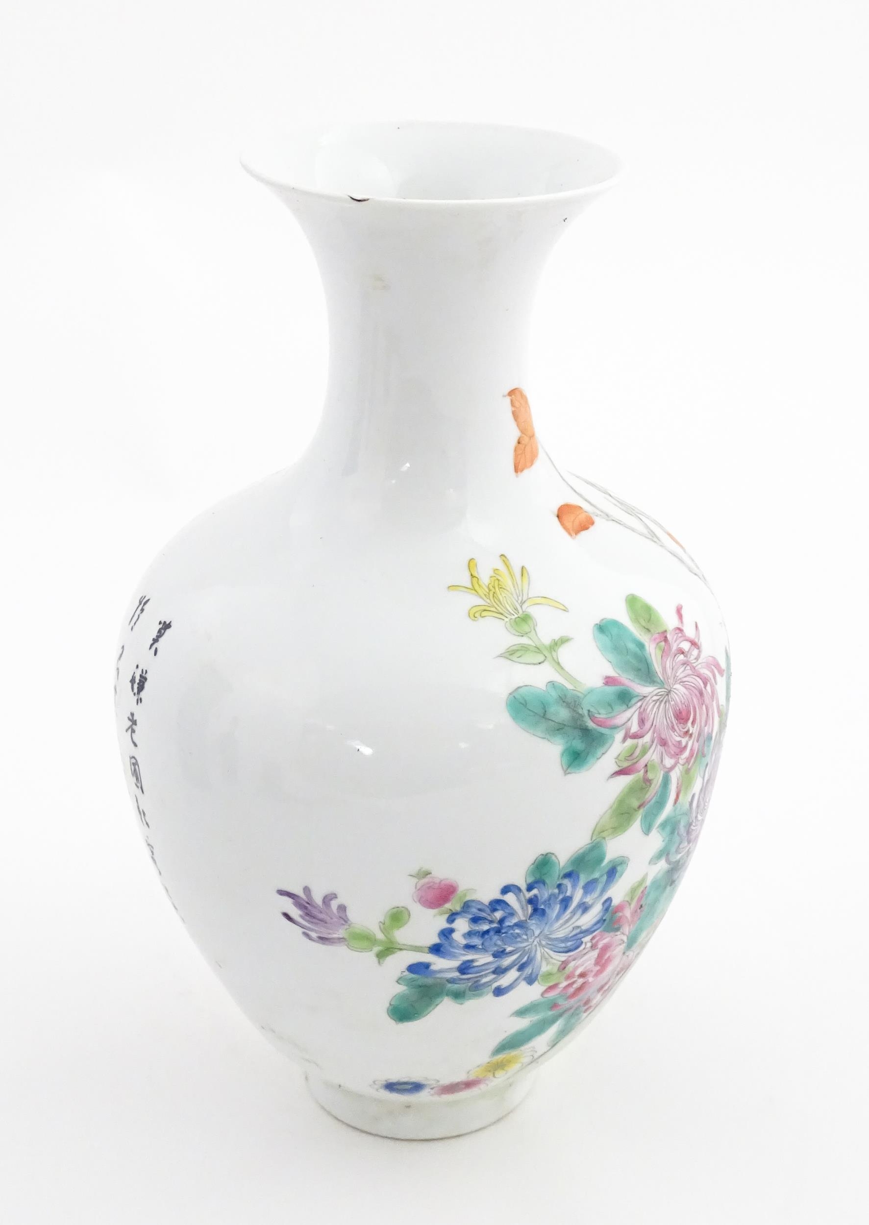 A Chinese famille rose baluster vase decorated with flowers and foliage, with Character script / poem to reverse. Character marks under. Approx. 12 1/2" high