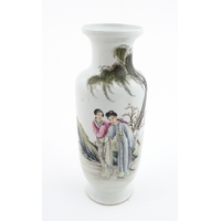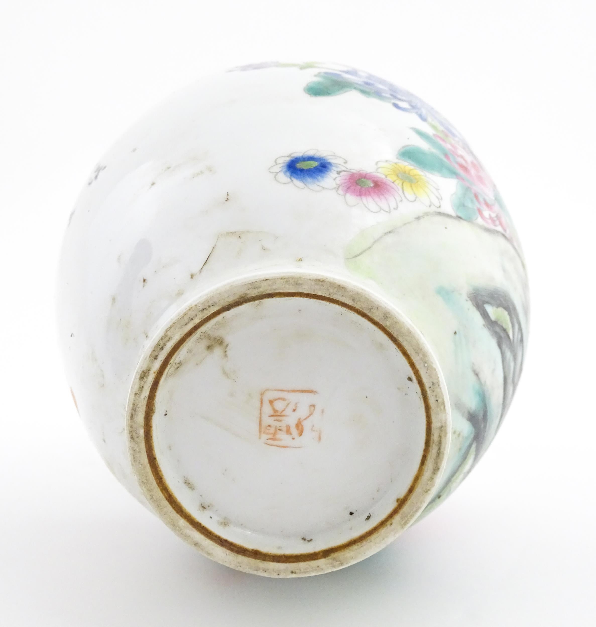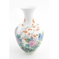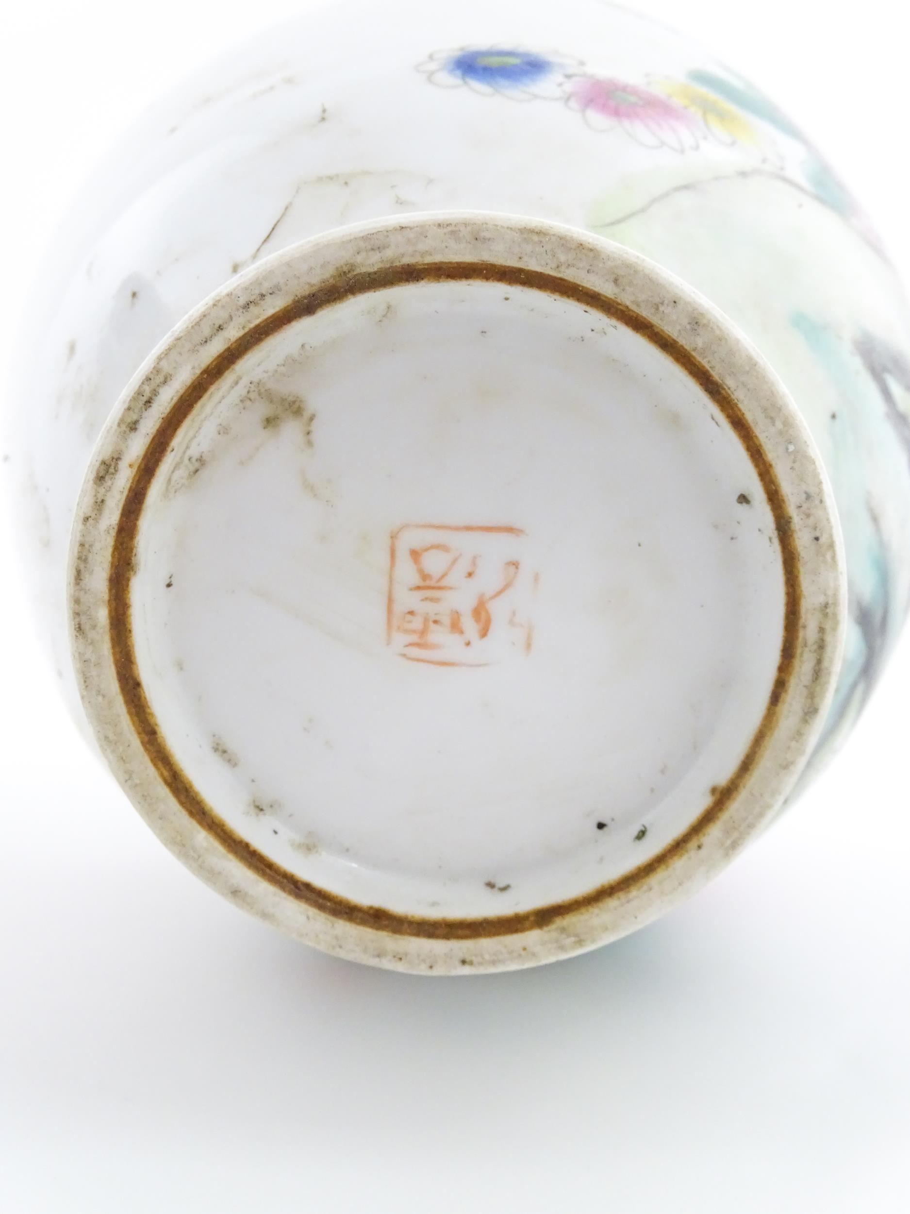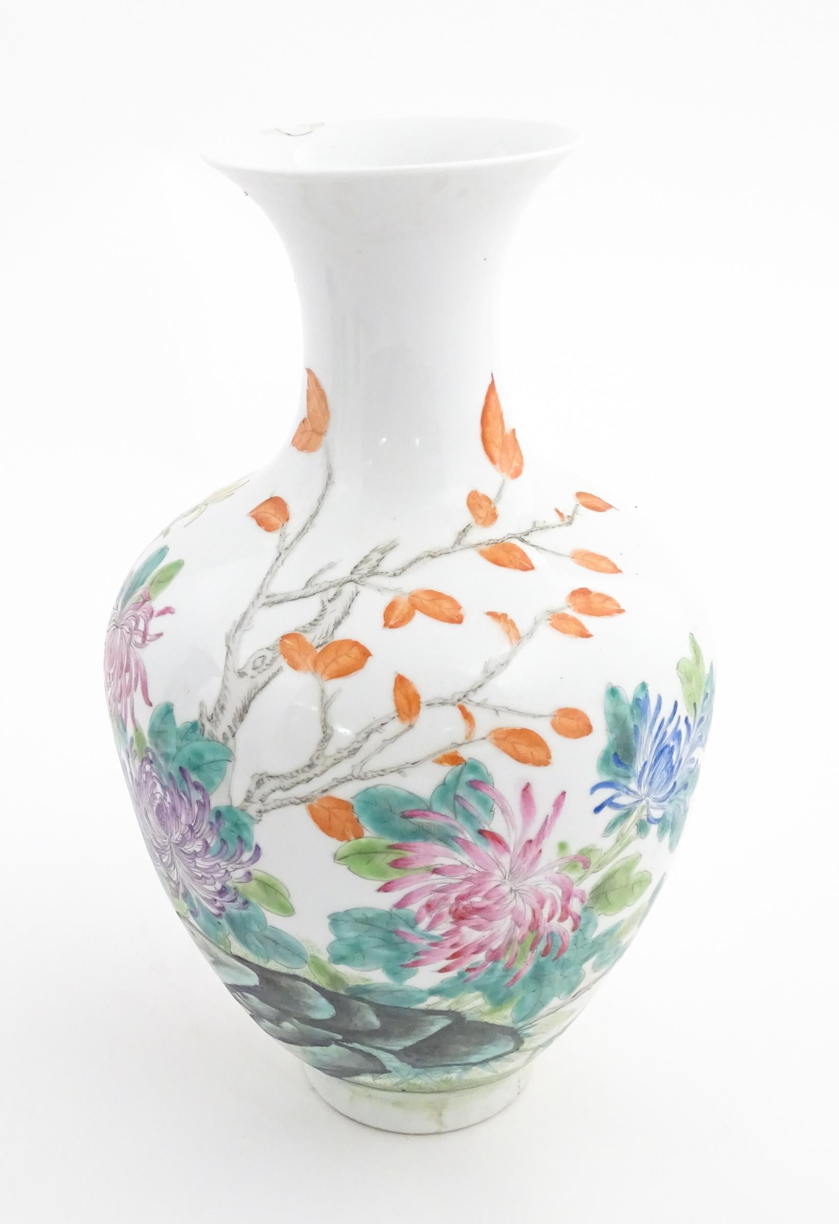 A Chinese famille rose baluster vase decorated with flowers and foliage, with Character script / poem to reverse. Character marks under. Approx. 12 1/2" high