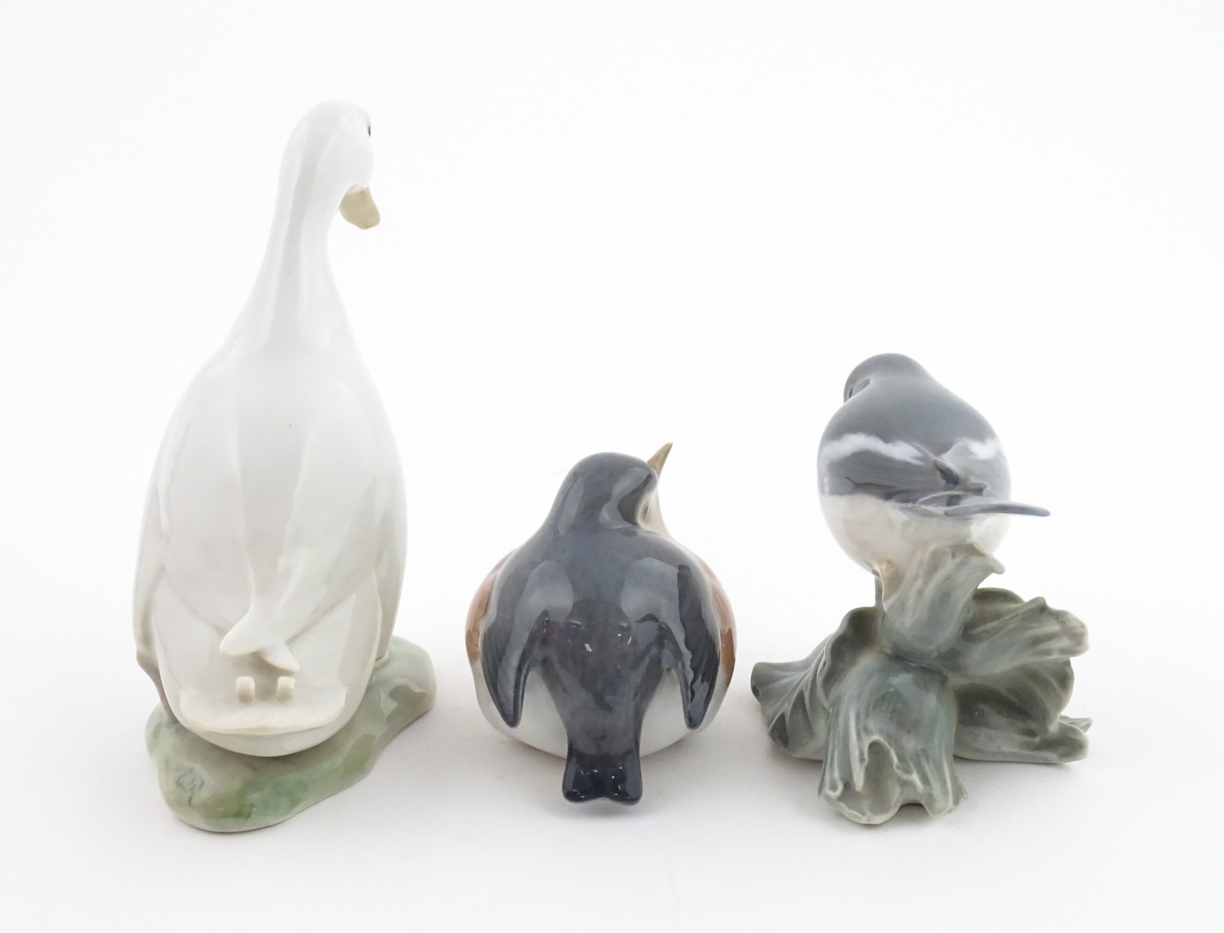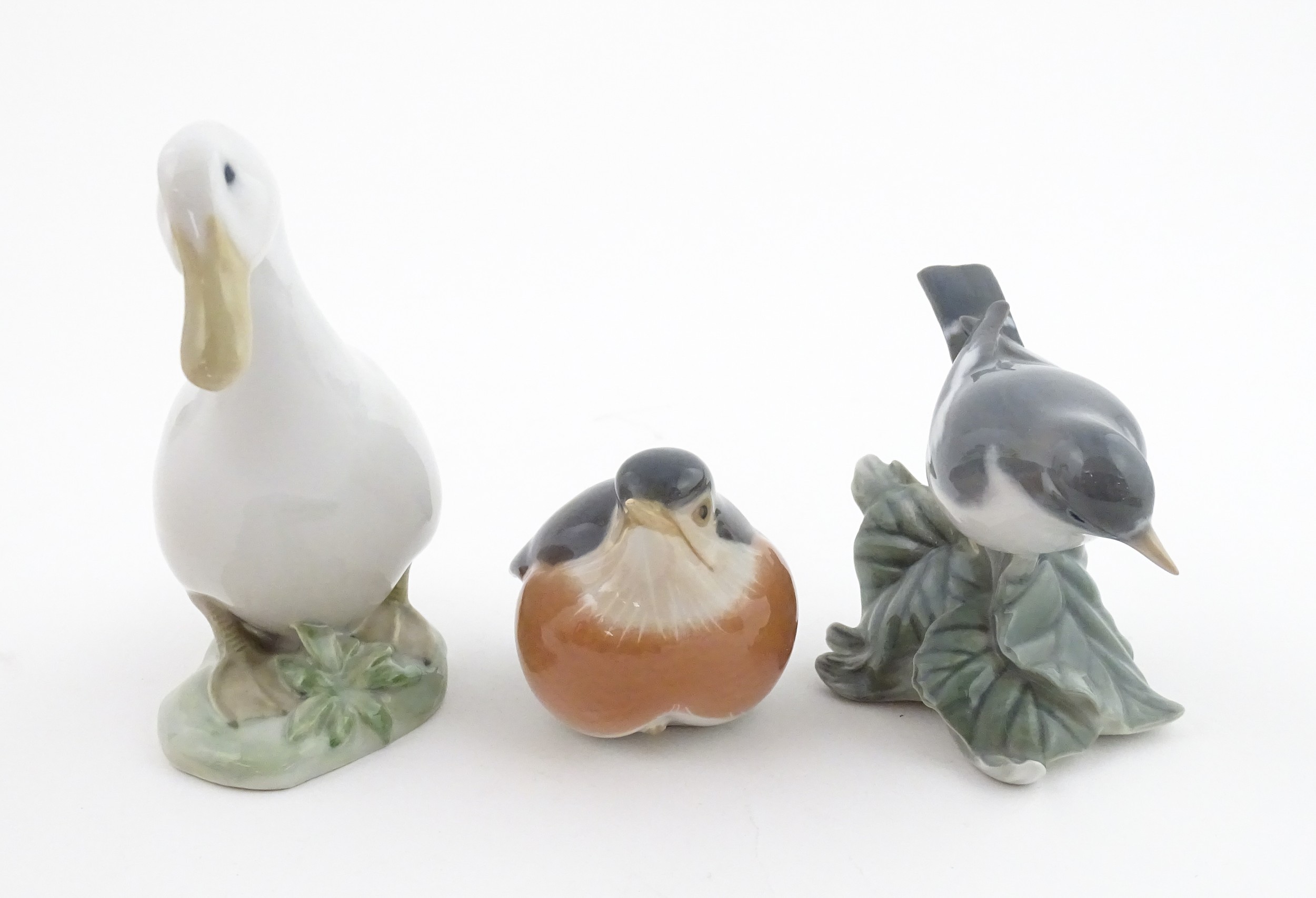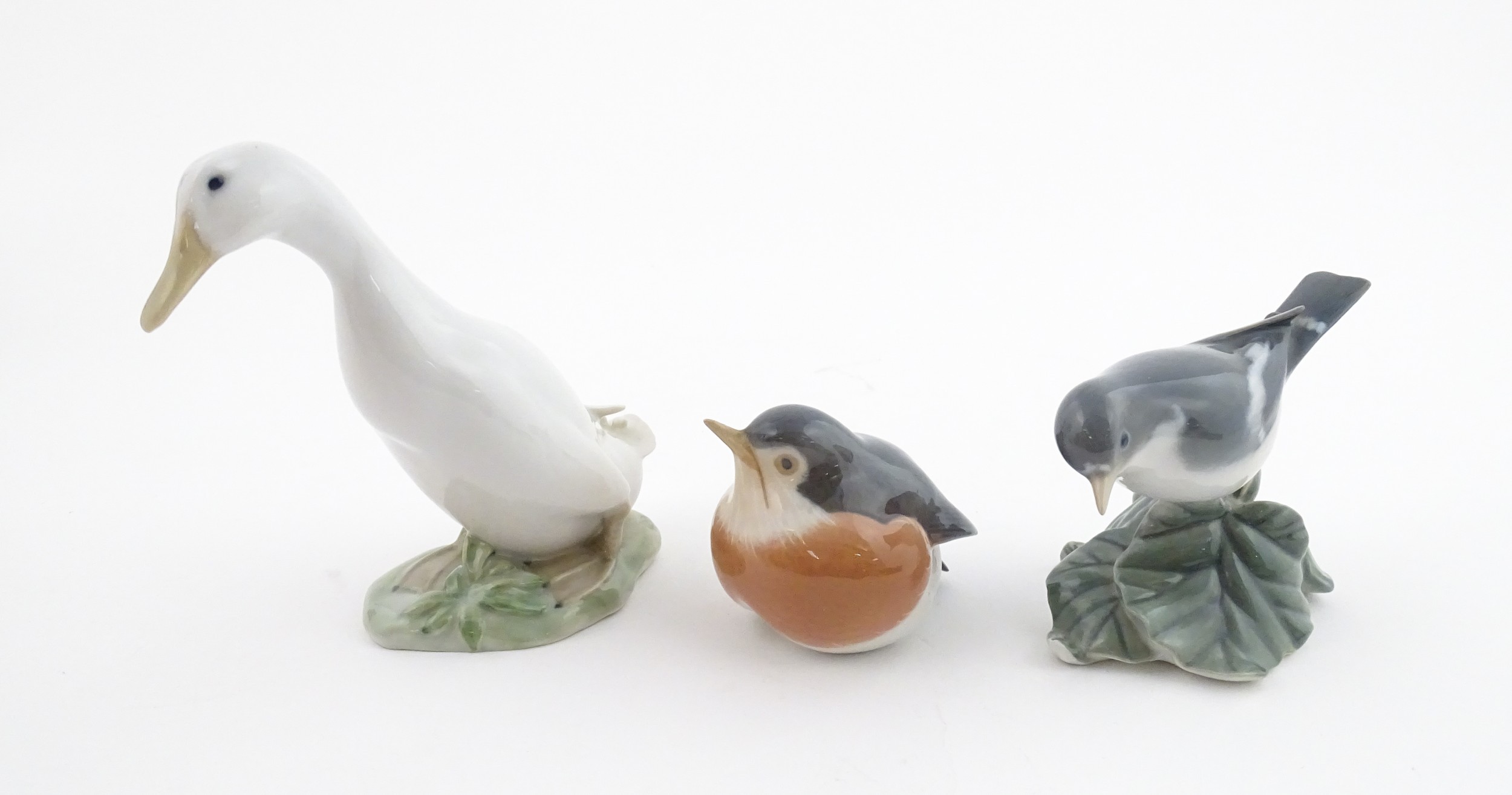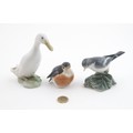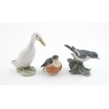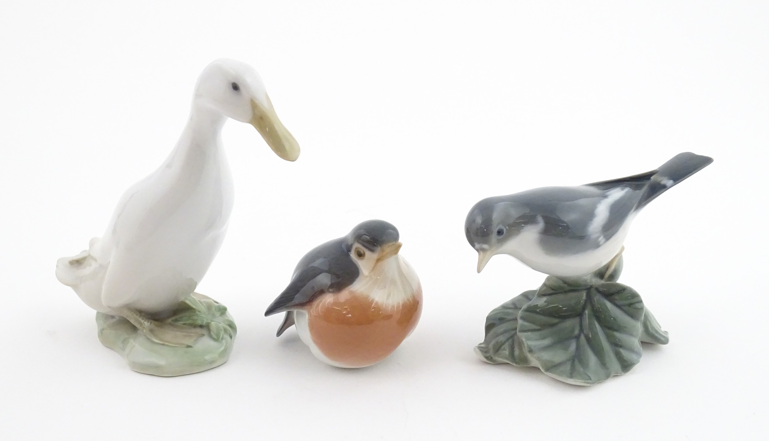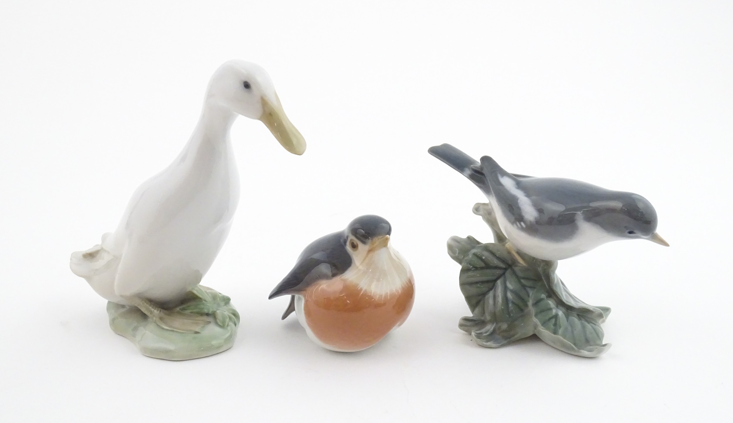 Three Royal Copenhagen models of birds comprising a Duck no. 2122, Robin no. 2266, and Flycatcher no. 2144. Marked under. Largest approx. 5 1/4" high (3)