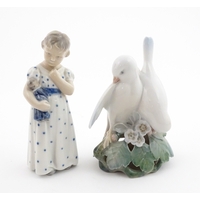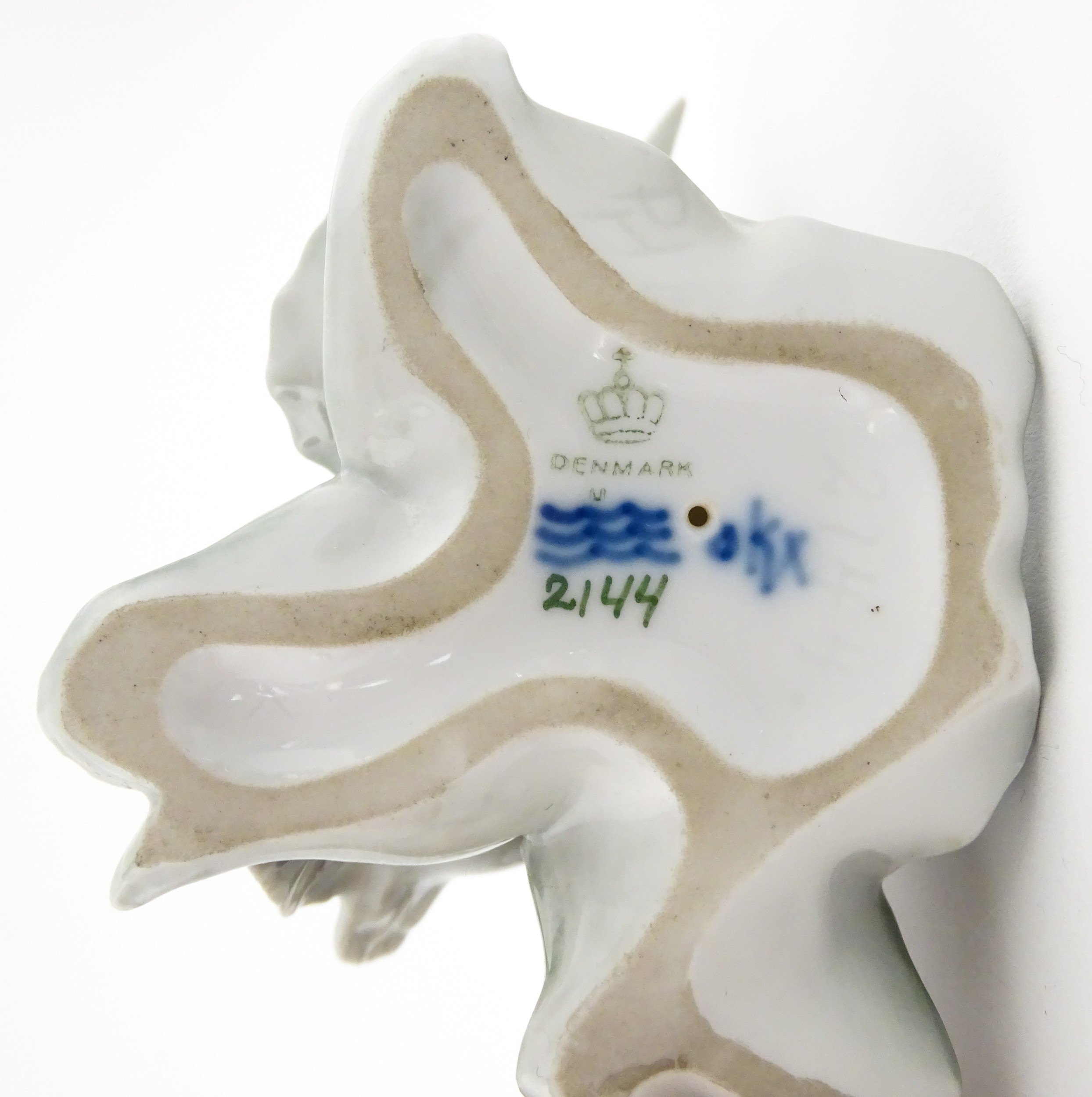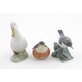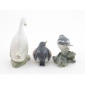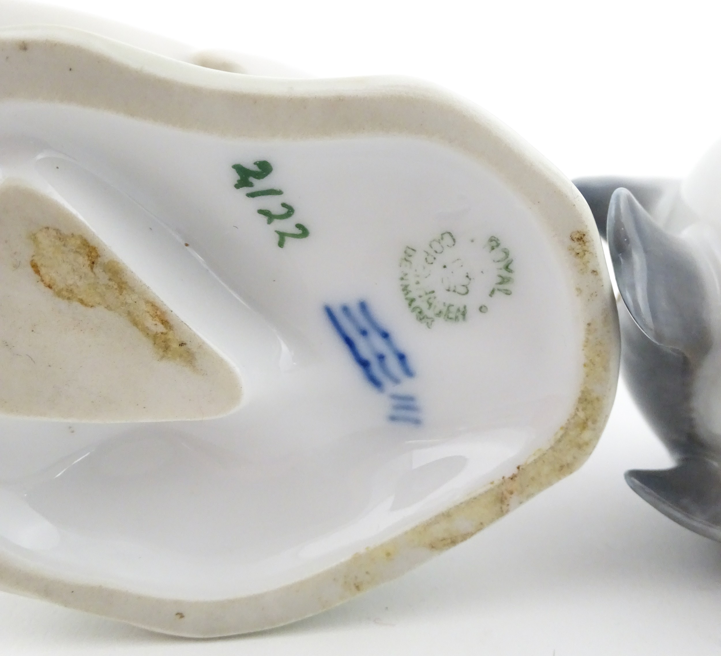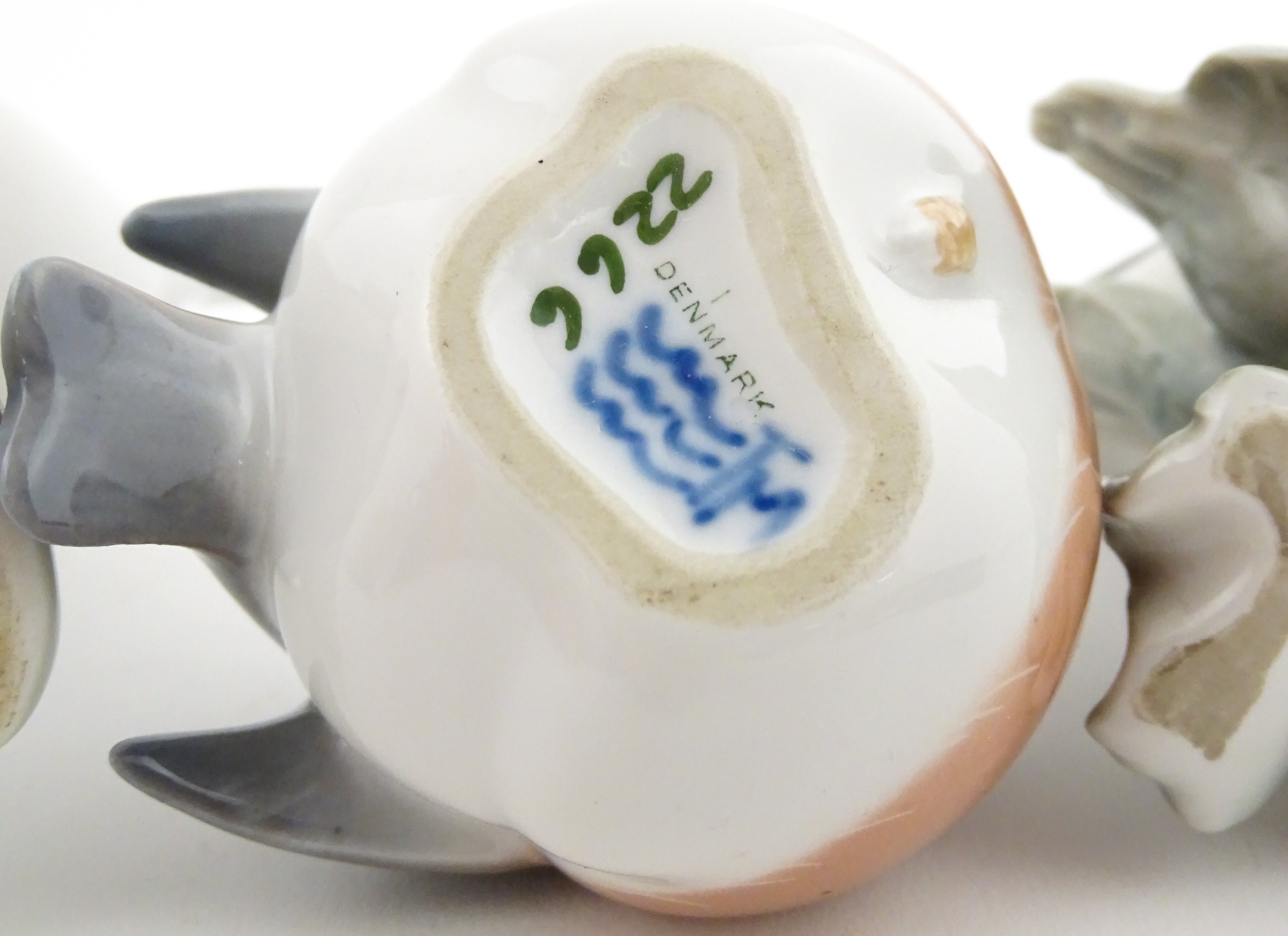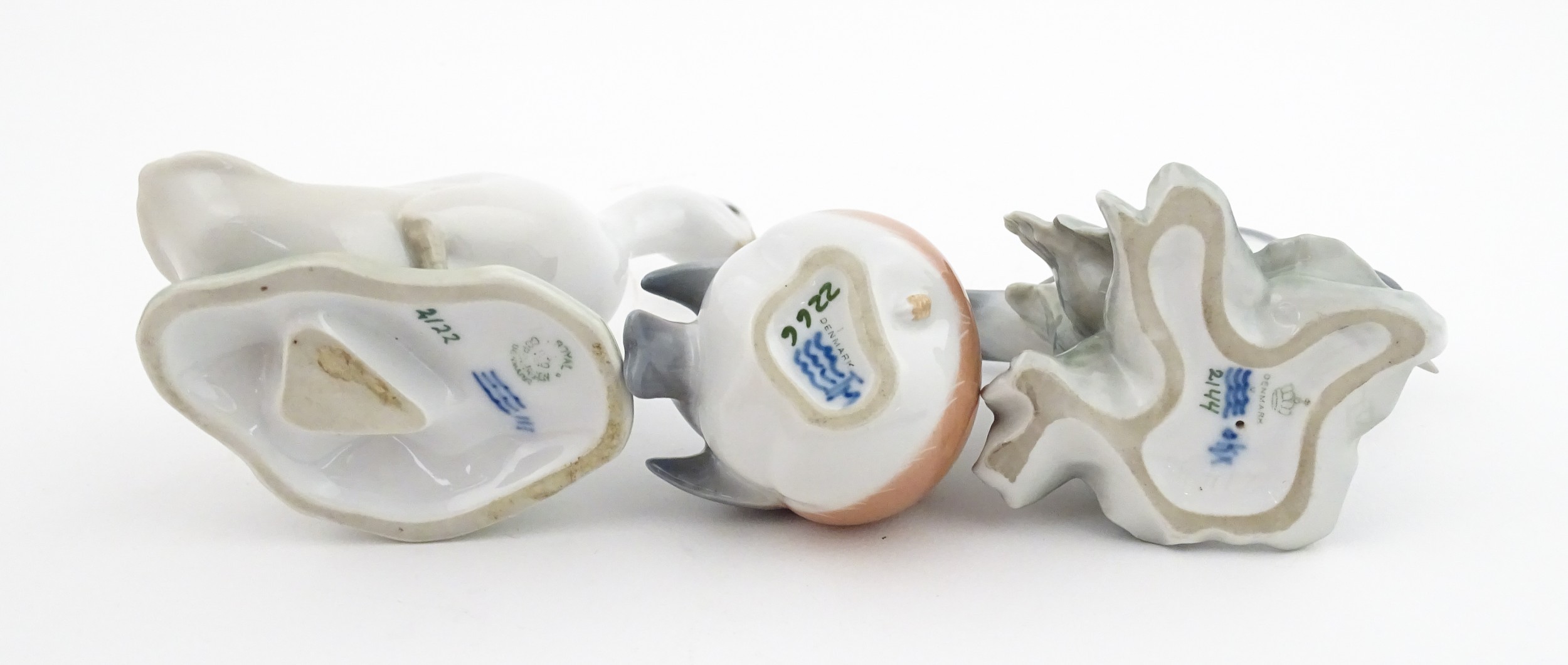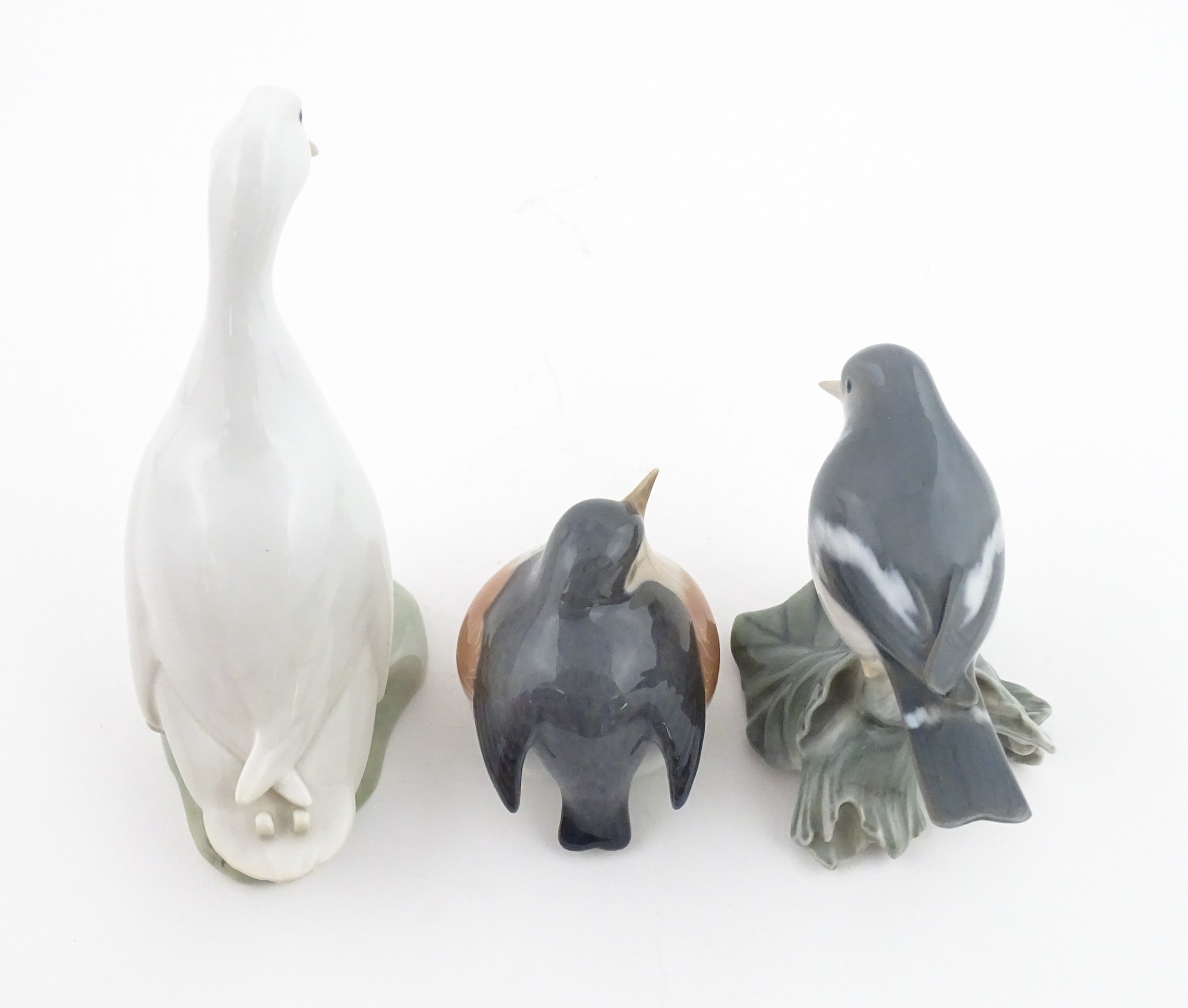 Three Royal Copenhagen models of birds comprising a Duck no. 2122, Robin no. 2266, and Flycatcher no. 2144. Marked under. Largest approx. 5 1/4" high (3)
