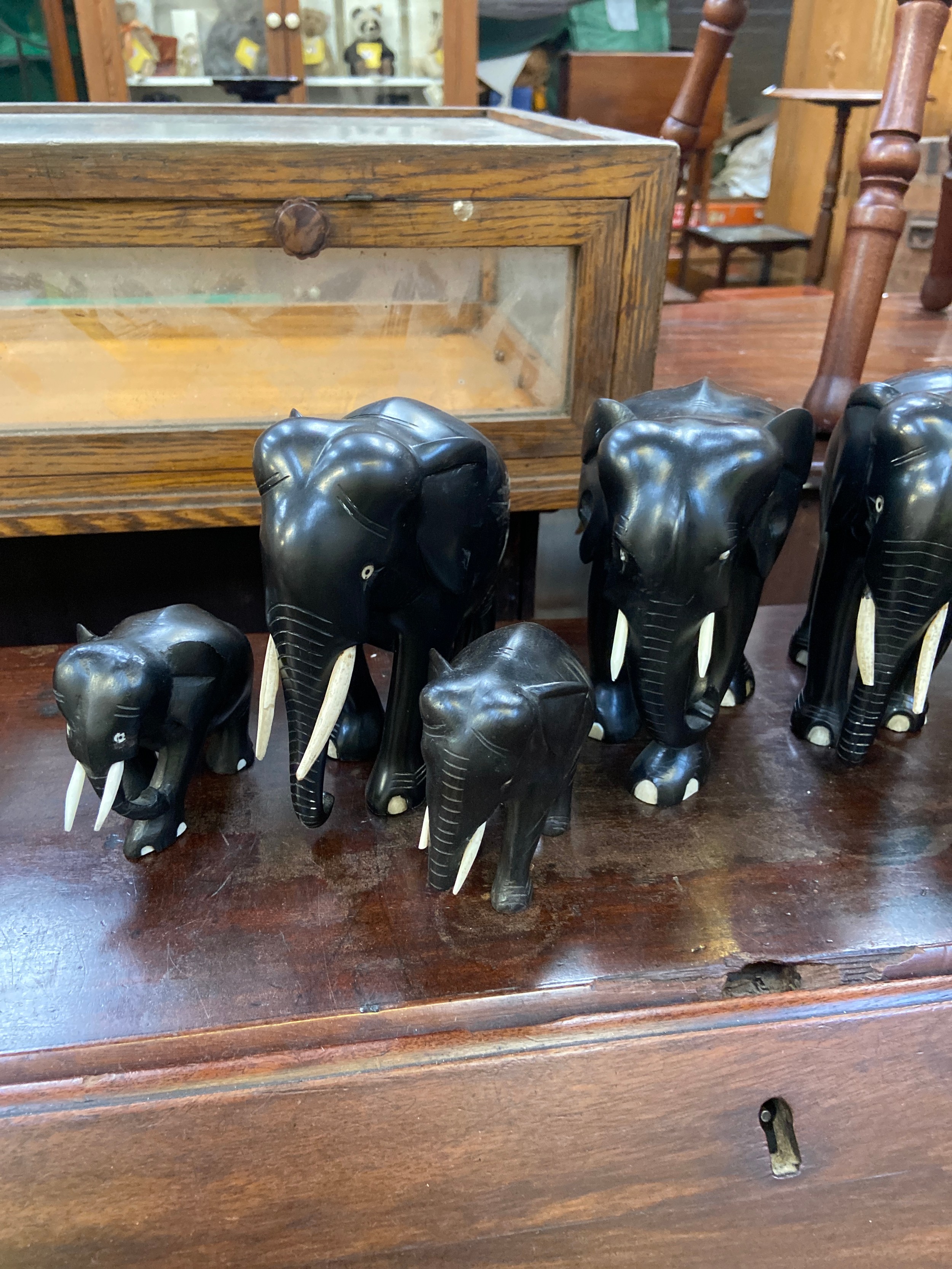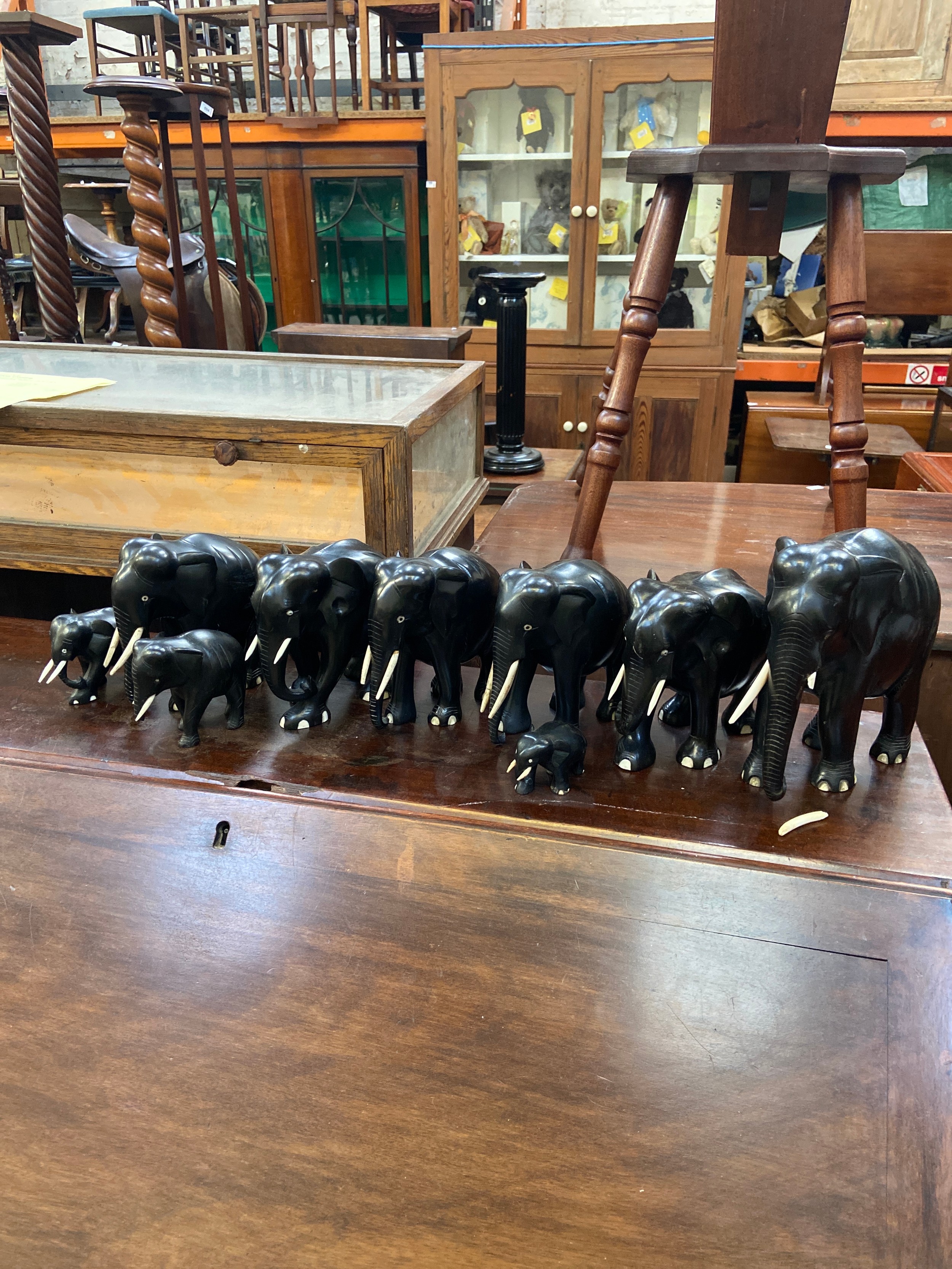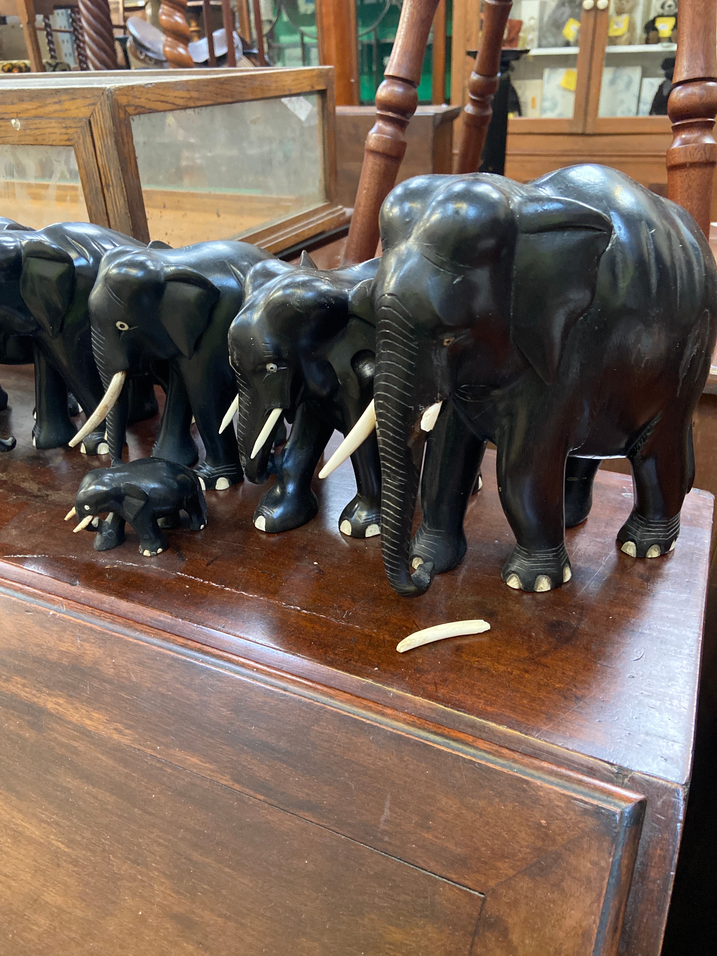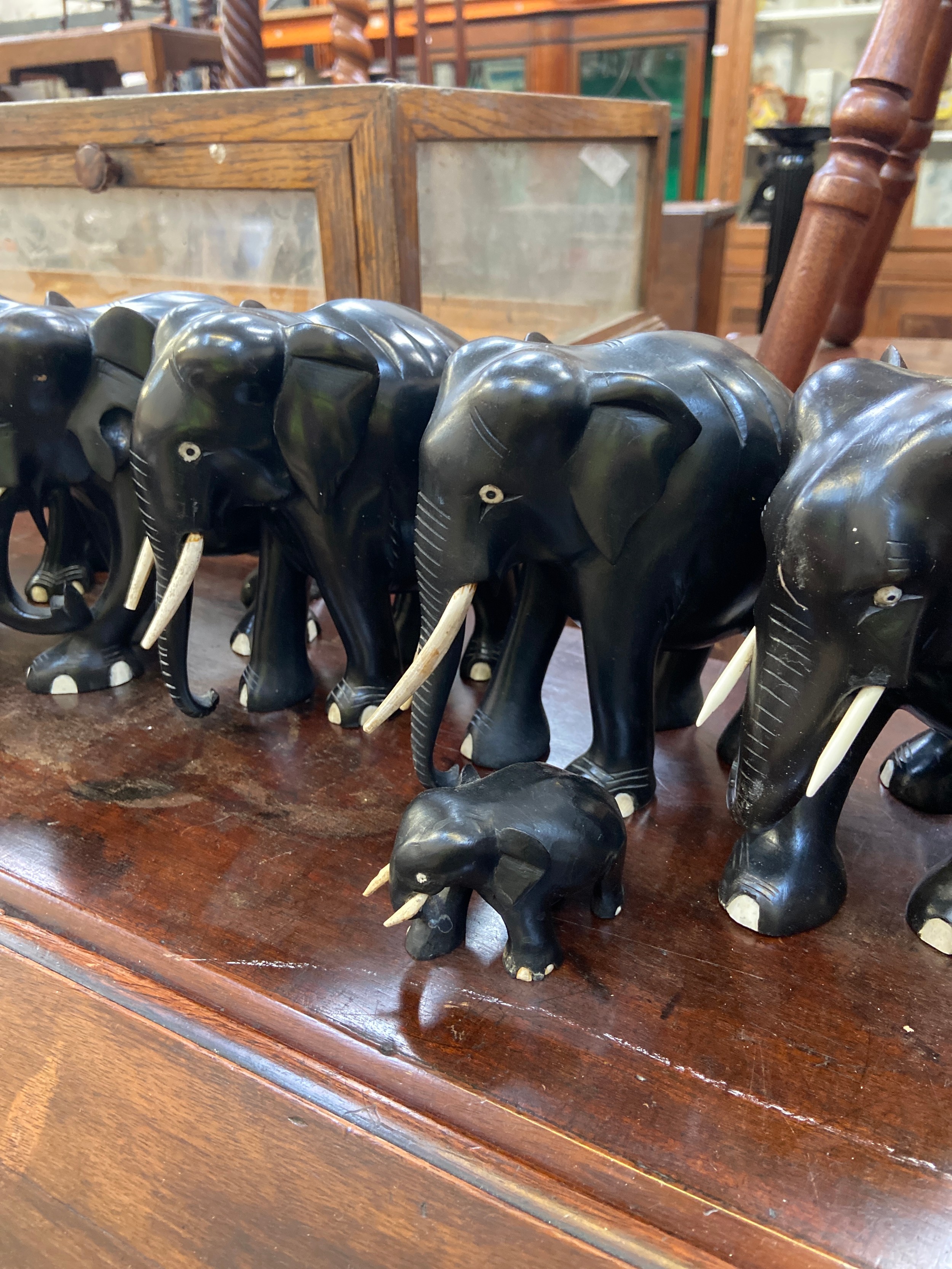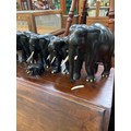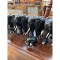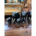 A family of 9x carved ebony elephant sculptures.