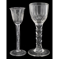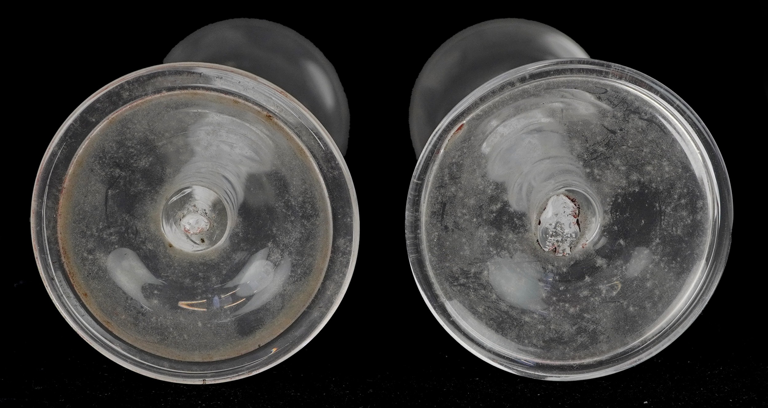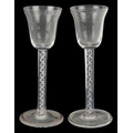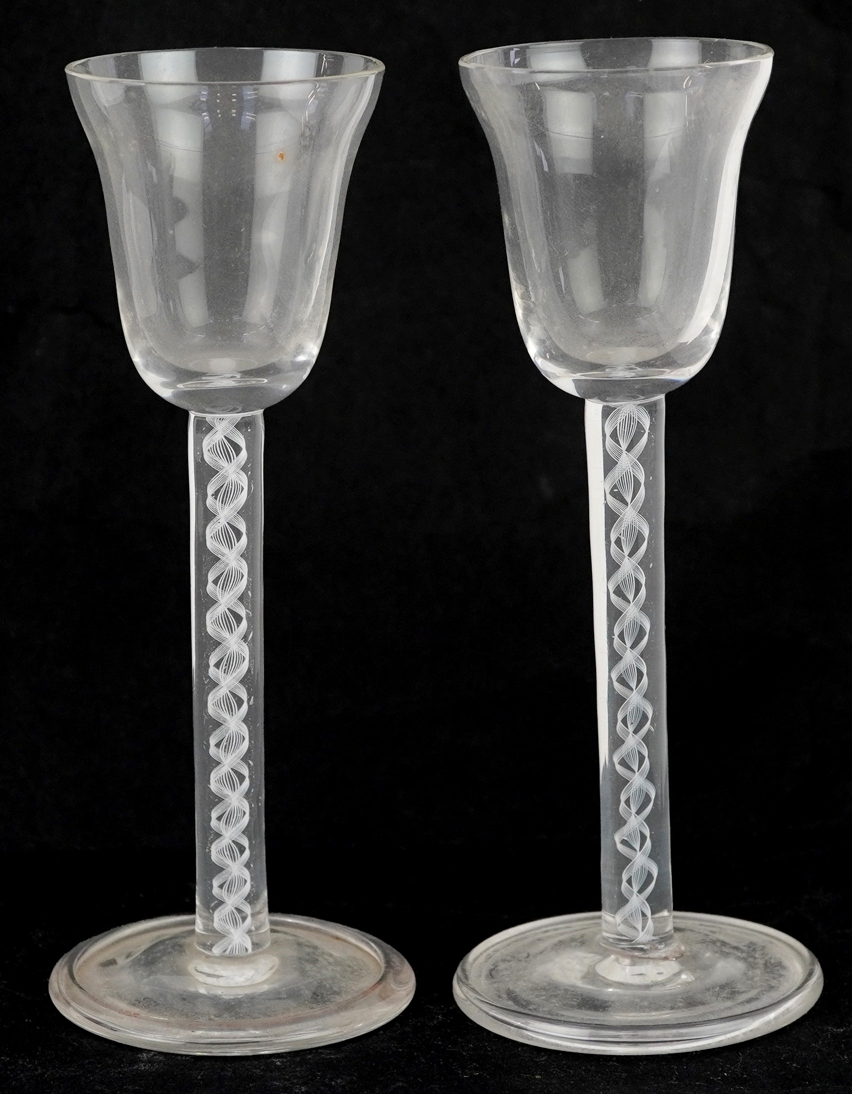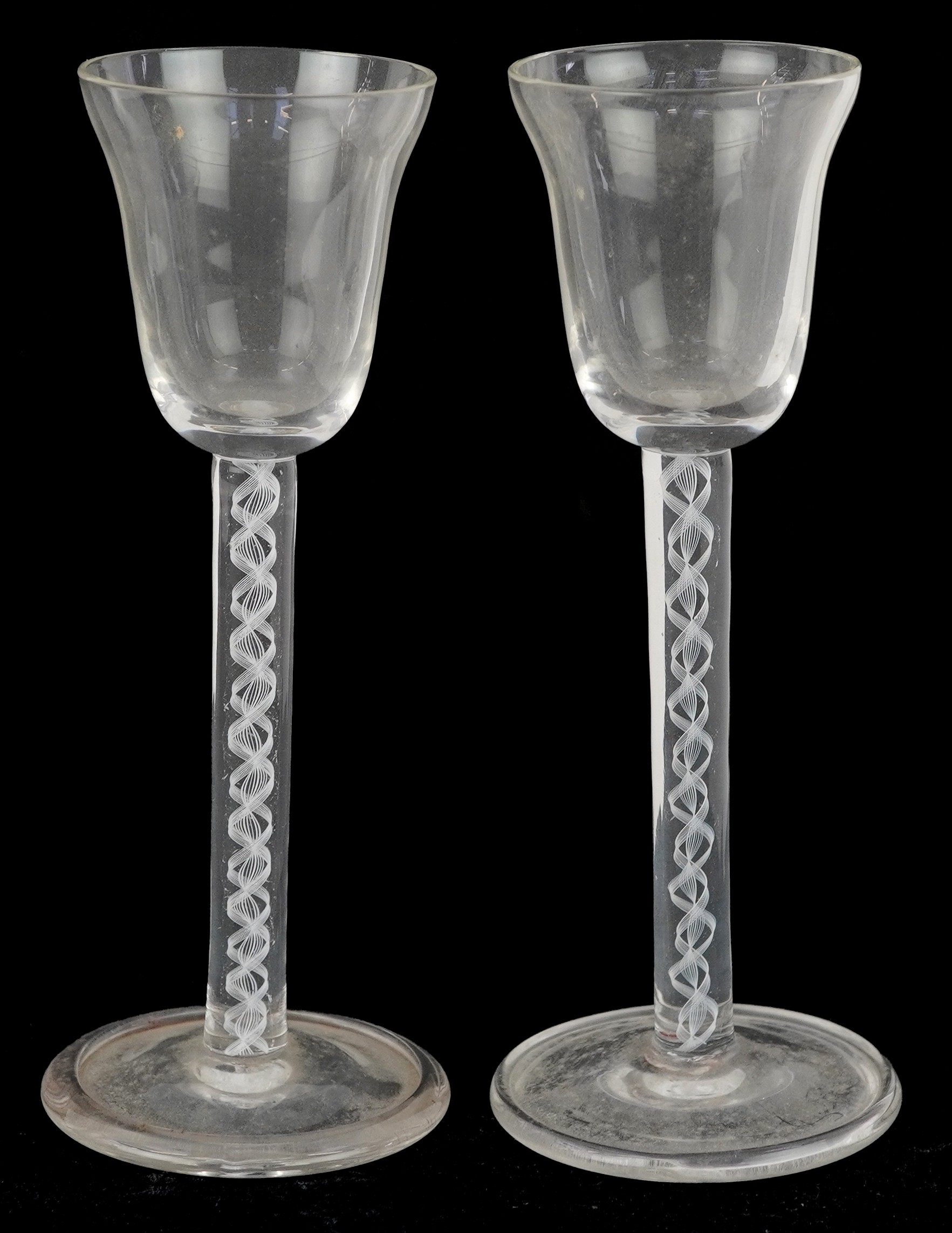 A near pair of 18th century air twist stem glasses, each 14.5cm high.