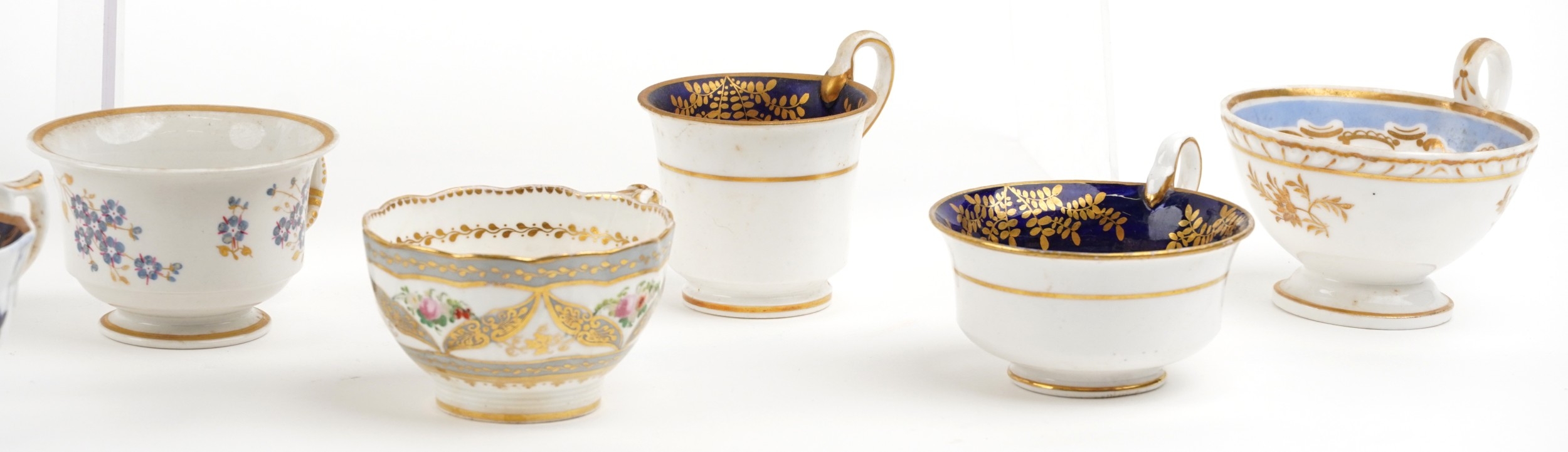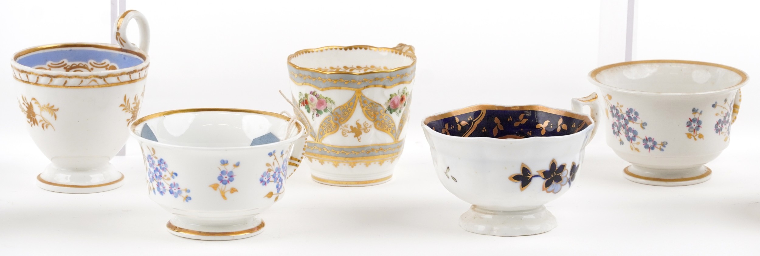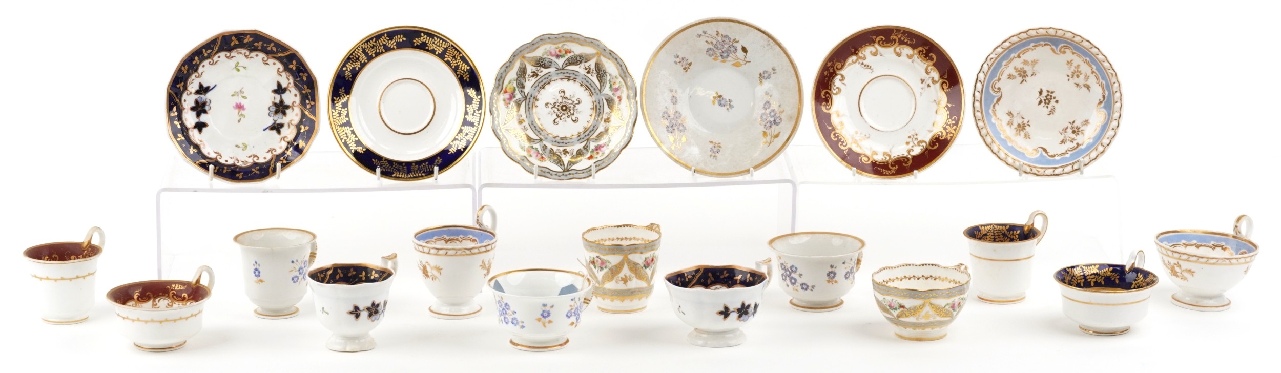 19th century English porcelain tea cups, coffee cups and saucers including Flight Barr & Barr, each with hand painted floral decoration, the largest saucer 16cm in diameter.
