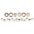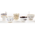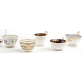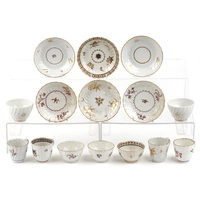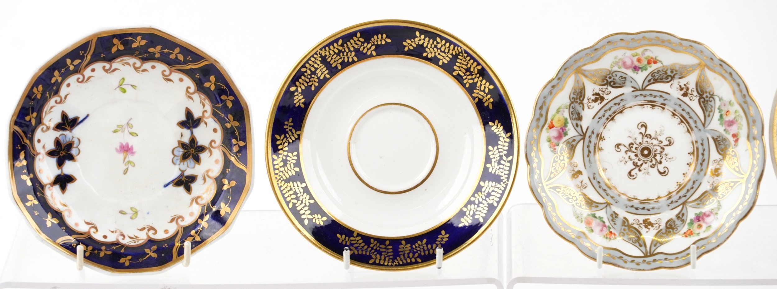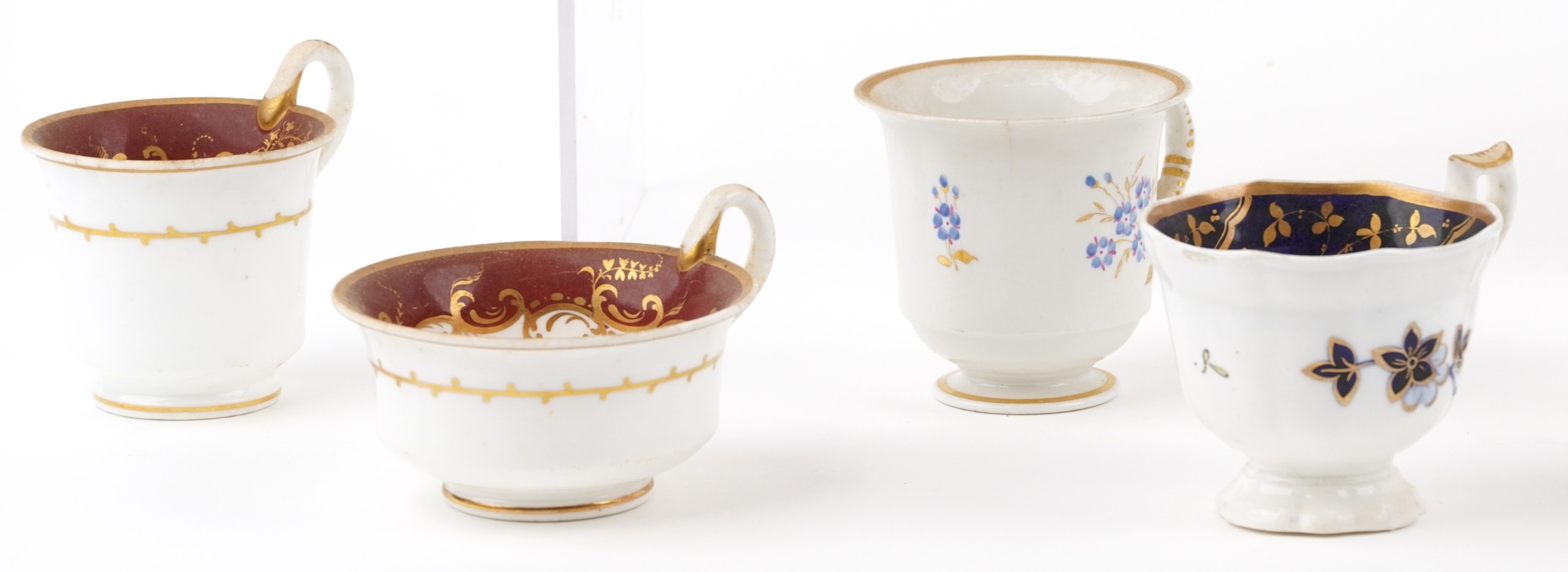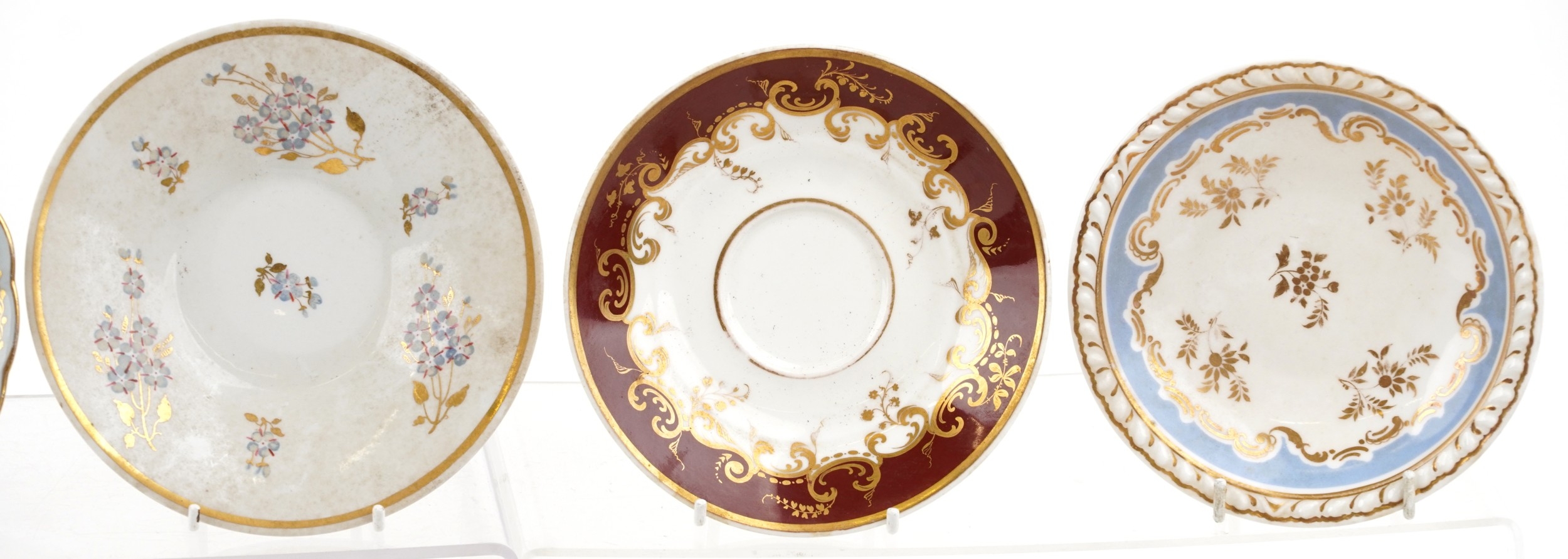 19th century English porcelain tea cups, coffee cups and saucers including Flight Barr & Barr, each with hand painted floral decoration, the largest saucer 16cm in diameter.
