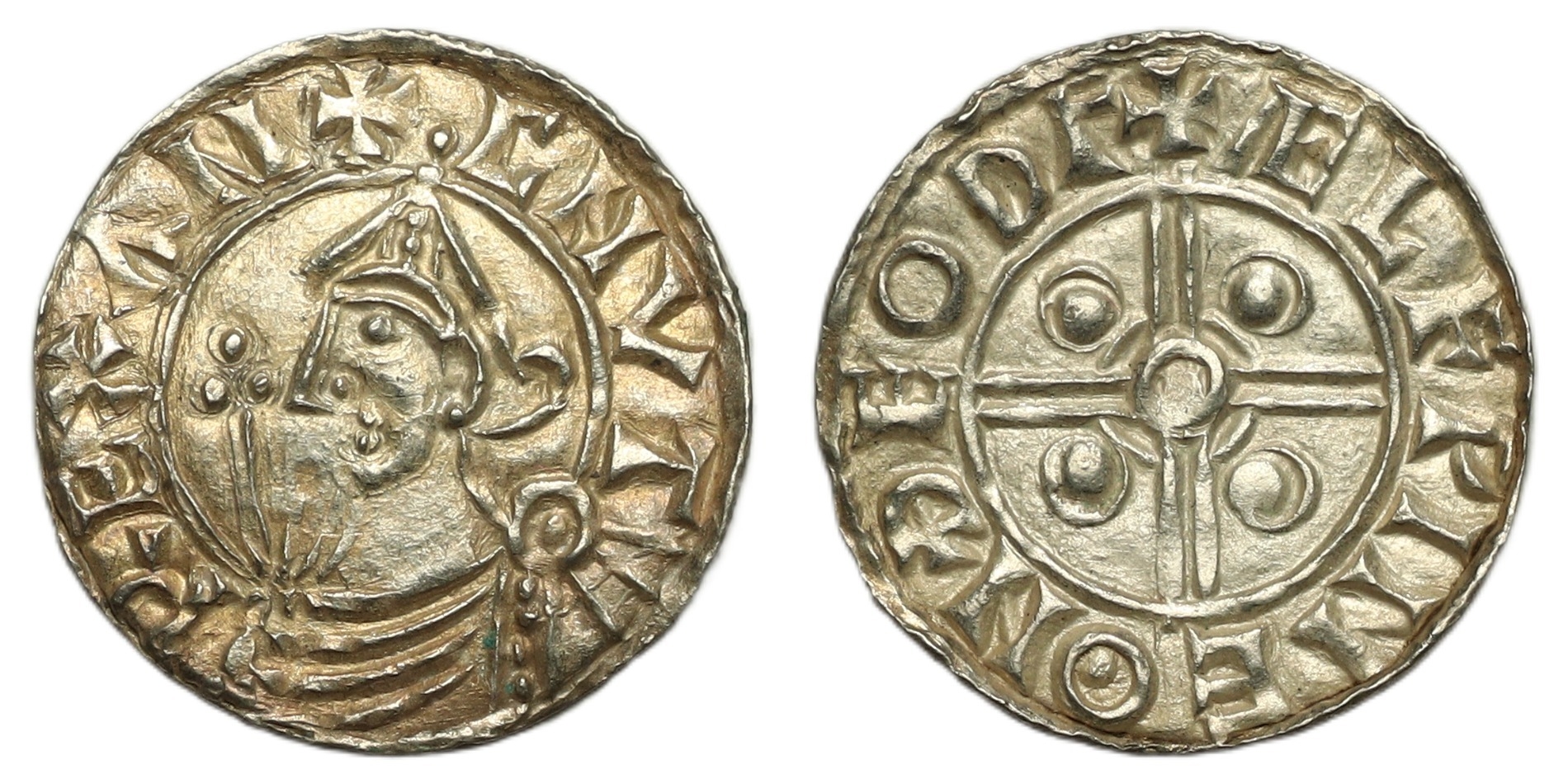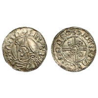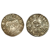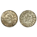 Cnut (1016-1035) Penny, pointed helmet type Thetford, moneyer Ælfwine, helmeted bust left holding sceptre, +.CNVT REX ΛN, rev. short voided cross, pellets in broken annulets in quarters, ÆLFPINE ON ÐEODF, 0.99g, (SCBC 1158, N.787). About as struck
