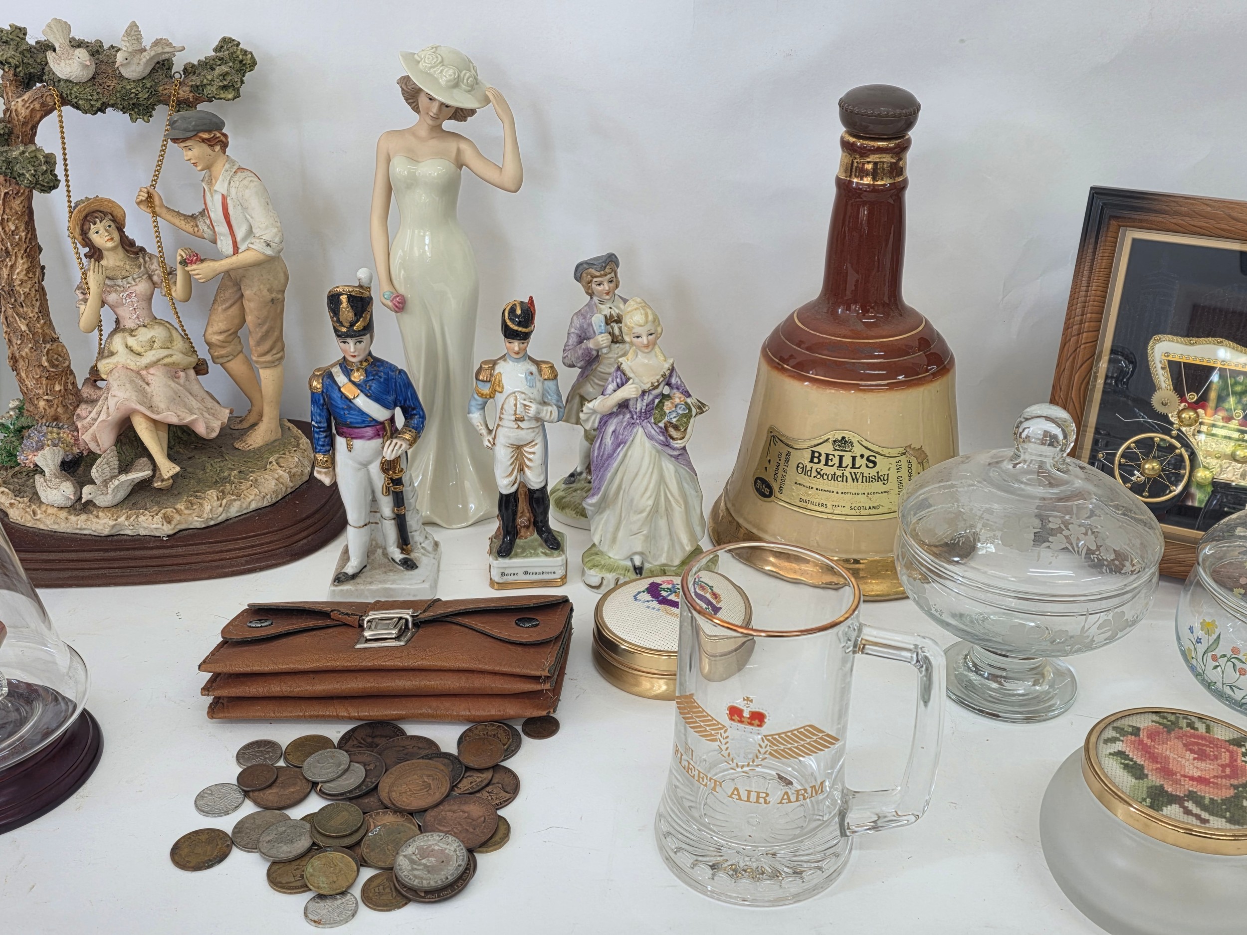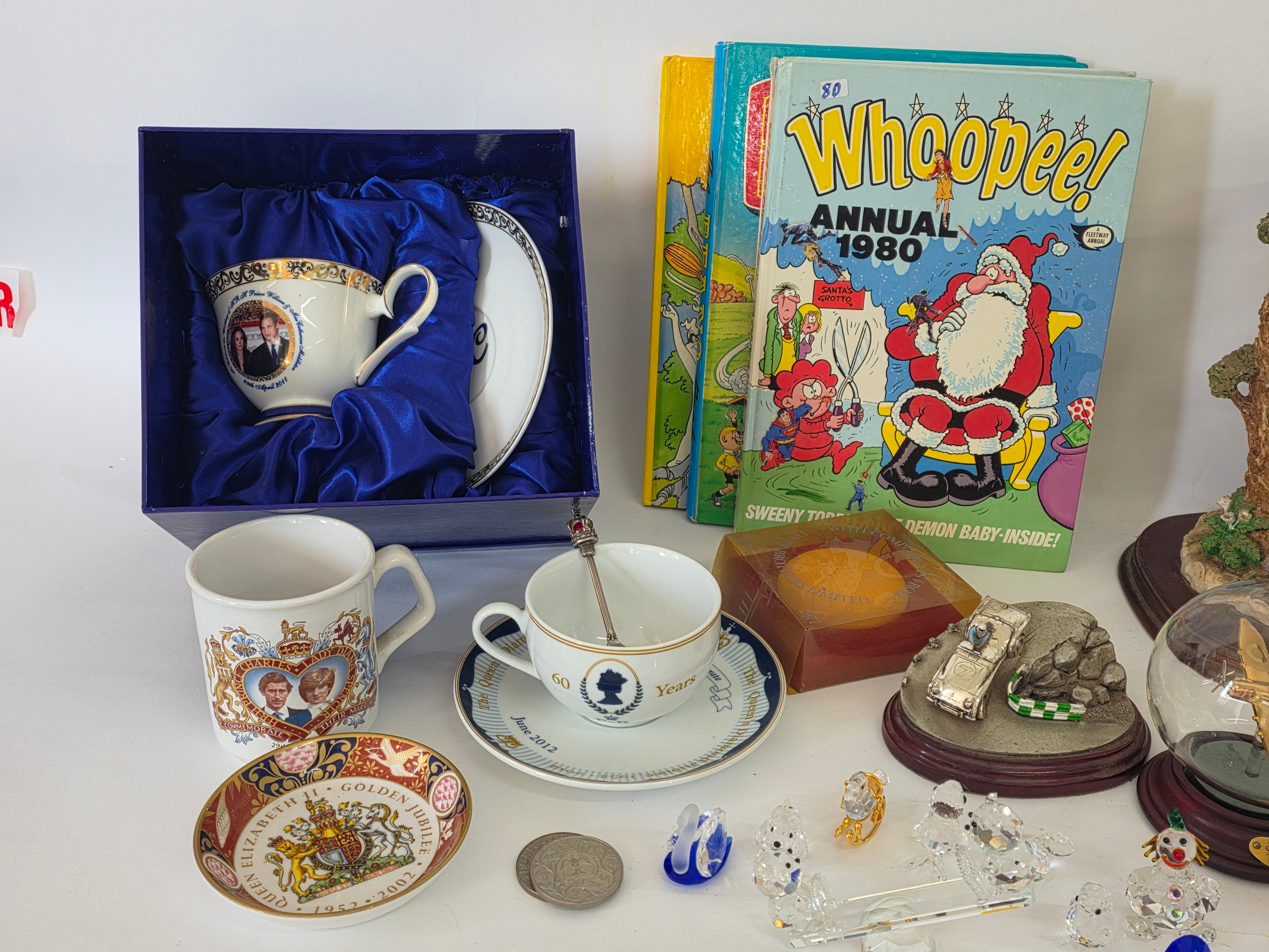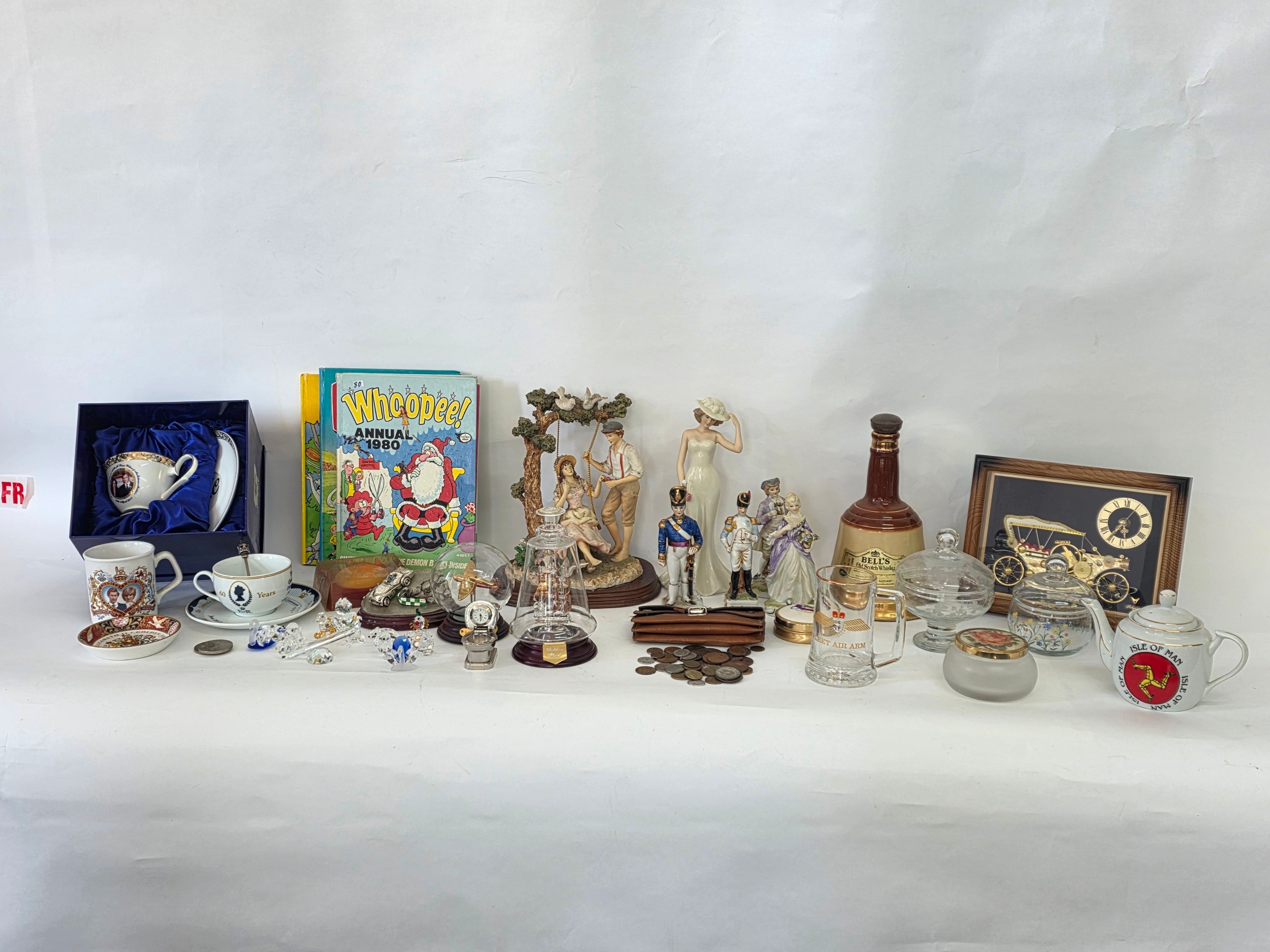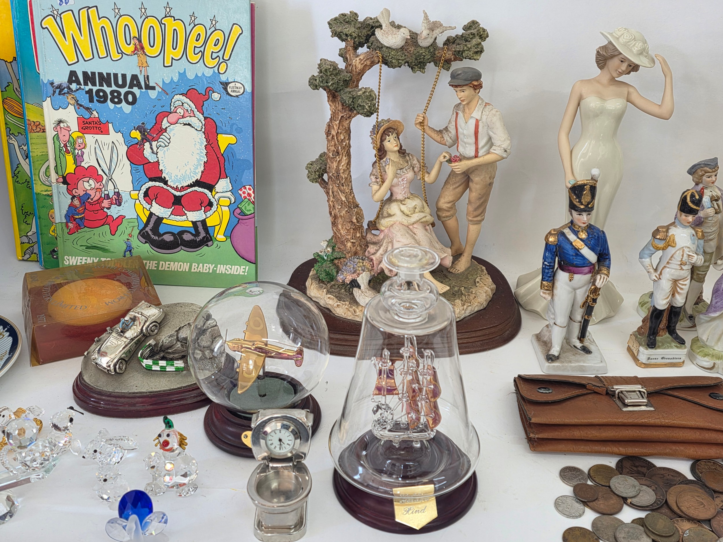 A good mixed lot of collectables to include Swarovski crystals, a clock depciting sa Rolls Royce, Glass BonBon jars, a vintage purse full of coins, a ship in a bottle, ceramic figurines, annuals, Royalty commemoratives and more