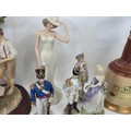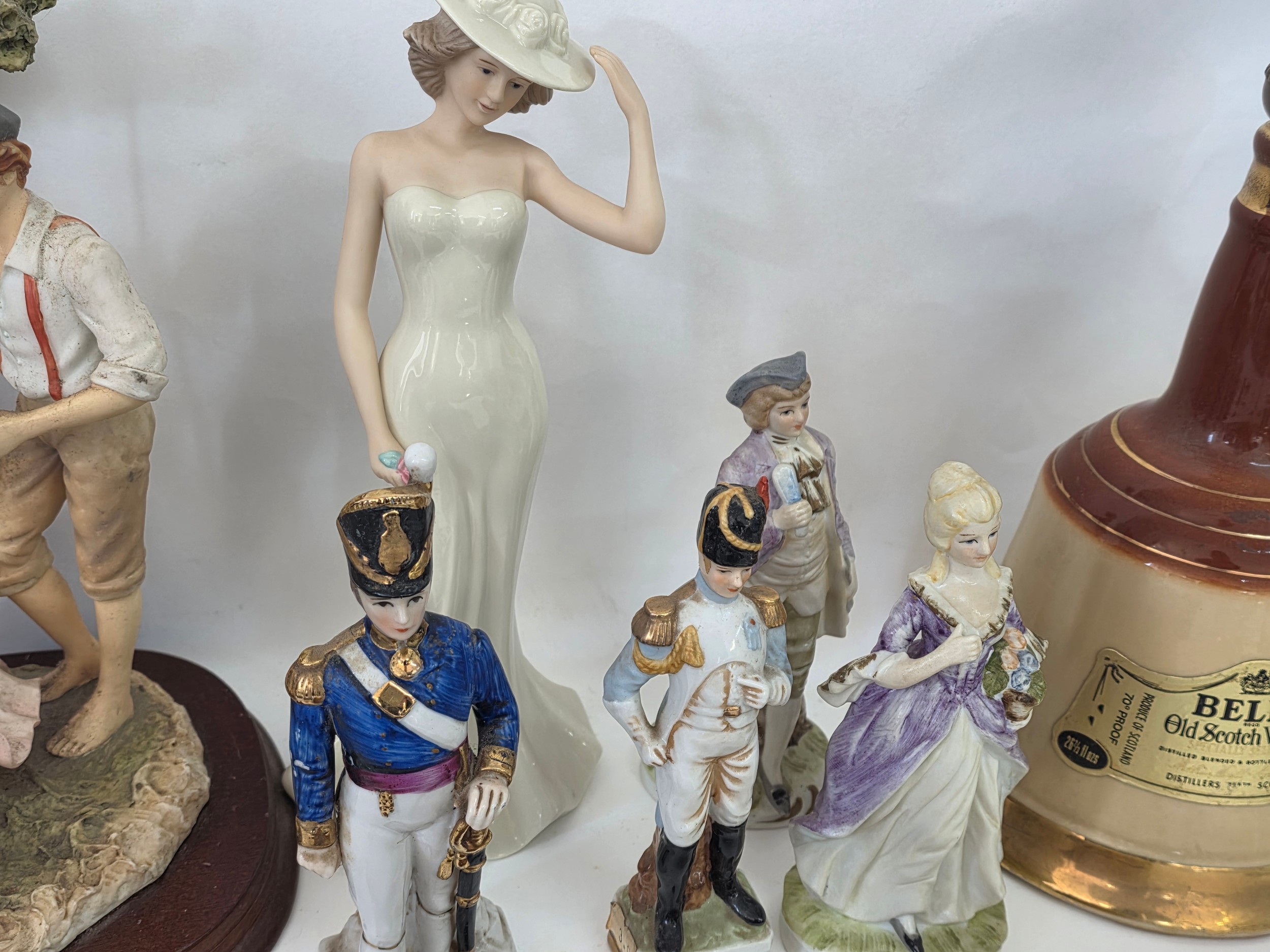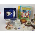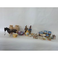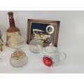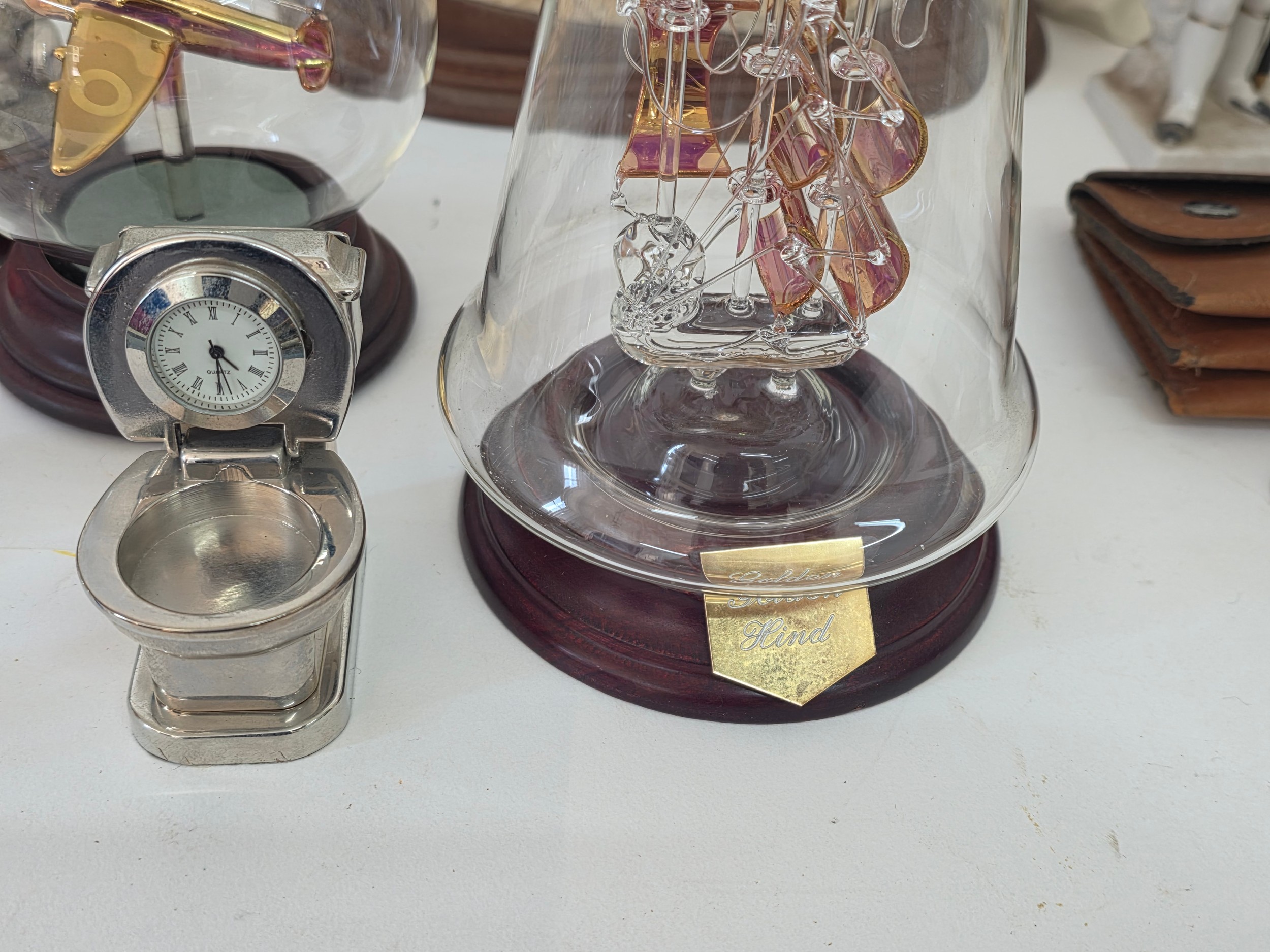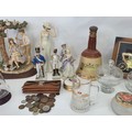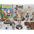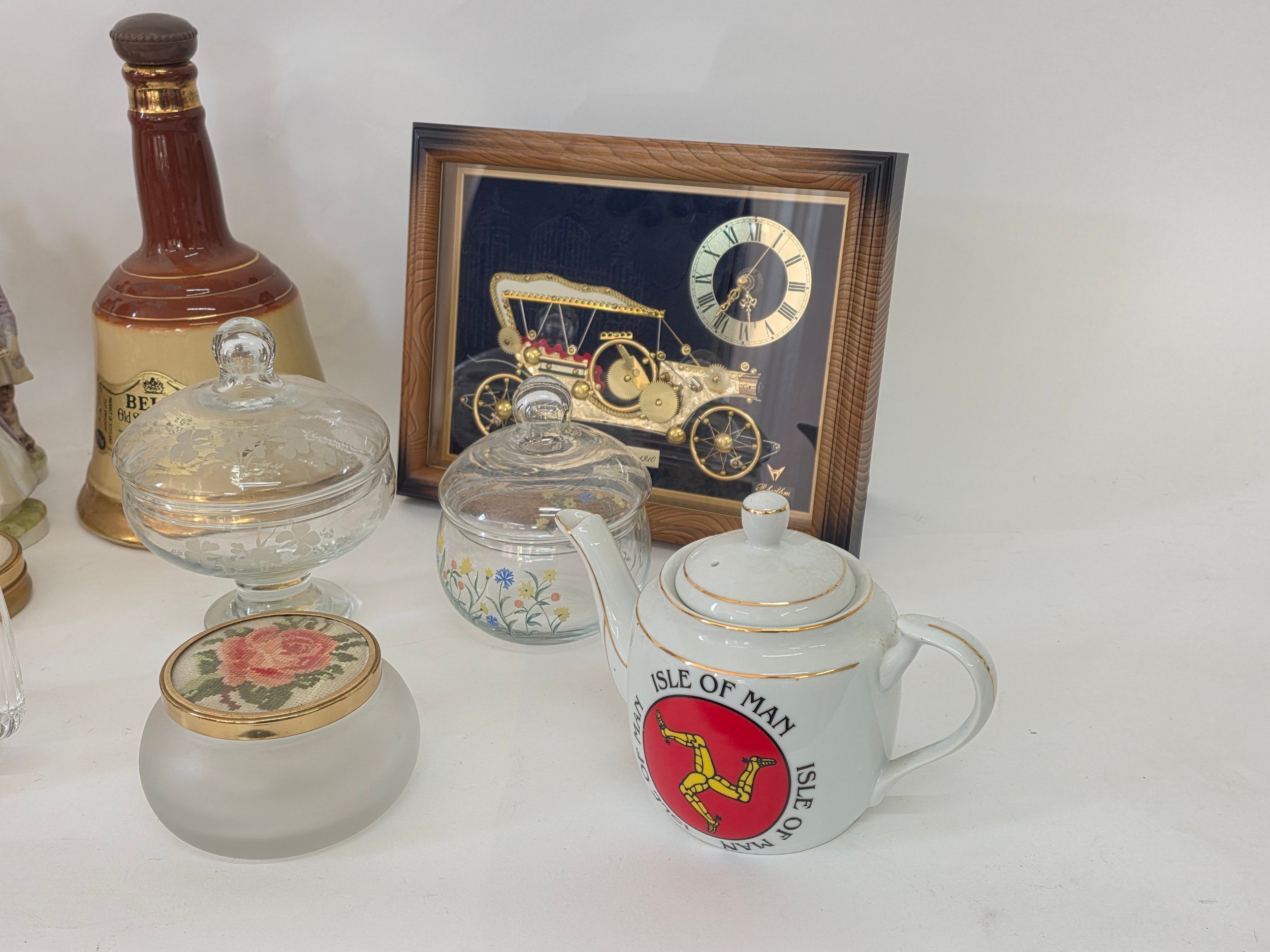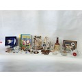 A good mixed lot of collectables to include Swarovski crystals, a clock depciting sa Rolls Royce, Glass BonBon jars, a vintage purse full of coins, a ship in a bottle, ceramic figurines, annuals, Royalty commemoratives and more