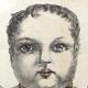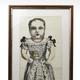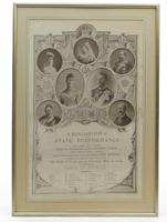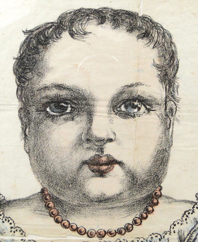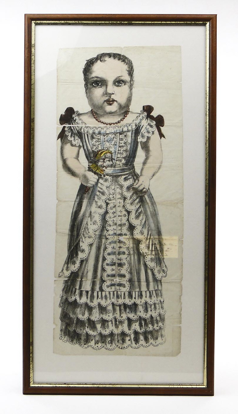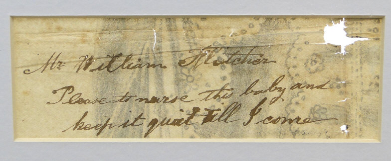Early 19th century hand coloured lithograph of a child clutching a Punch rattle, with printed love letter to the reverse, framed, 62cm x 28cm