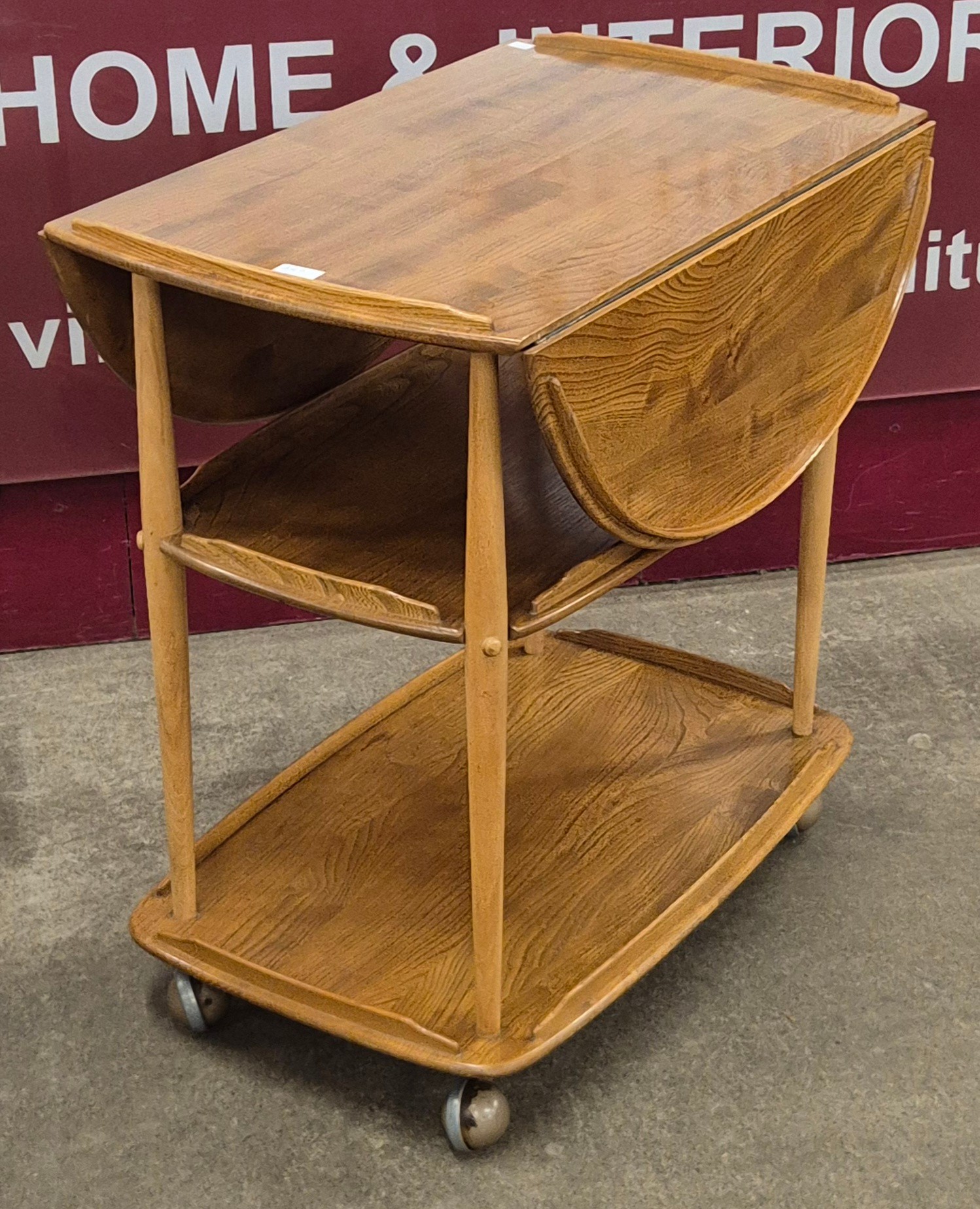 An Ercol Blonde elm and beech 505 model three tier drop-leaf trolley