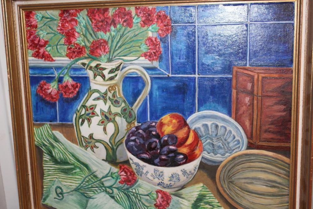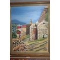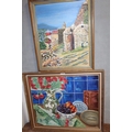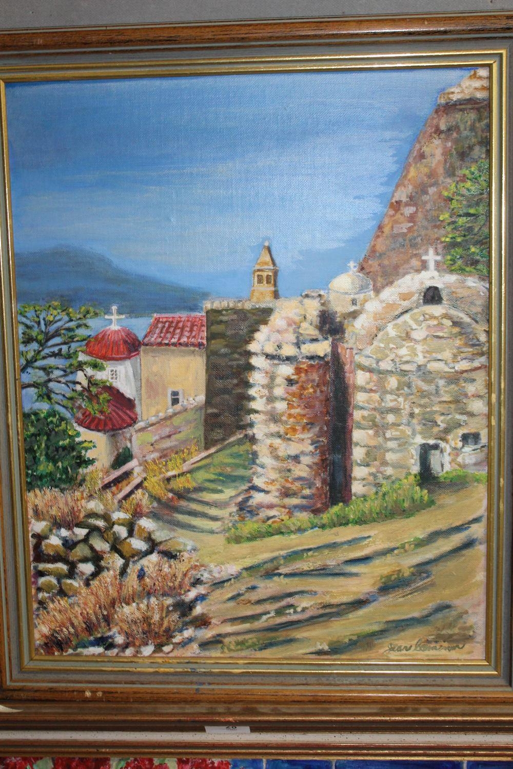 TWO GILT FRAMED OIL ON BOARDS DEPICTING A TABLE TOP STILL LIFE STUDY AND A CONTINENTAL VIEW SCENE BY JEAN CAMERON