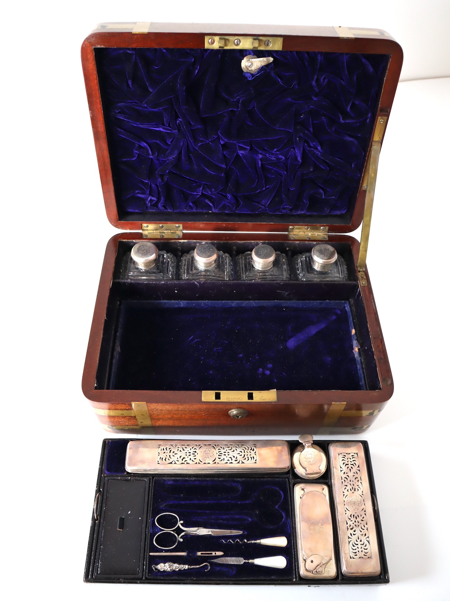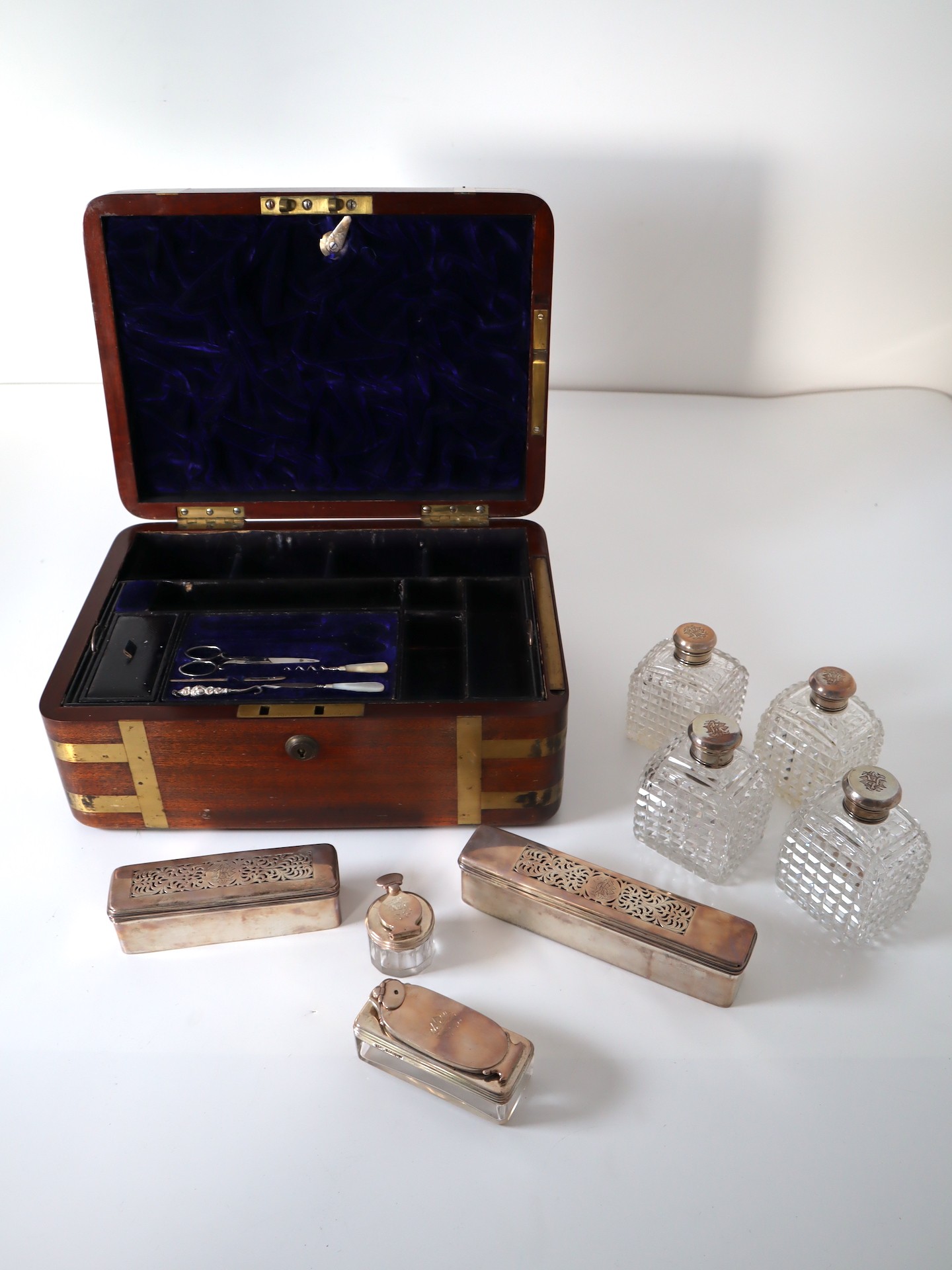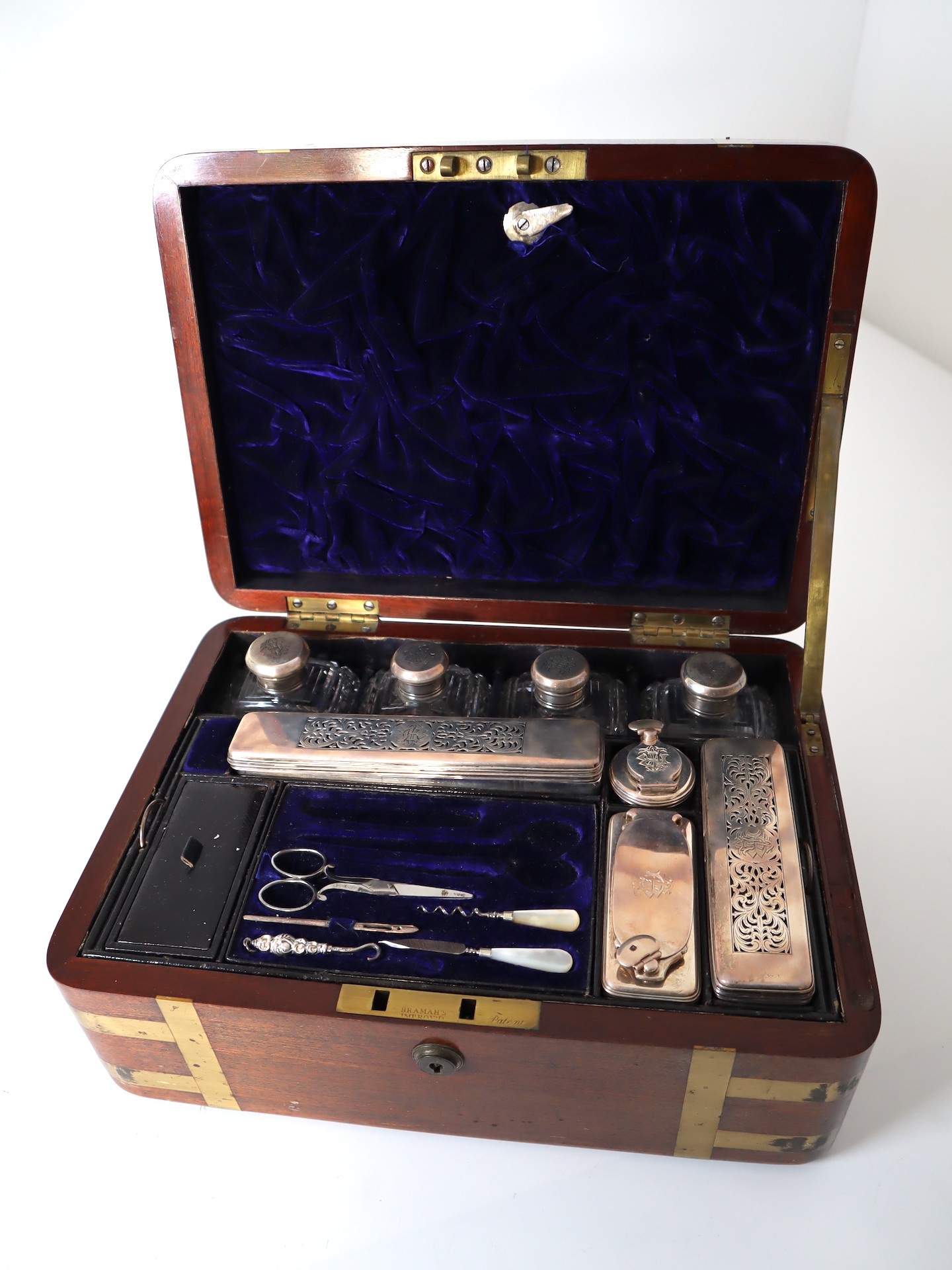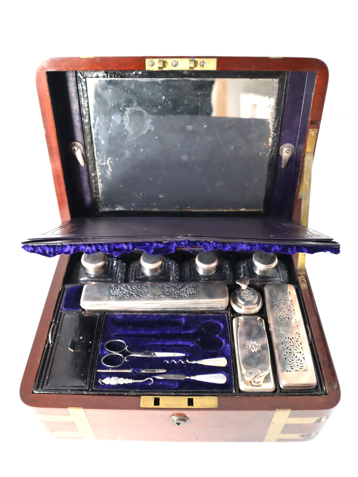 Stunning Georgian Oak & Brass banded vanity / dressing box with dark-blue Moroccan leather lined interior with lift-out trays and storage compartments. Interior to lid lined in dark-blue velvet with swivel catch which opens to reveal a mirror. Sterling Silver bottle tops and compartments - London John & Archibald Douglas c1824-25, Bramah Lock no Key, flush brass handles