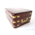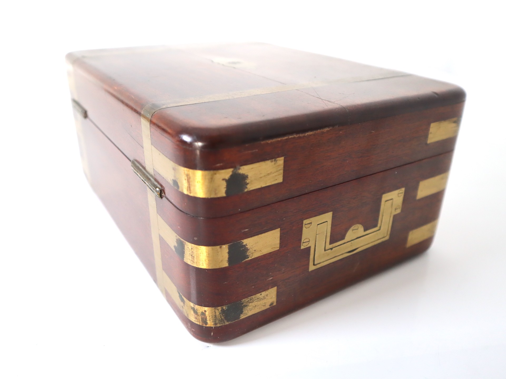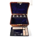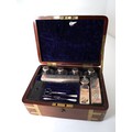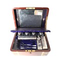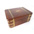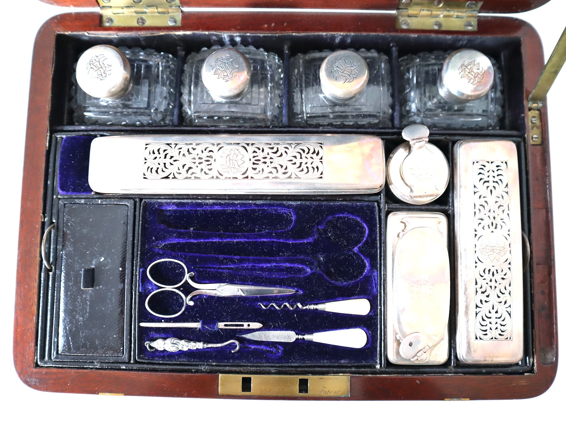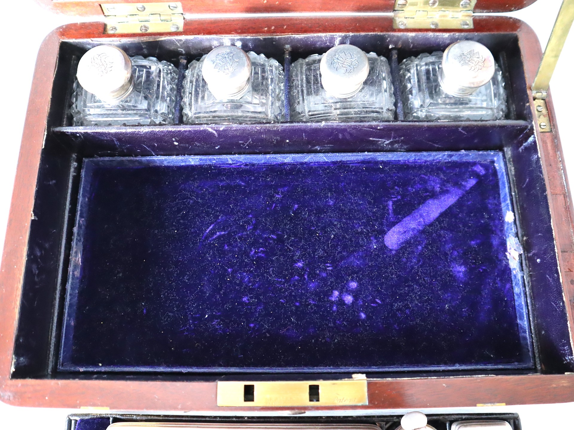 Stunning Georgian Oak & Brass banded vanity / dressing box with dark-blue Moroccan leather lined interior with lift-out trays and storage compartments. Interior to lid lined in dark-blue velvet with swivel catch which opens to reveal a mirror. Sterling Silver bottle tops and compartments - London John & Archibald Douglas c1824-25, Bramah Lock no Key, flush brass handles