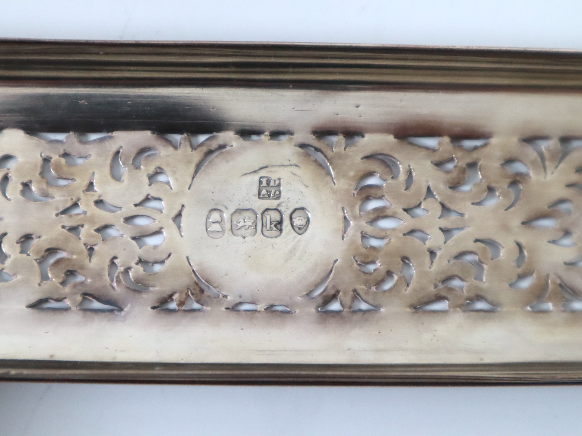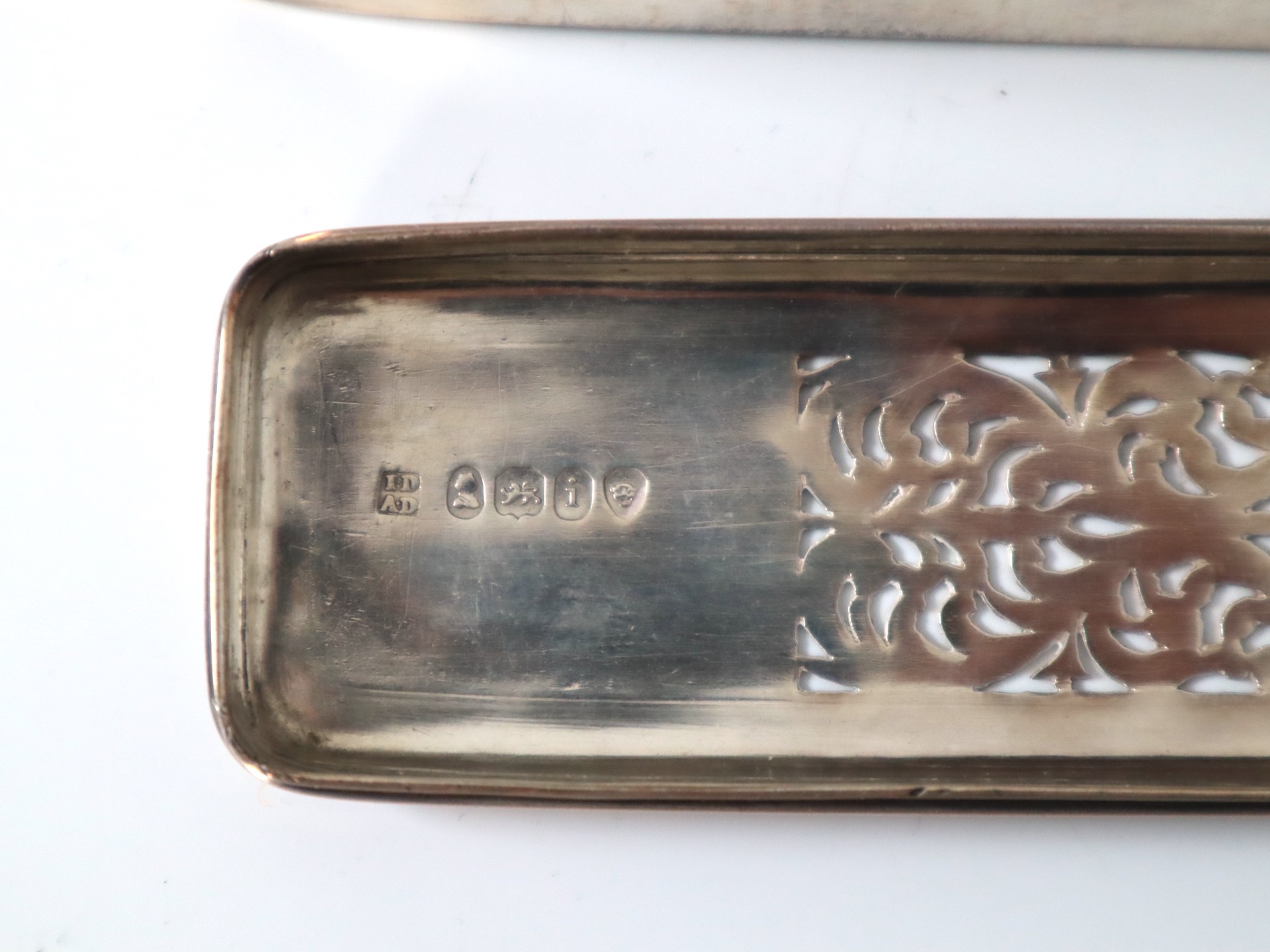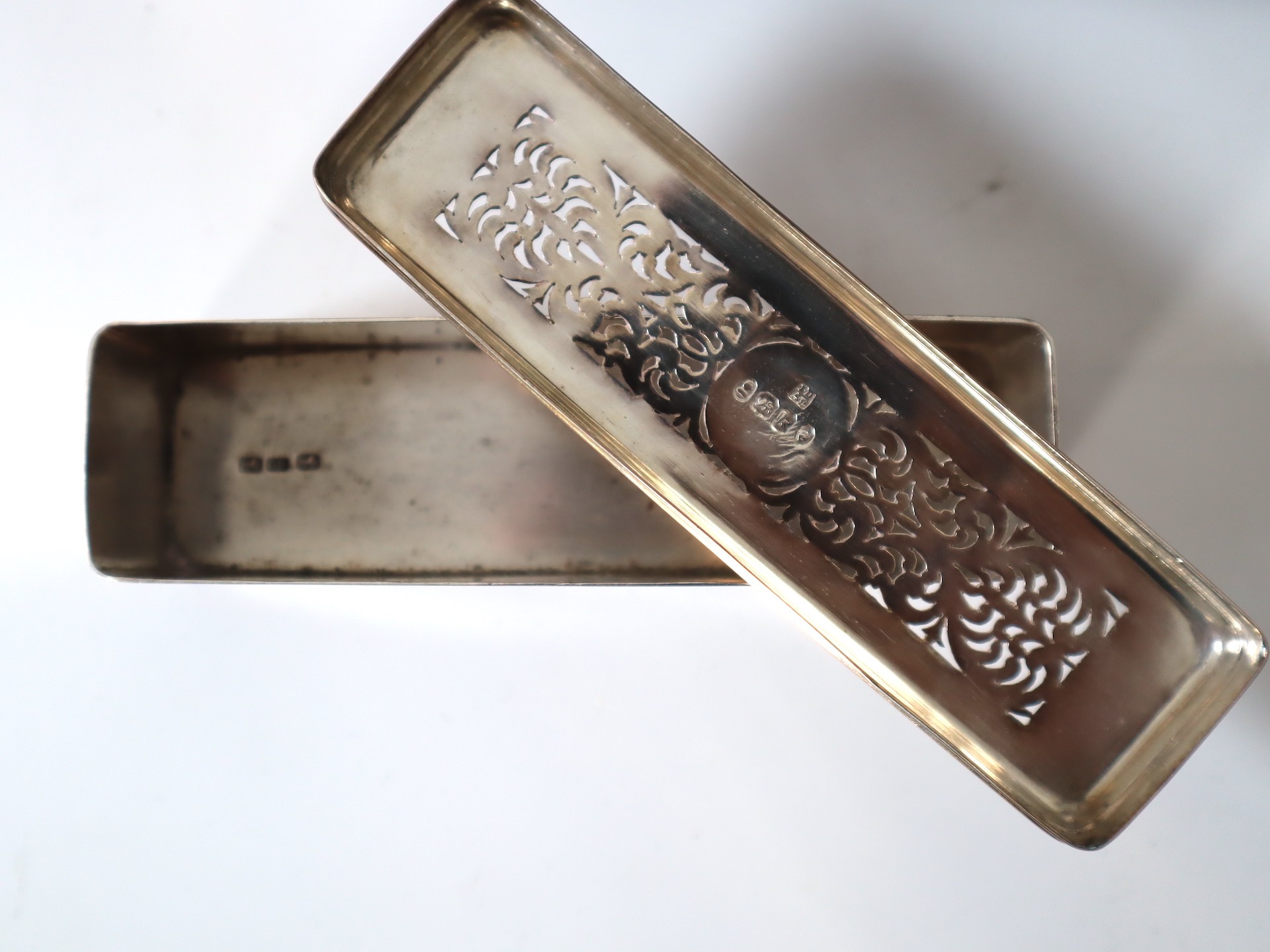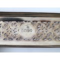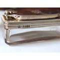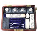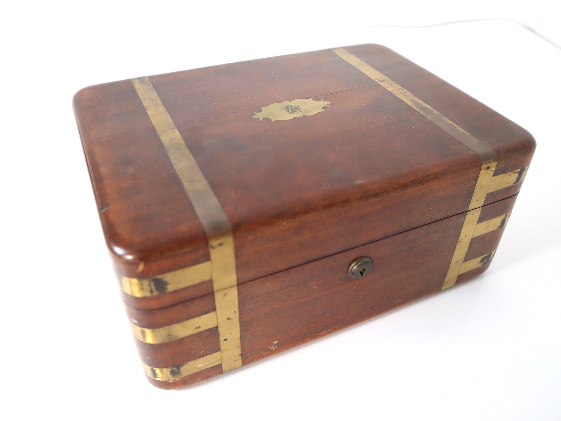 Stunning Georgian Oak & Brass banded vanity / dressing box with dark-blue Moroccan leather lined interior with lift-out trays and storage compartments. Interior to lid lined in dark-blue velvet with swivel catch which opens to reveal a mirror. Sterling Silver bottle tops and compartments - London John & Archibald Douglas c1824-25, Bramah Lock no Key, flush brass handles