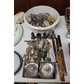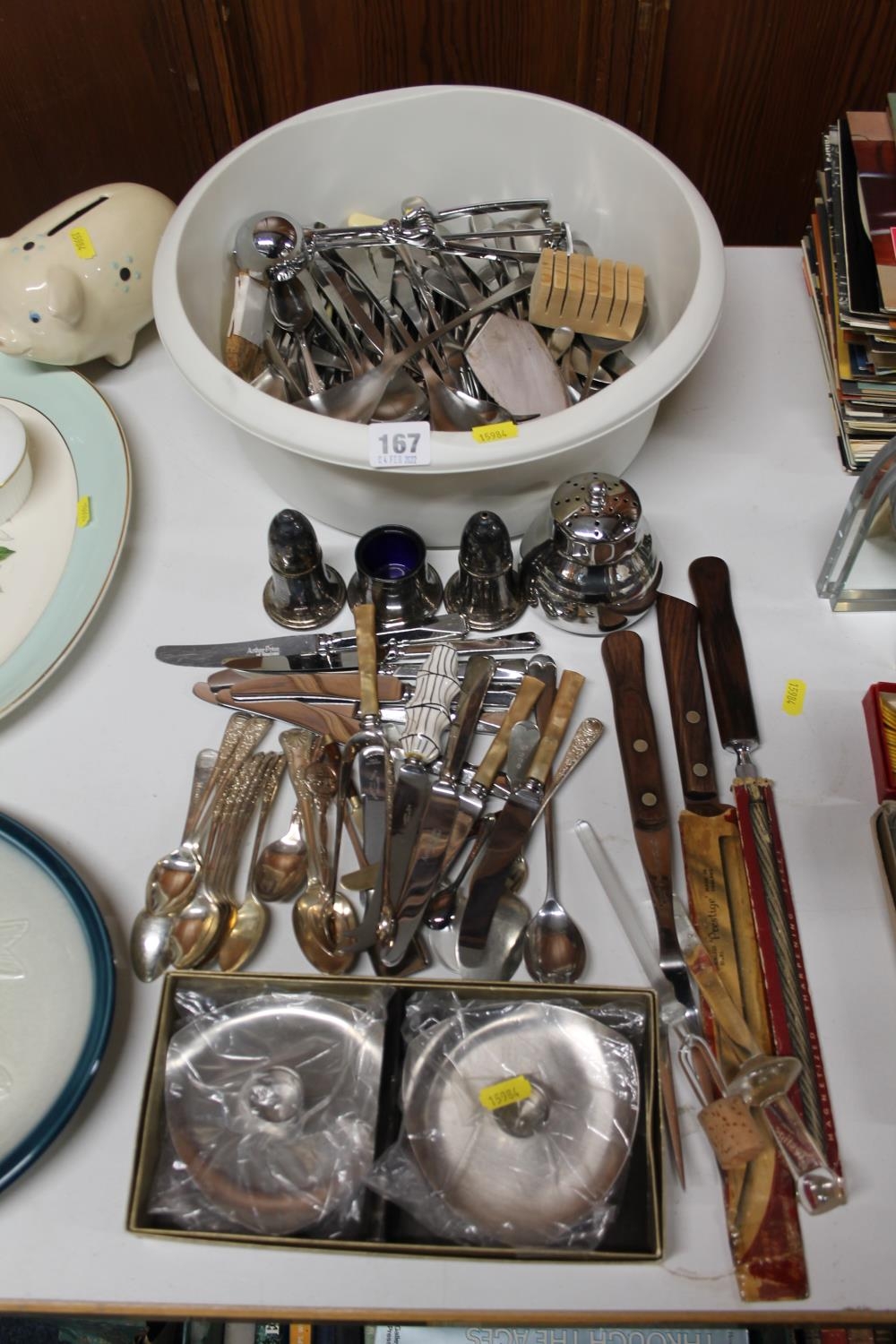 Silver-plated flatware, condiments, a pair of Arthur Price candlesticks, etc.