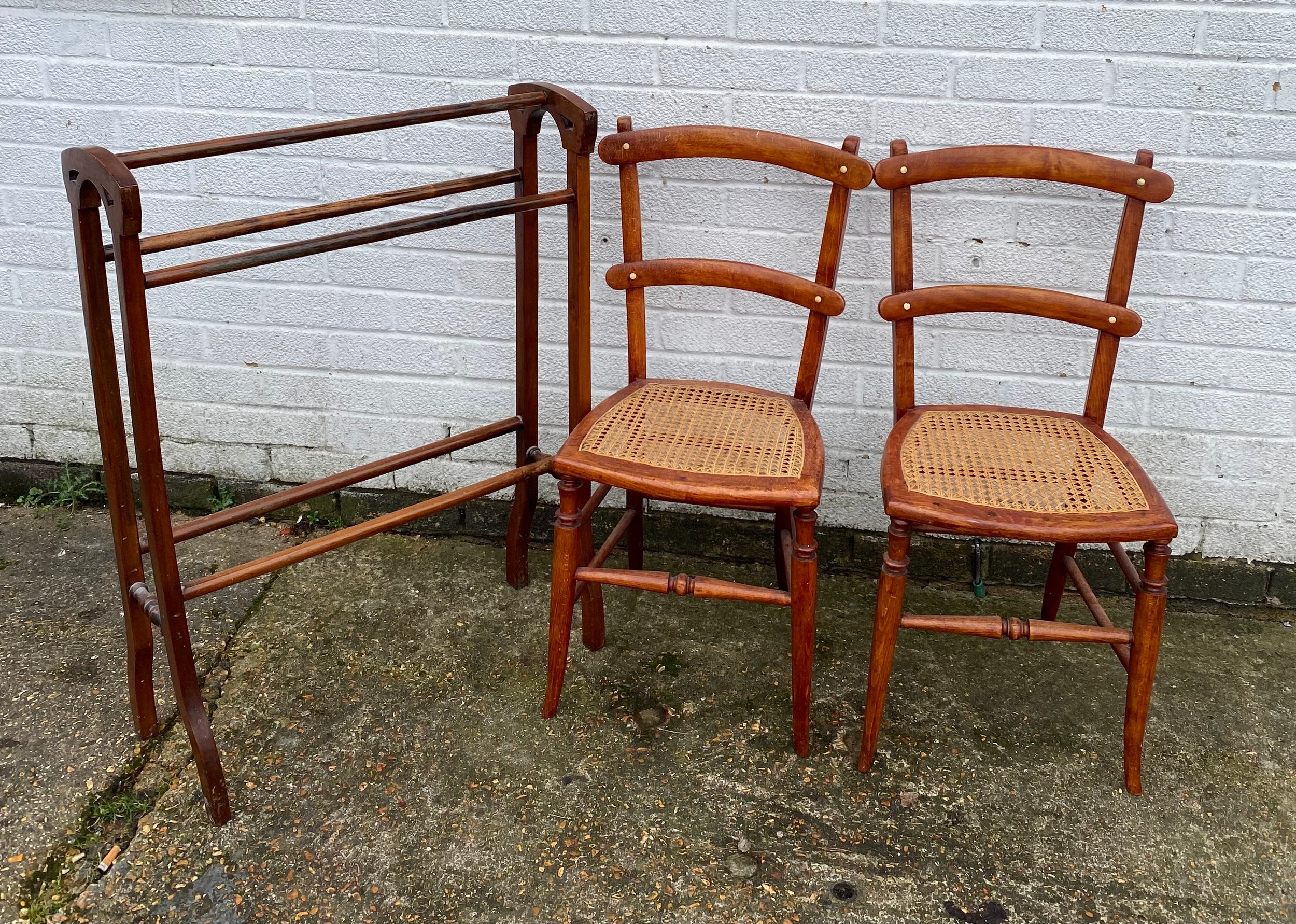 A pair of cane seated chairs, together with a towel rail -