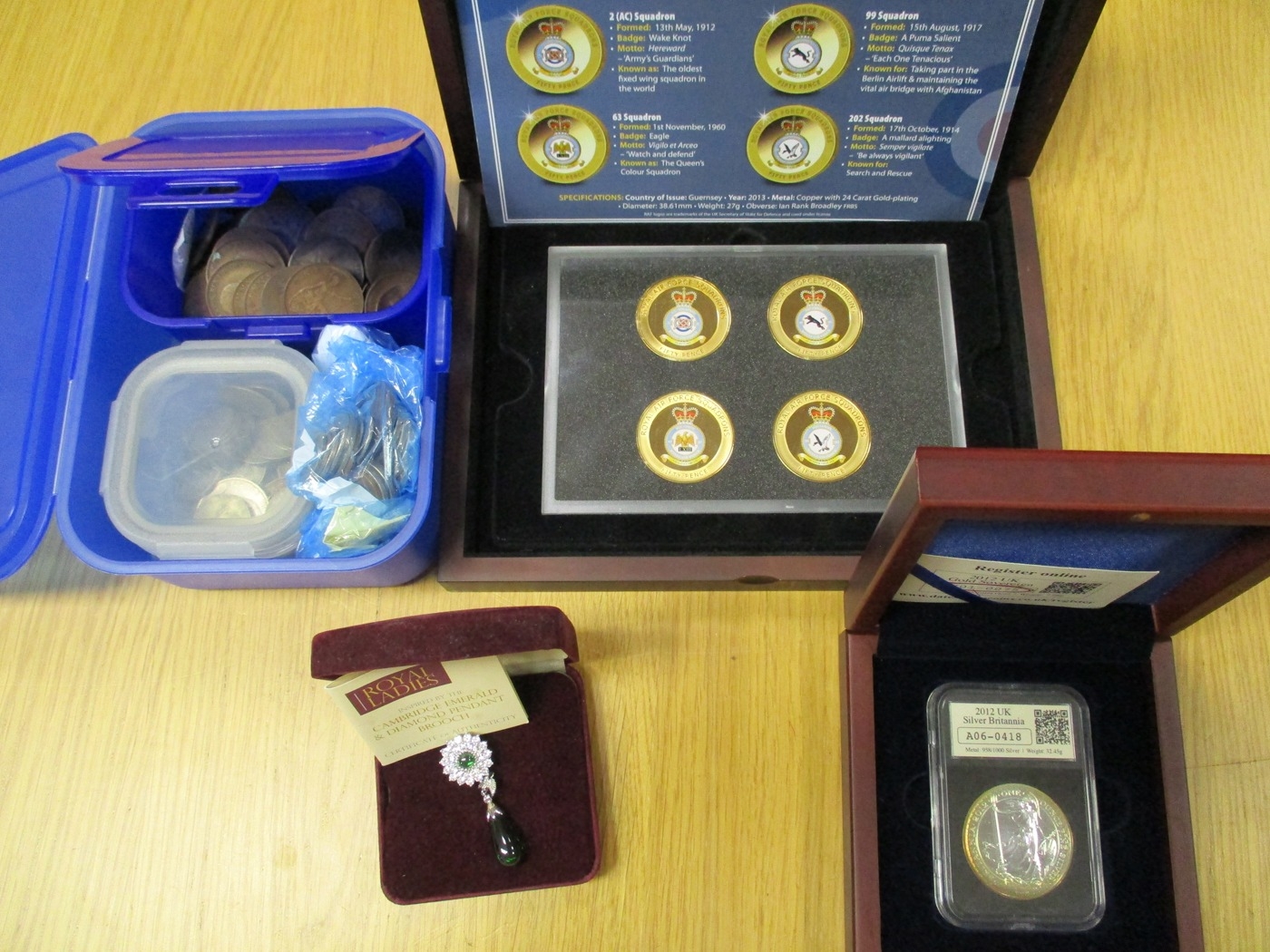 Collection of silver proofs with £5 including Guernsey 2012, 2013, Jersey 2014, Cook Is 2012 $5 FDC, silver GB £2 2012, 2013 plus Guernsey 2013 copper 50p cased set of 4, emerald and diamond broach and KGV-QEII range. (½B)