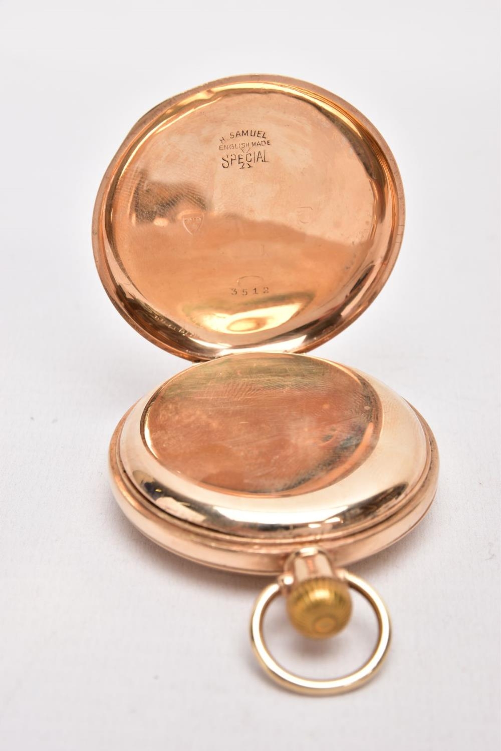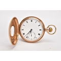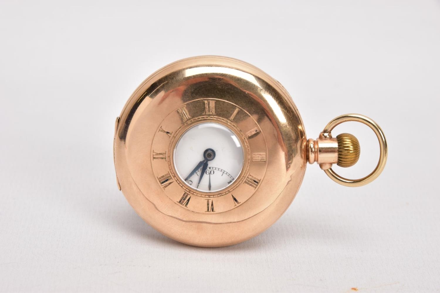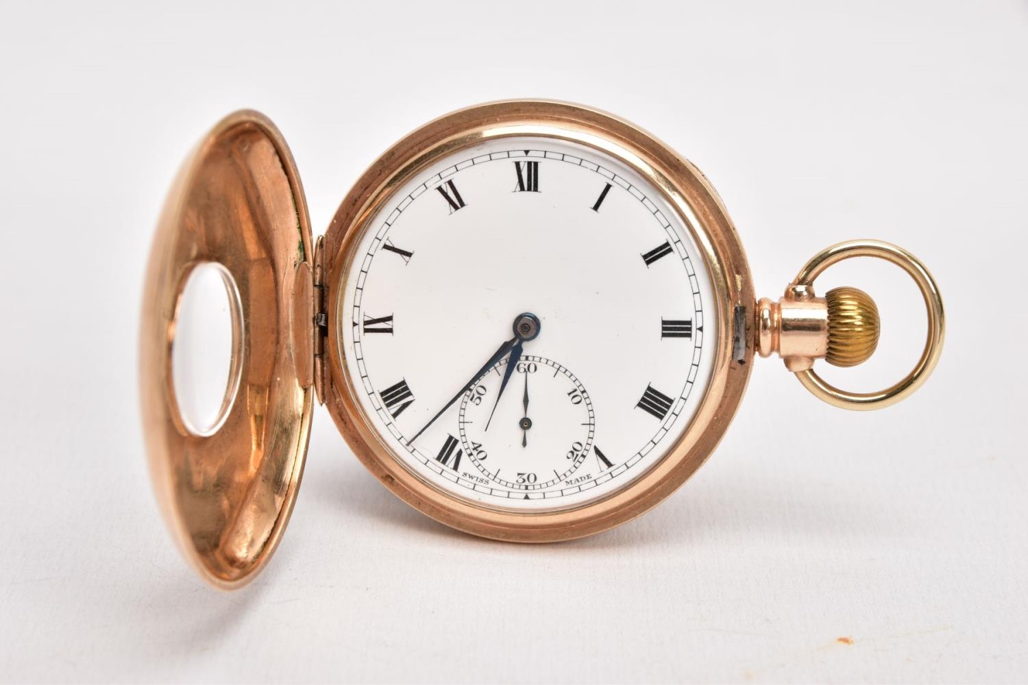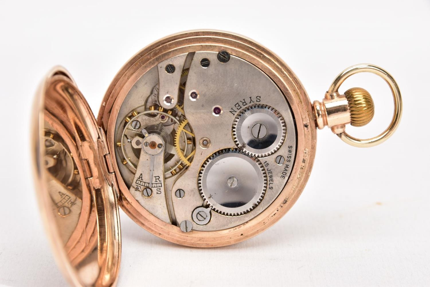 A 9CT GOLD HALF HUNTER POCKET WATCH, round white dial, Roman numerals, seconds subsidiary dial at the six o'clock position, within a plain polished case, outer Roman numeral dial the front of the case (worn black enamel numerals) case back hallmarked 9ct gold Chester 1926, movement signed 'Syren, 15 jewels', approximate case width 44.8mm, approximate gross weight 84.0 grams (condition report: general light wear, winds, sets and runs, time keeping untested)