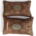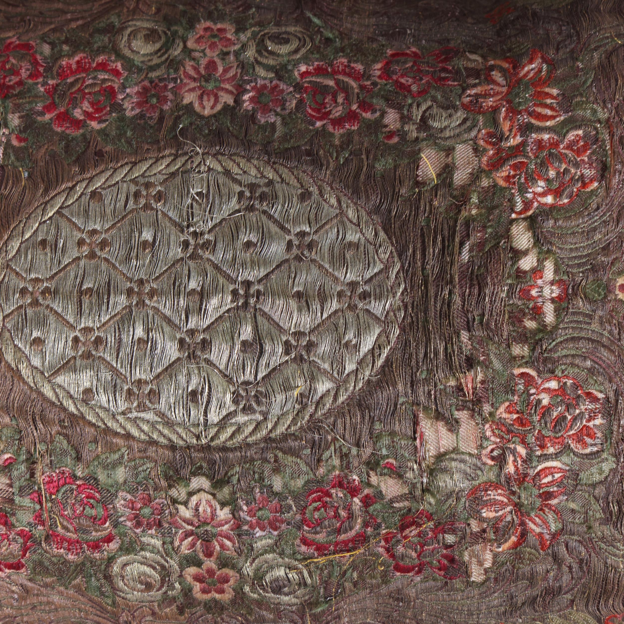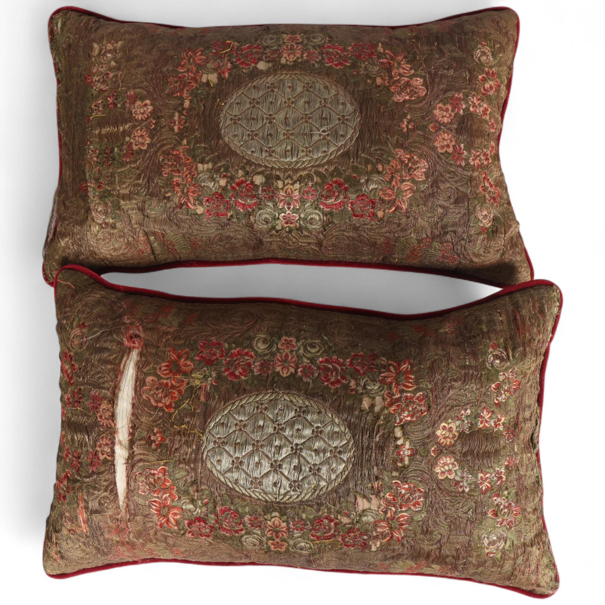 A pair of Georgian Regency silver wire embroidered cushions, 64cm x 37cm, A/F